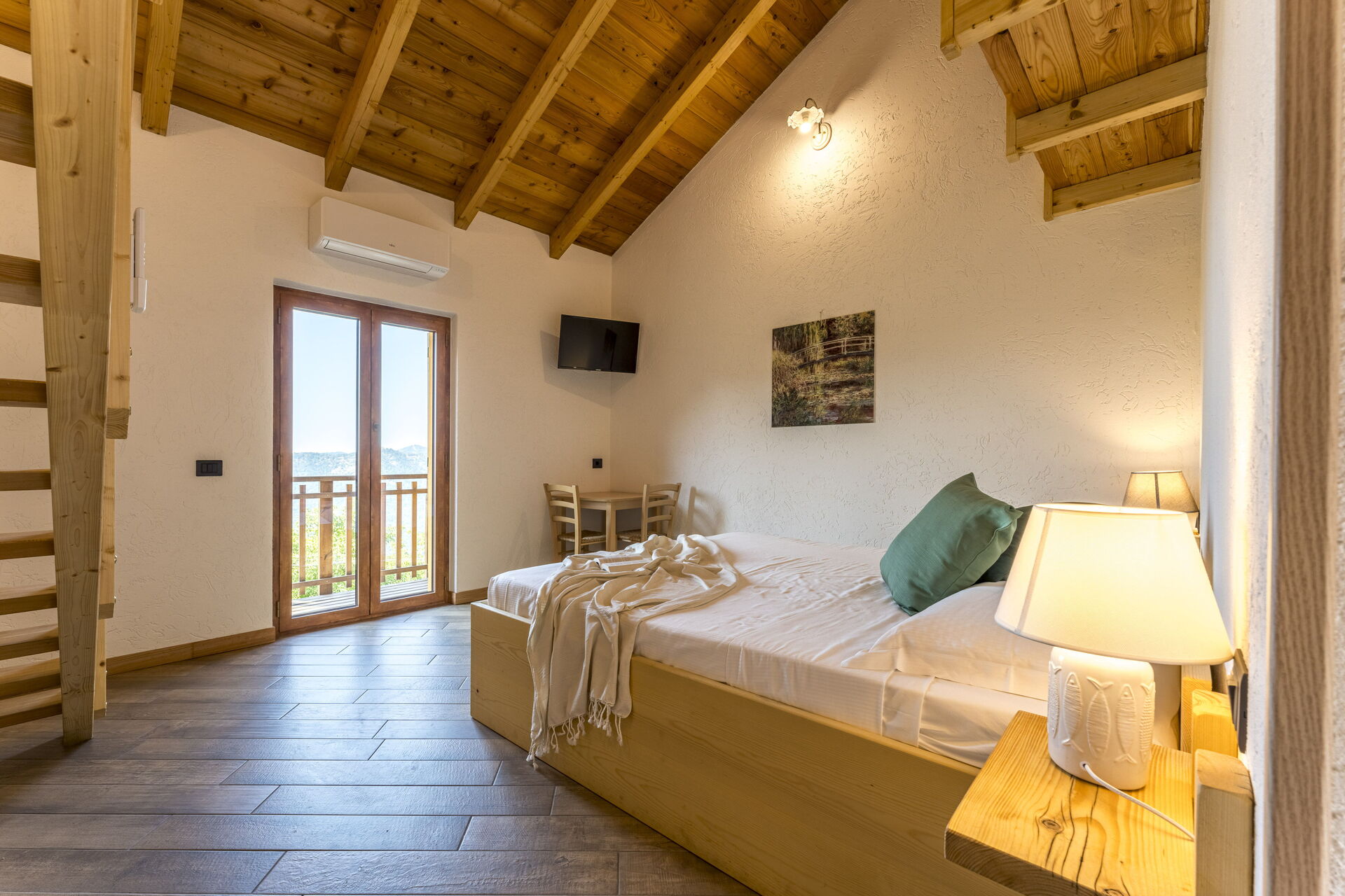 Slaapkamer met badkamer 2: tweepersoonsbed, twee eenpersoonsbedden, WIFI internet, airconditioning, tv, wastafel, toilet , bidet, douche, haardroger, uitgang naar het balkon, vide.