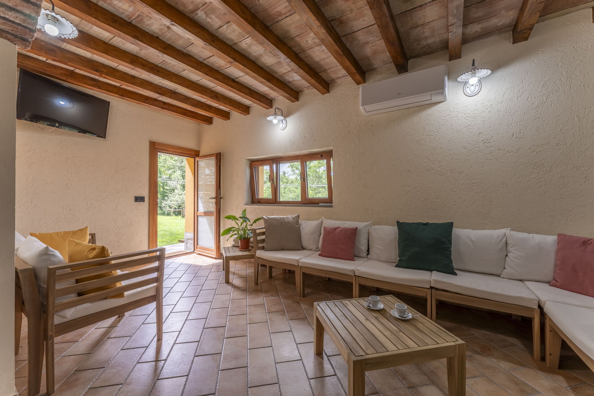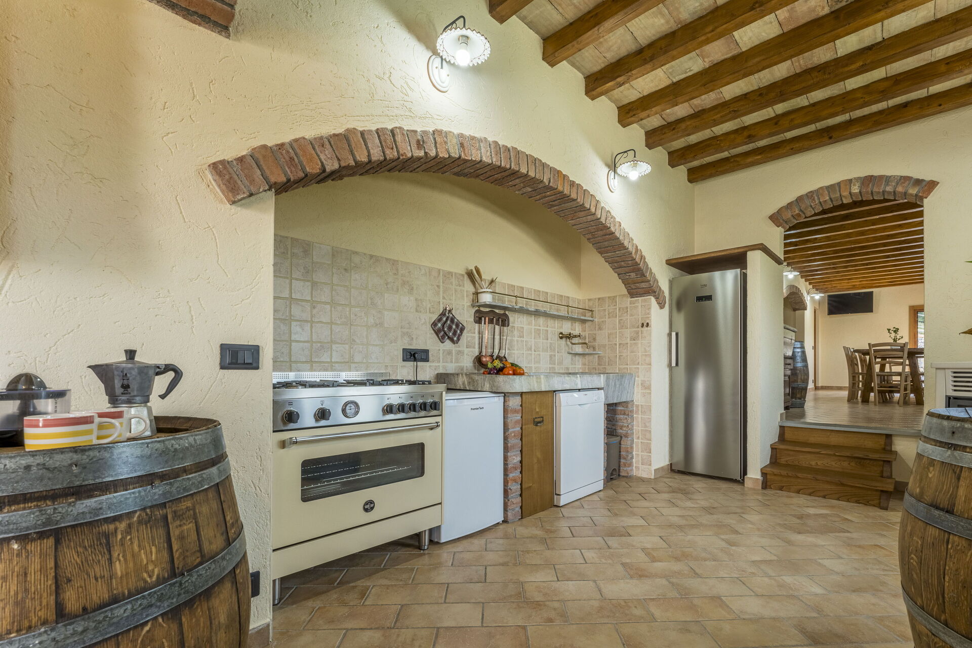 Keuken: goed uitgeruste keuken, eettafel, vaatwasser, ijskast, diepvriezer, magnetron, oven, italiaans koffiezetapparaat, koffiezetapparaat, WIFI internet, airconditioning, kinderstoel, uitgang naar de tuin.
