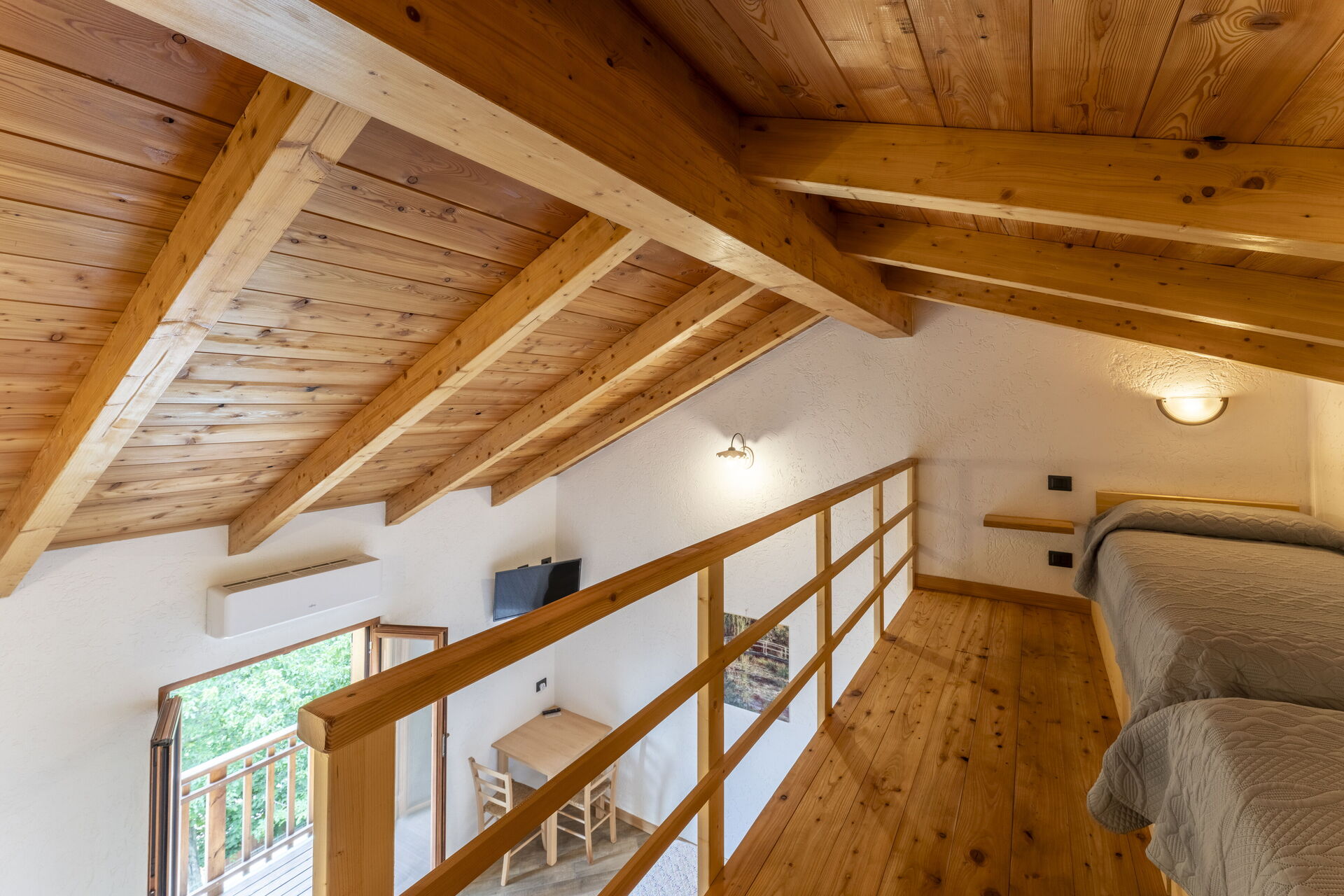 Slaapkamer met badkamer 4: tweepersoonsbed, twee eenpersoonsbedden, WIFI internet, airconditioning, tv, wastafel, toilet , bidet, douche, haardroger, uitgang naar het balkon, vide.