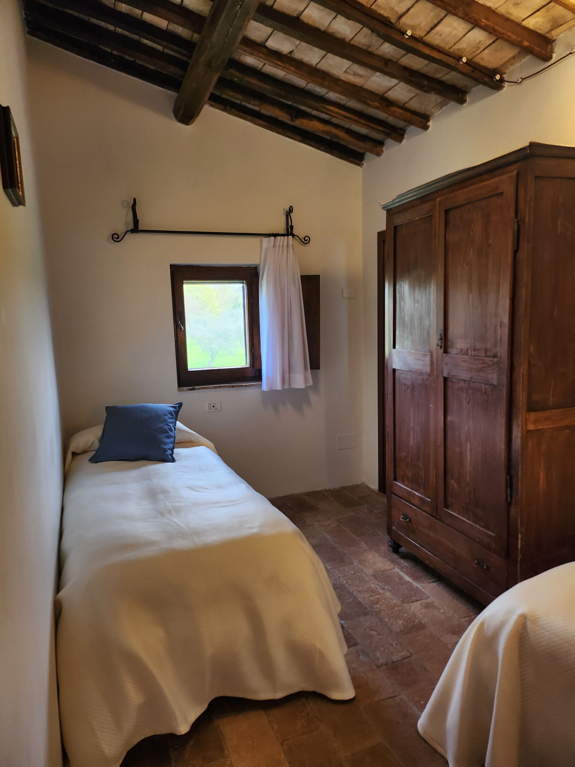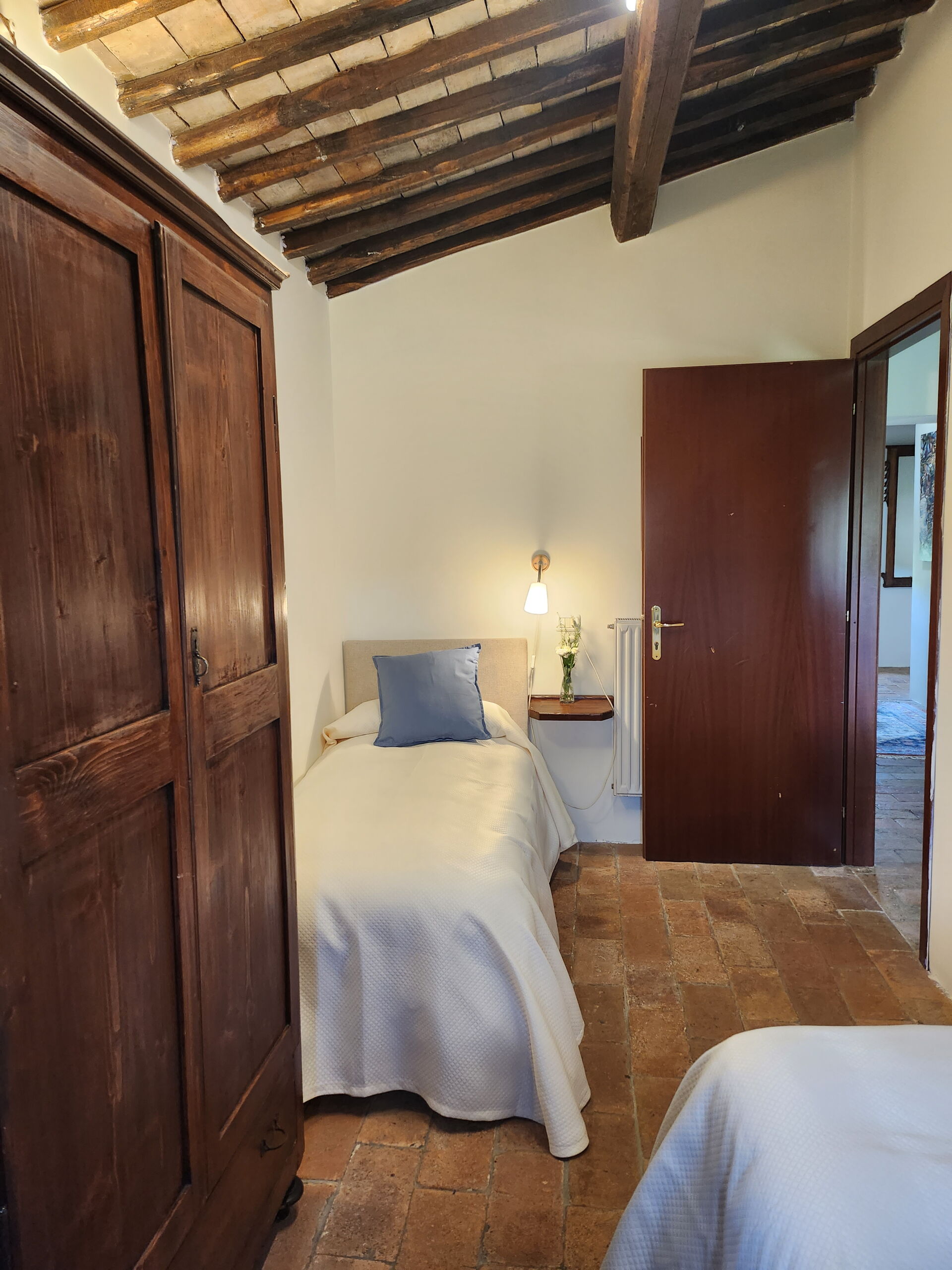 Slaapkamer met badkamer 2: eenpersoonsbed, WIFI internet, wastafel, toilet , bidet, douche.