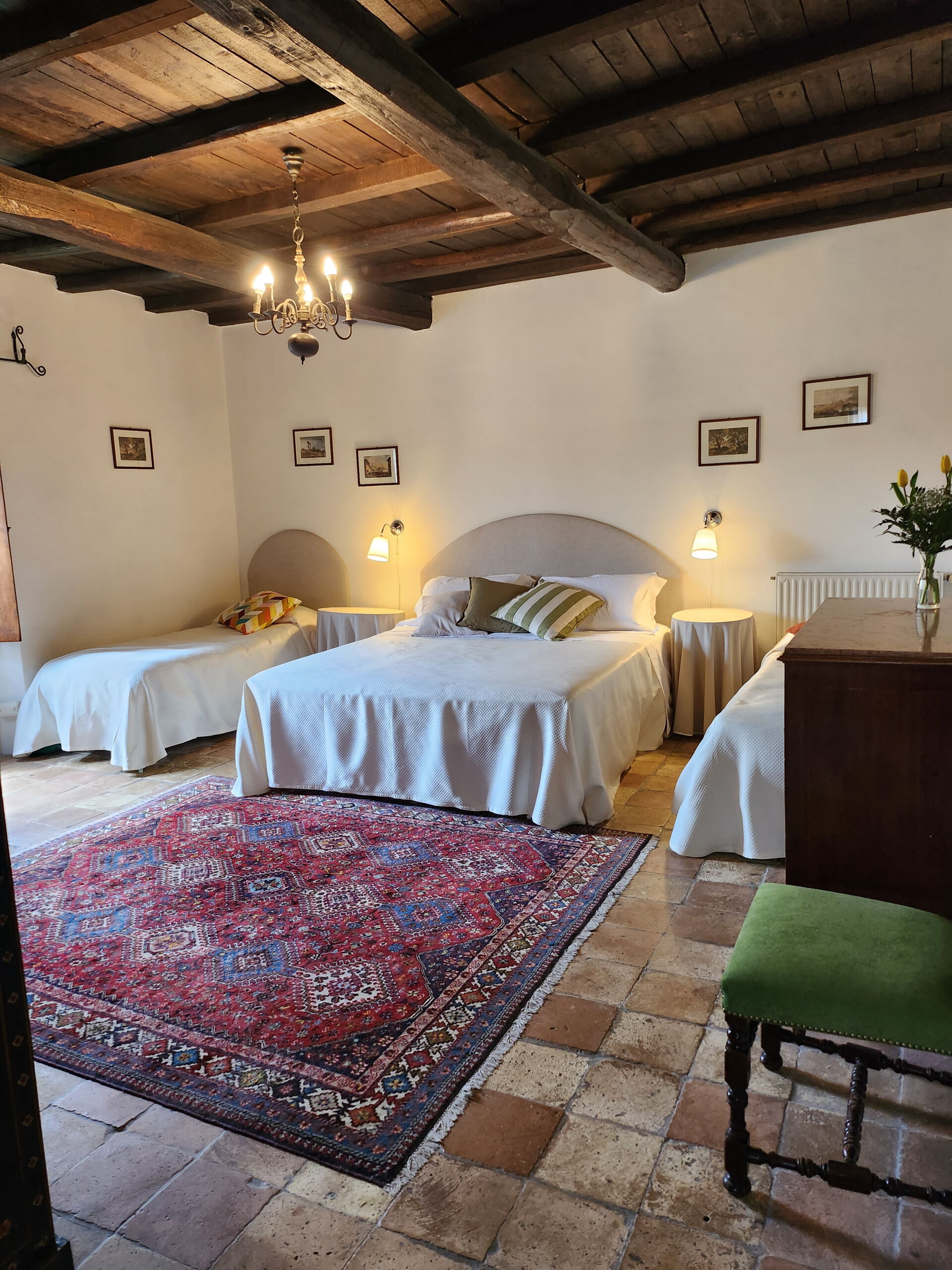Slaapkamer met badkamer 2: tweepersoonsbed, twee eenpersoonsbedden, WIFI internet, fauteuil, wastafel, toilet , bidet, uitgang naar de tuin.