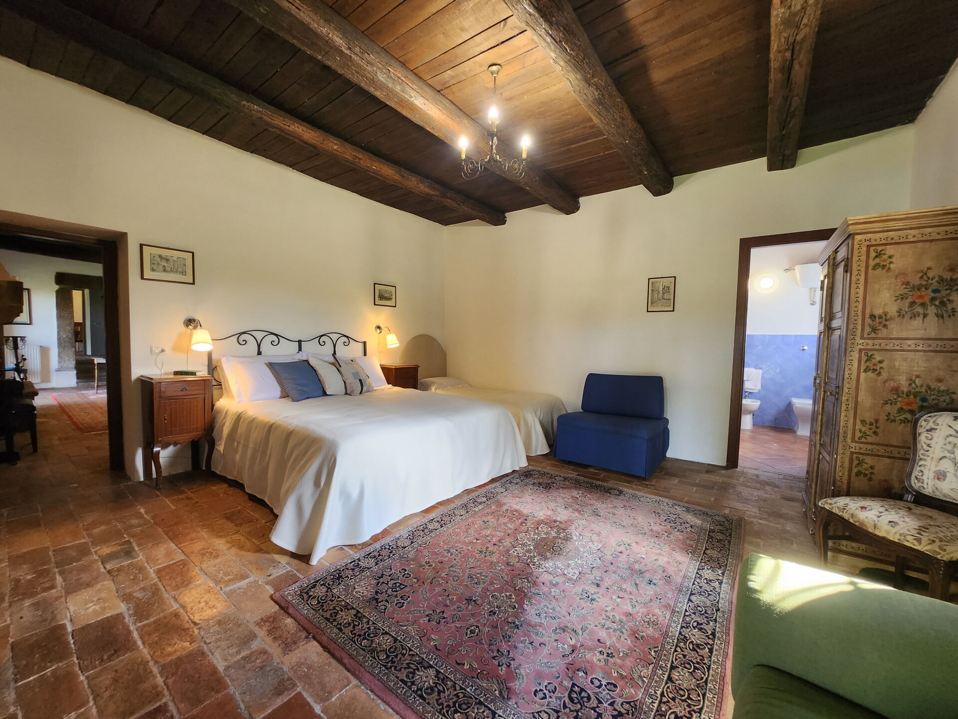 Slaapkamer met badkamer 1: tweepersoonsbed, eenpersoonsbed, WIFI internet, wastafel, toilet , bidet, uitgang naar de tuin.