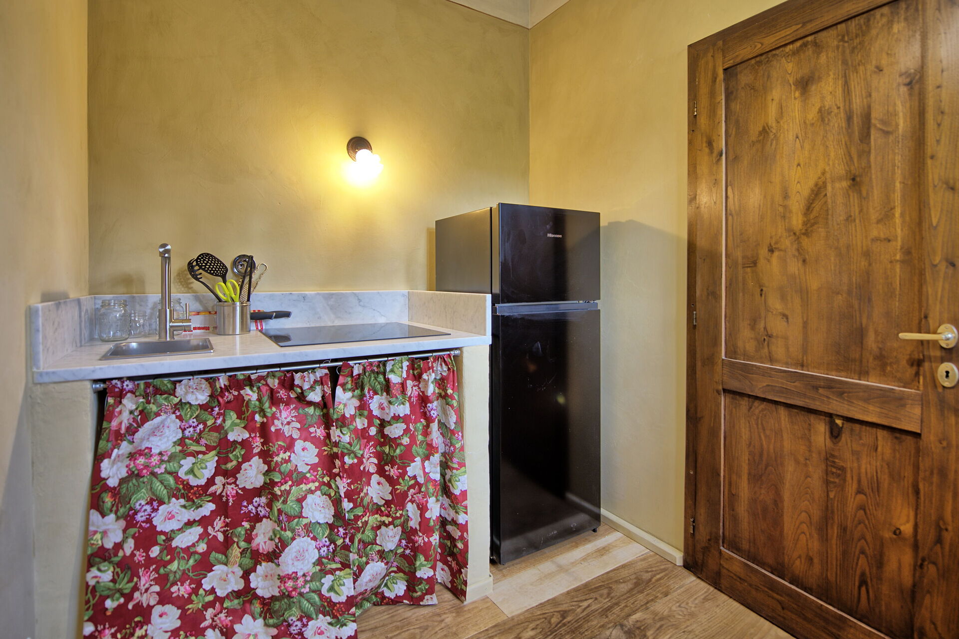 Eerste verdieping: kamer met kitchenette (inductiekookplaat, koelkast), 2 slaapkamers met elk een tweepersoonsbed, eenpersoonsslaapbank en eigen badkamer met douche.