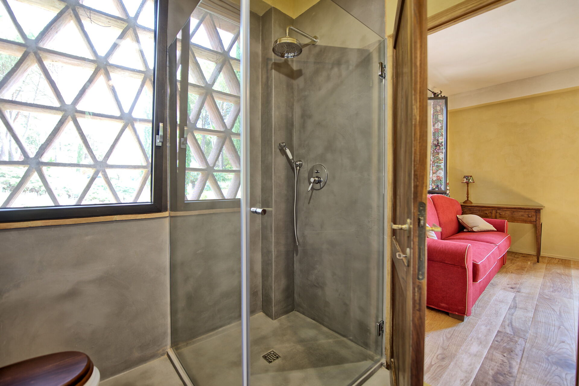 Begane grond (onafhankelijke ingang): doorgangskamer met eenpersoonsbed en slaapkamer met tweepersoonsbed met eigen badkamer met douche.