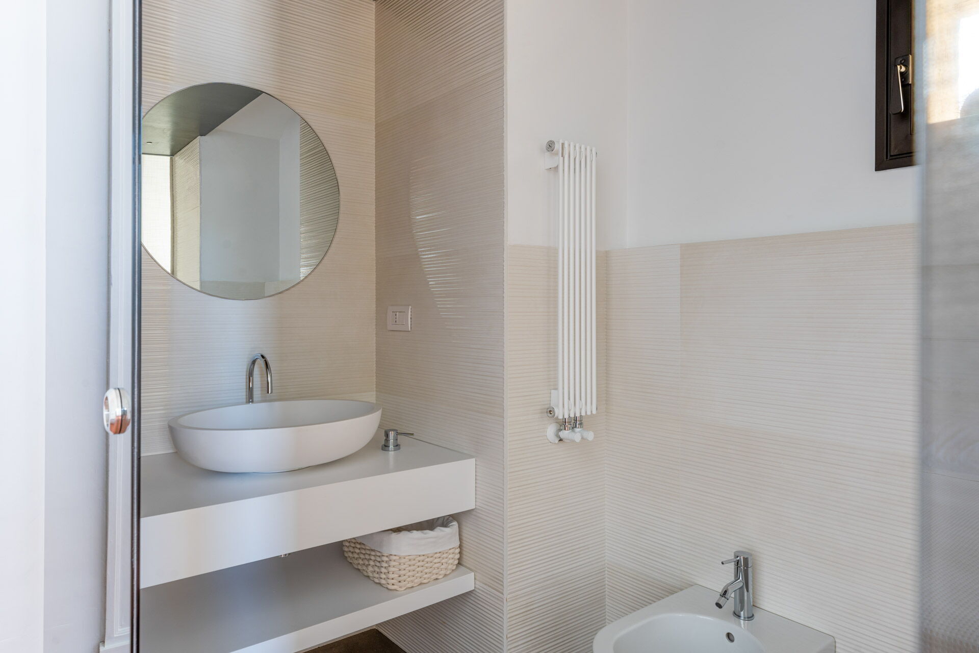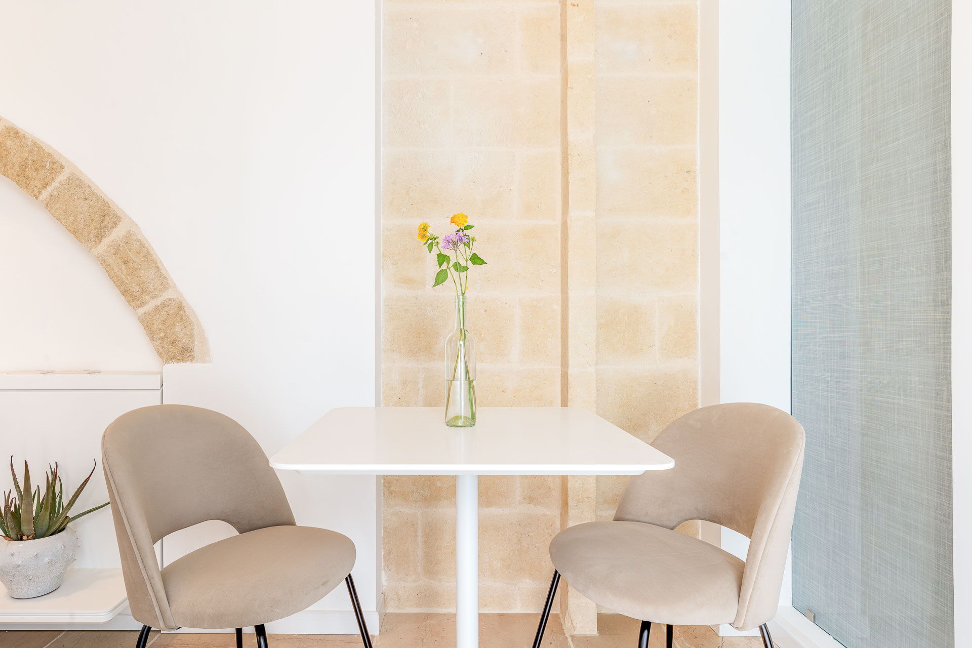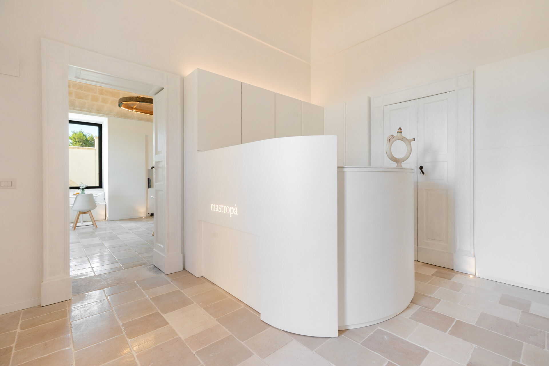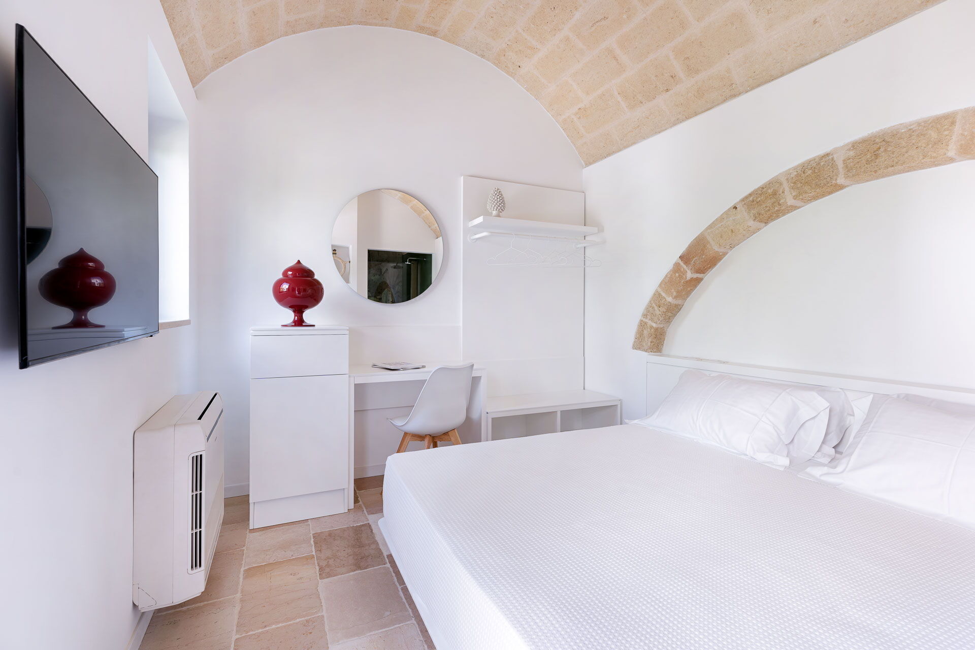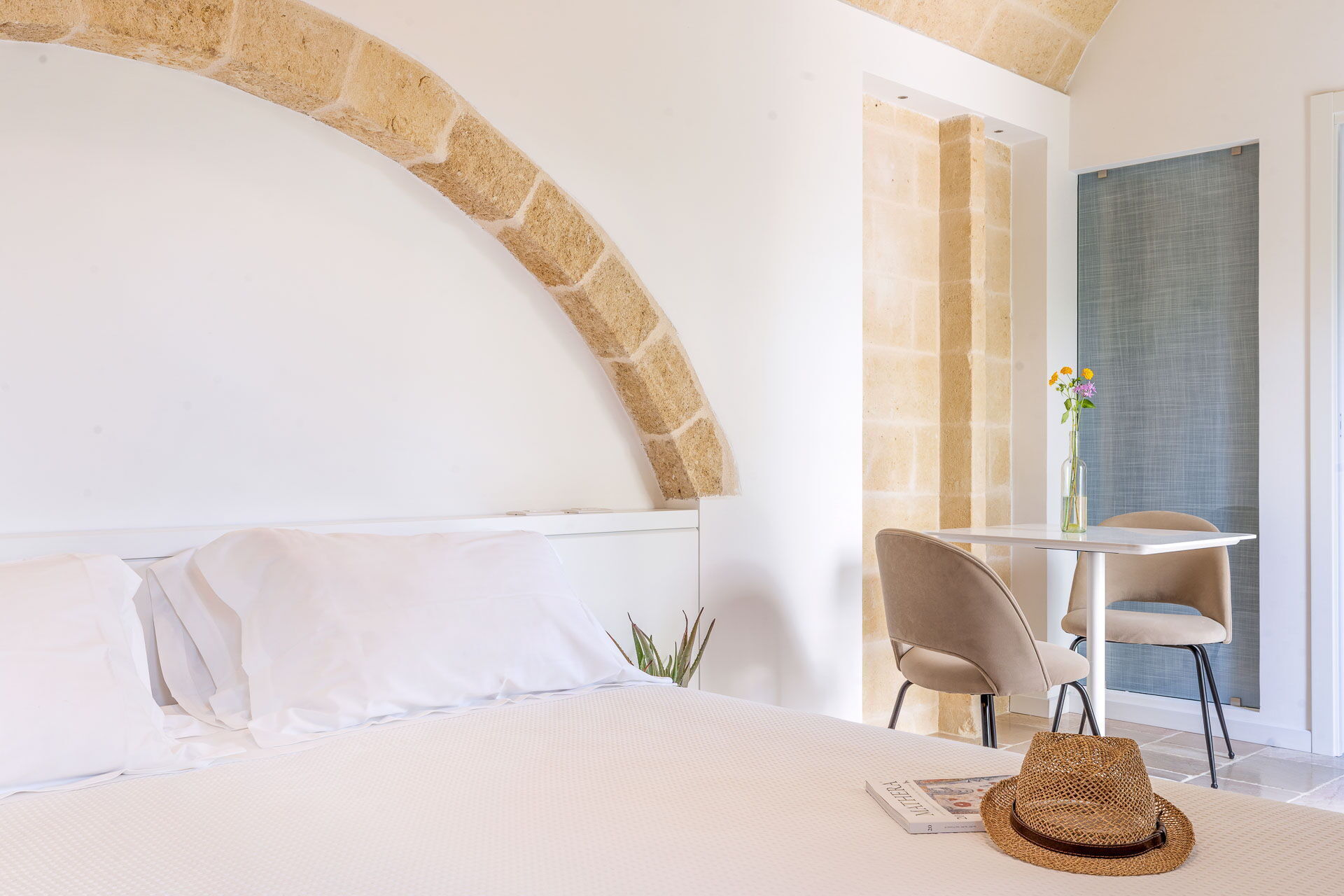 Each room is designed to offer a unique and unforgettable experience. Details play a fundamental role in creating an atmosphere of refined elegance. The bright shades of tuff, contrasting with the pure white of the furniture and walls, create a harmonious contrast that welcomes guests in a feeling of calm and serenity.
