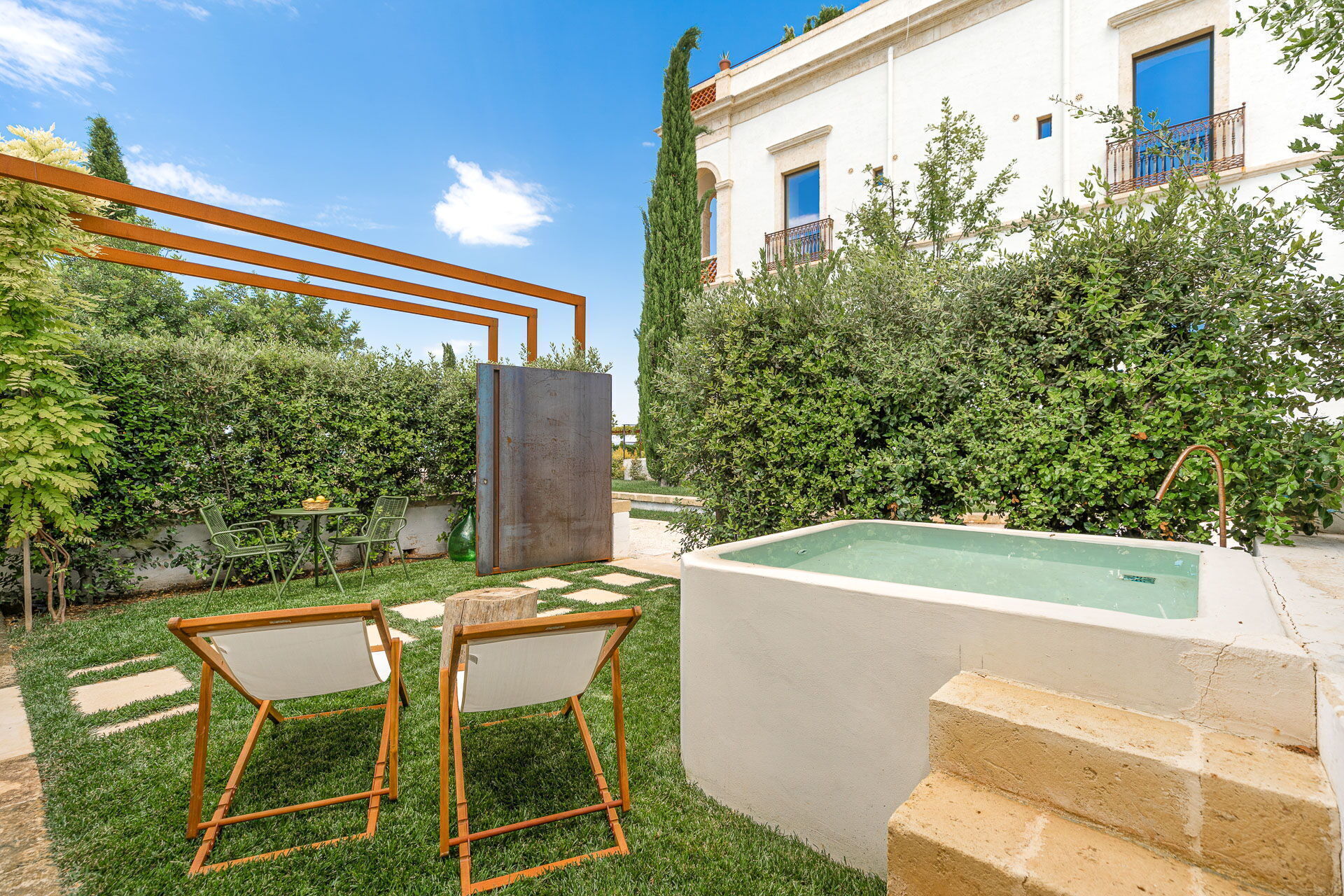 Inside the building, six refined rooms await visitors, with a distribution of two on the first floor and four on the ground floor, each of the four rooms accompanied by a private garden and a luxurious outdoor Jacuzzi. These resting spaces have been skilfully created from the old private stables, transforming into shelters of comfort and style.