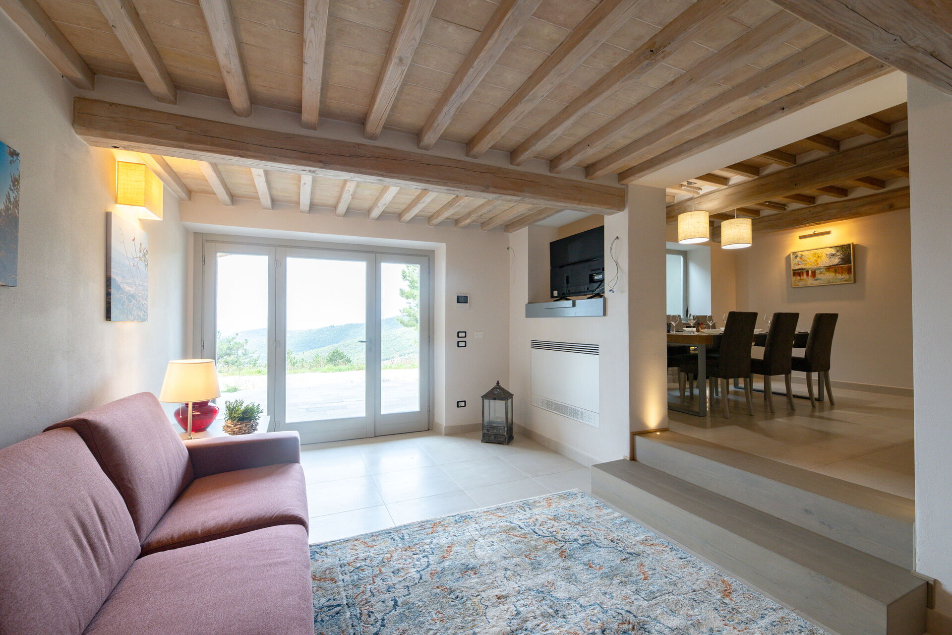 Woonkamer: tweepersoons-slaapbank, WIFI internet, airconditioning, hor, uitgang naar de tuin, uitgang naar de veranda.