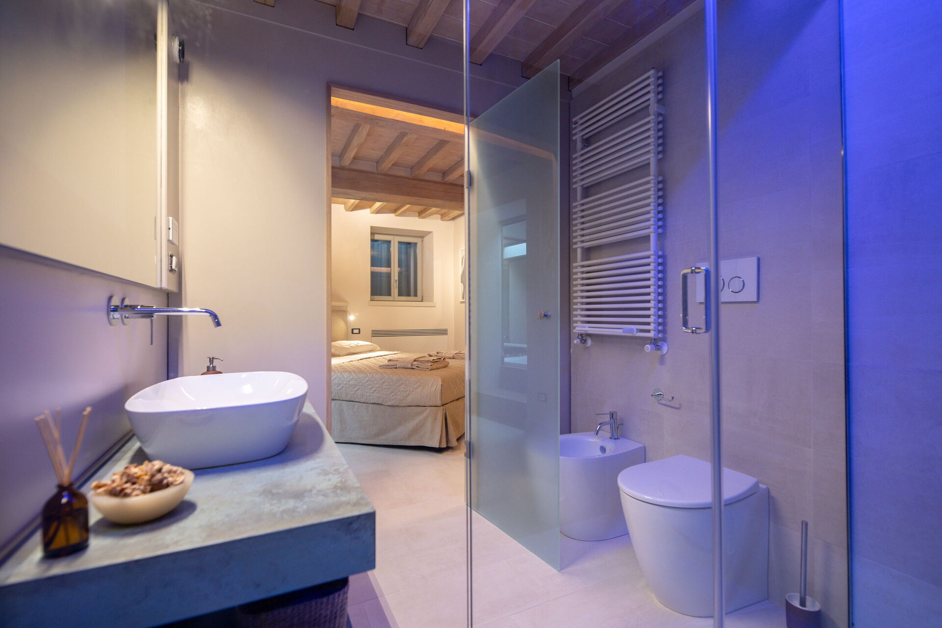 Slaapkamer met badkamer: tweepersoonsbed, WIFI internet, airconditioning, hor, bubbelbad, wastafel, toilet , bidet, douche, haardroger.