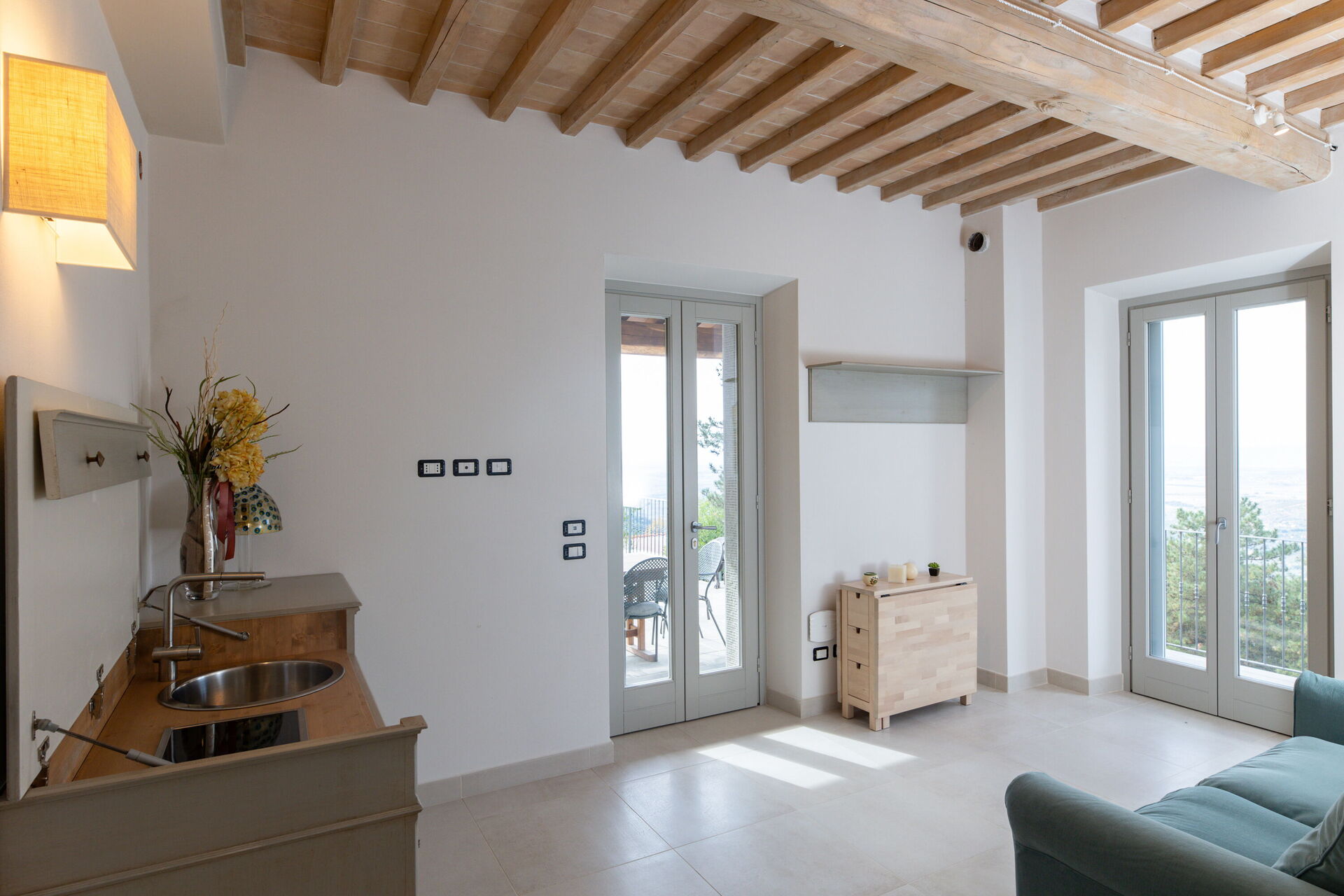 Keuken – woonkamer: goed uitgeruste keuken, eettafel, vaatwasser, ijskast, diepvriezer, magnetron, kookplaat, oven, broodrooster, italiaans koffiezetapparaat, koffiezetapparaat, bank, WIFI internet, airconditioning, hor, satelliet tv, uitgang naar de tuin.