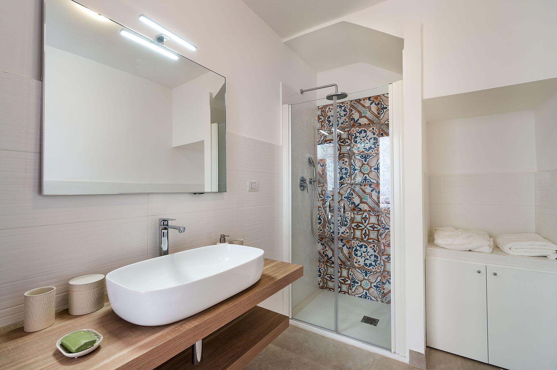 Slaapkamer met badkamer 1: tweepersoonsbed, baby wieg, WIFI internet, internet, airconditioning, fauteuil, dubbele wastafel, toilet , bidet, douche, haardroger, wasmachine, uitgang naar het terras.