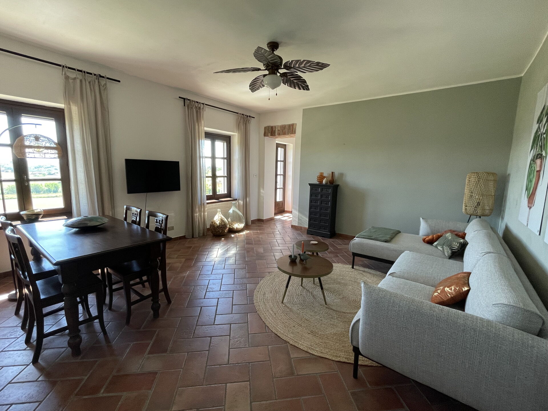 Woonkamer (32 m2): eettafel, WIFI internet, tv, plafondventilator, uitgang naar het balkon.
