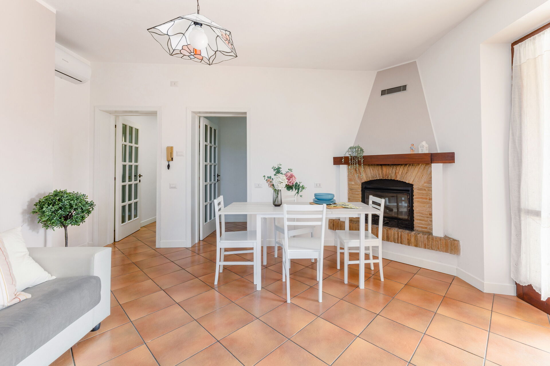 Keuken – woonkamer: goed uitgeruste keuken, ijskast, diepvriezer, oven, tweepersoons-slaapbank, WIFI internet, airconditioning, uitgang naar de tuin.