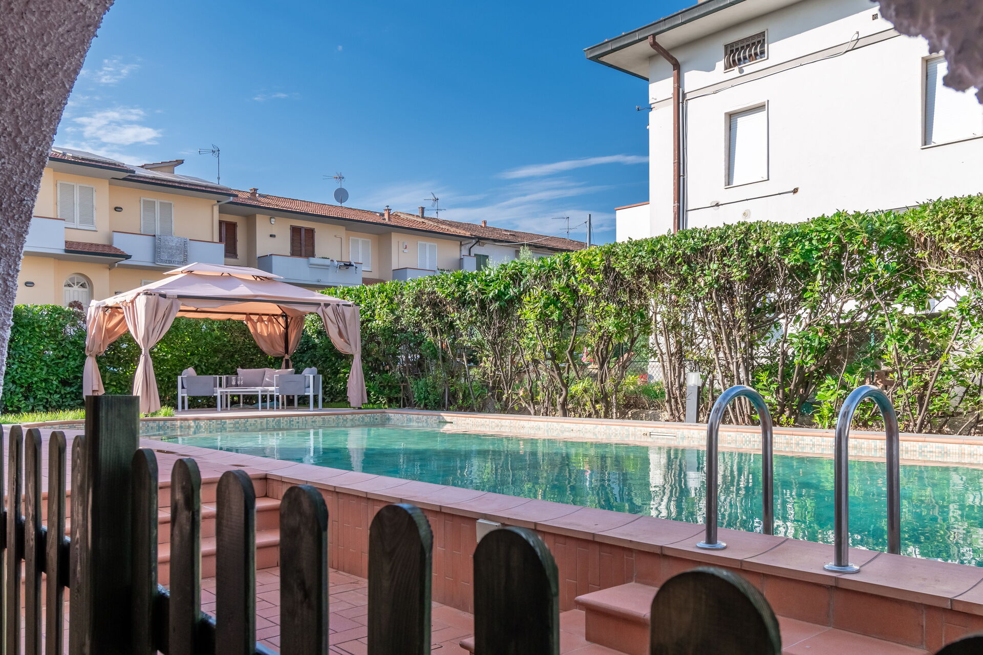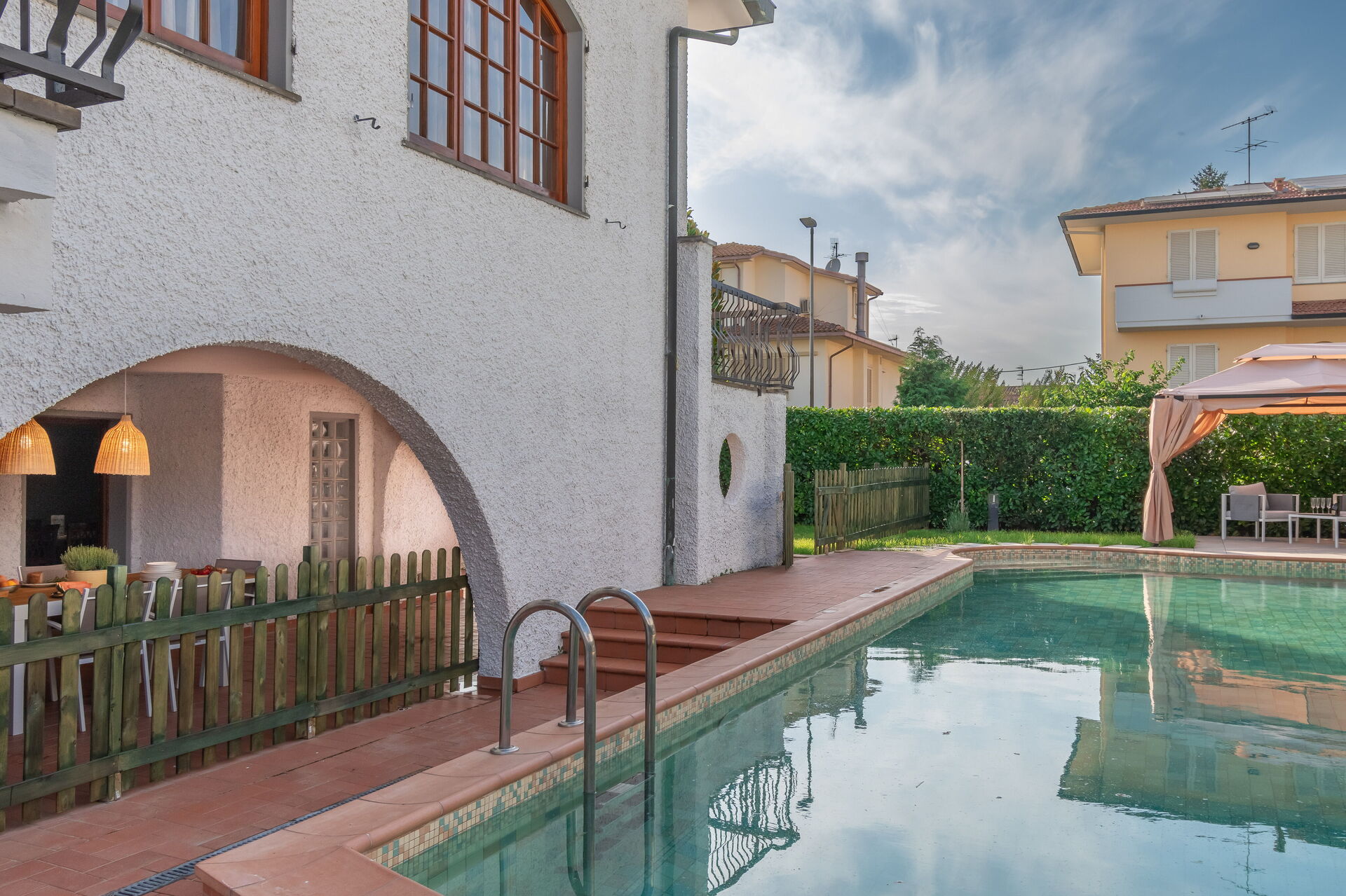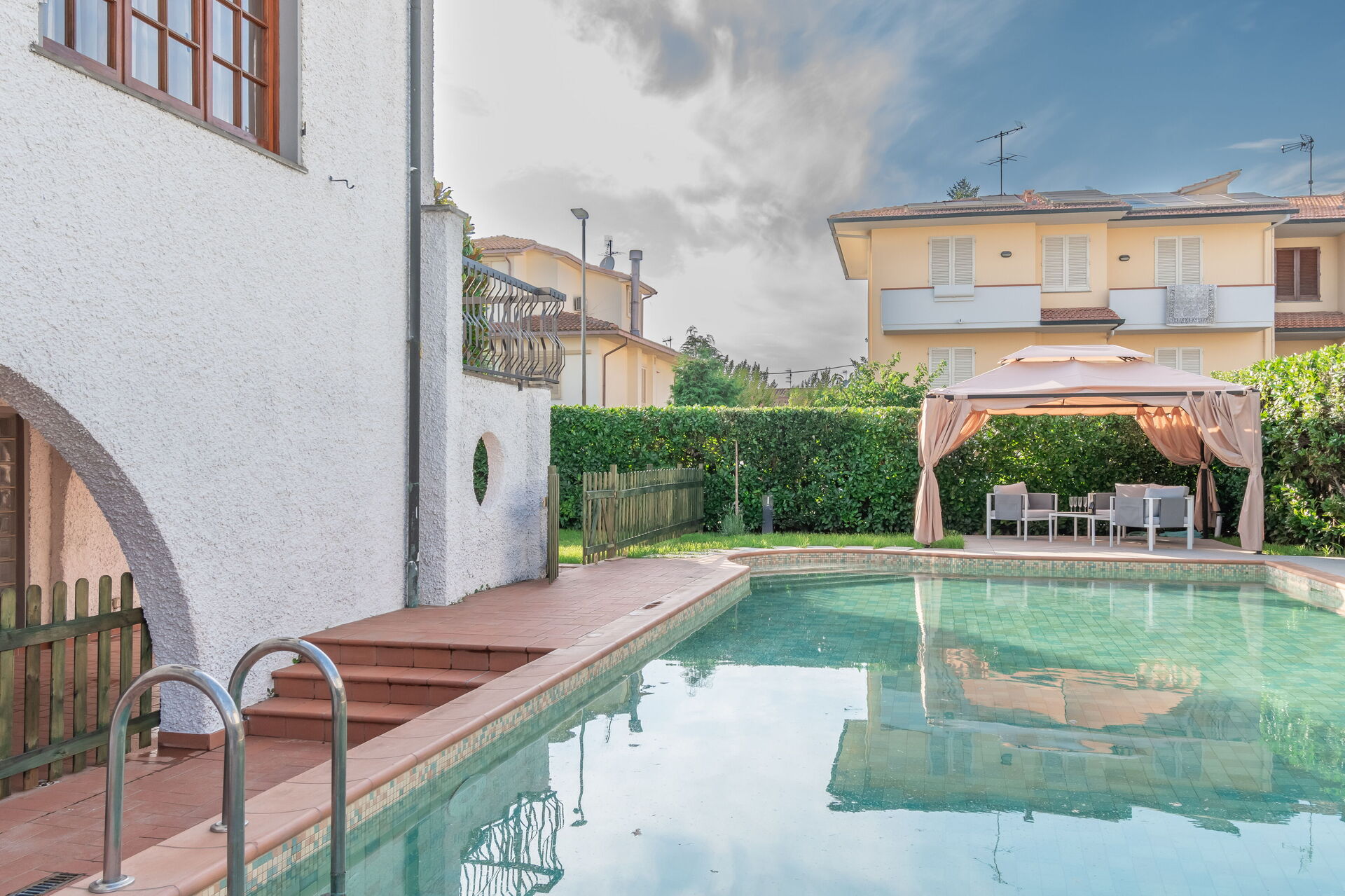 Tuin: zwembad (privé, breedte: 6m, lengte: 13m, diepte: 1.5m, max. diepte: 2m, min. diepte: 1m), WIFI internet, dineren in de buitenlucht, eettafel, gazebo, tuinmeubilair, ligstoel, omheind, omheind grondstuk.