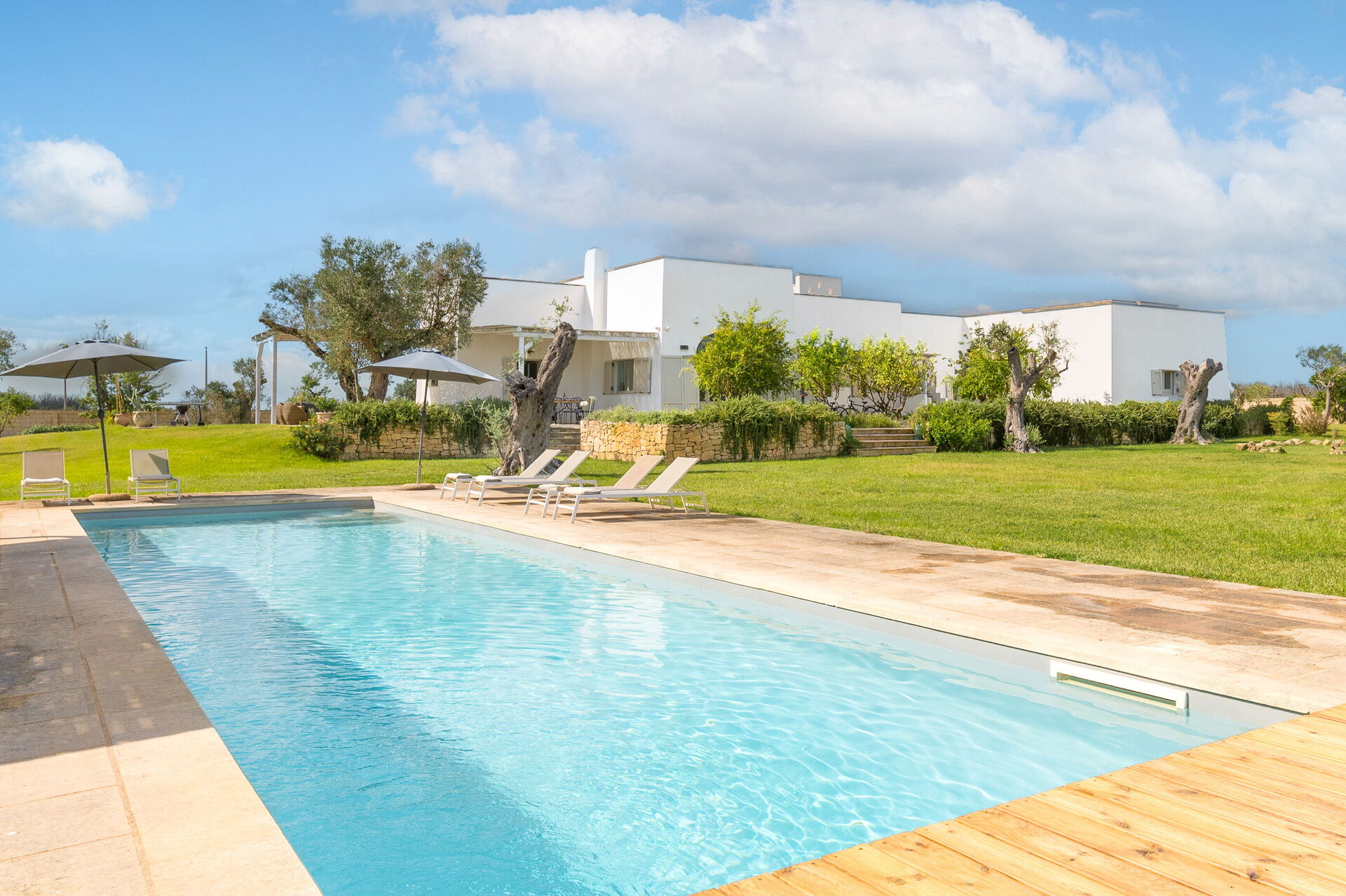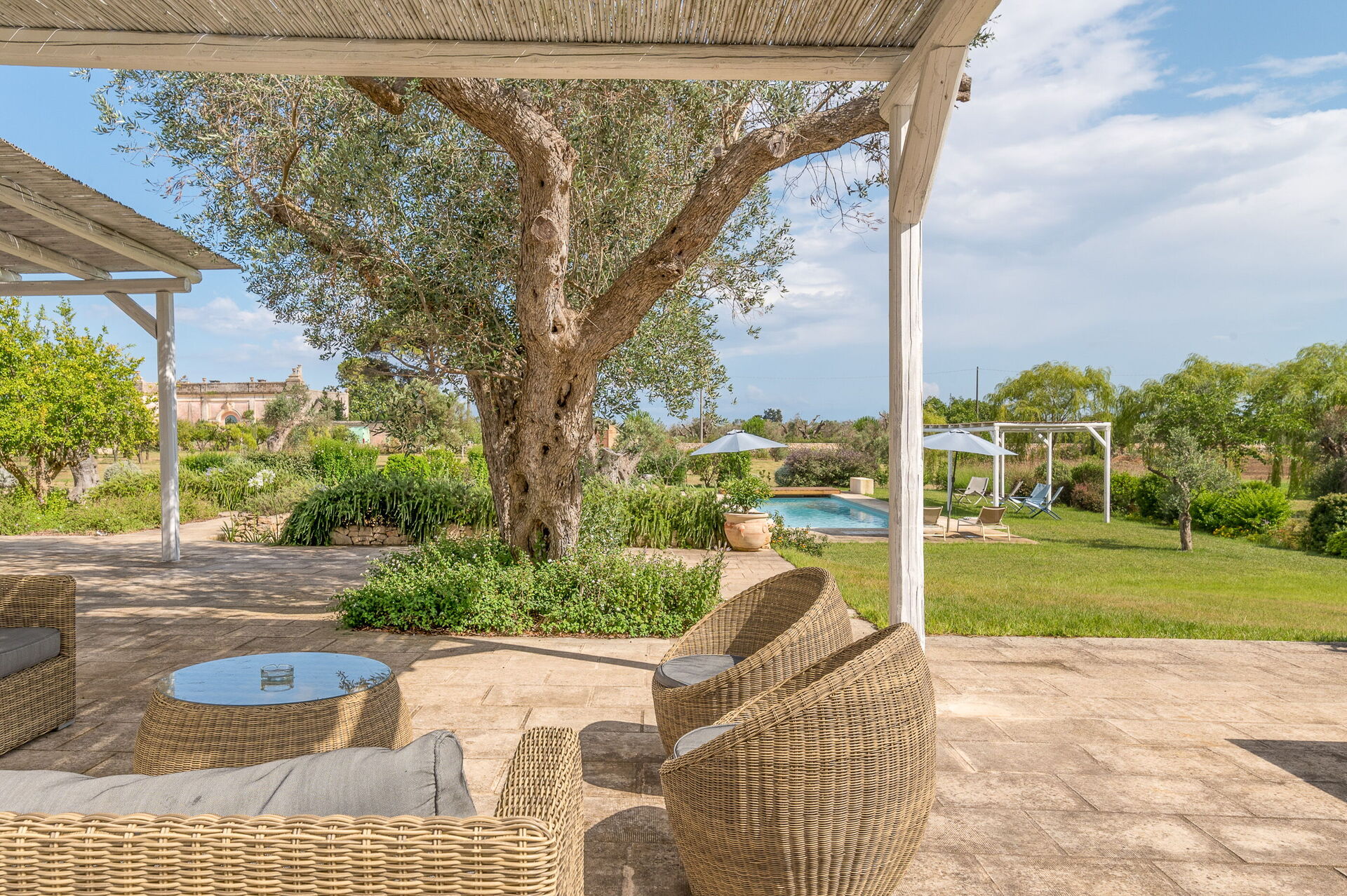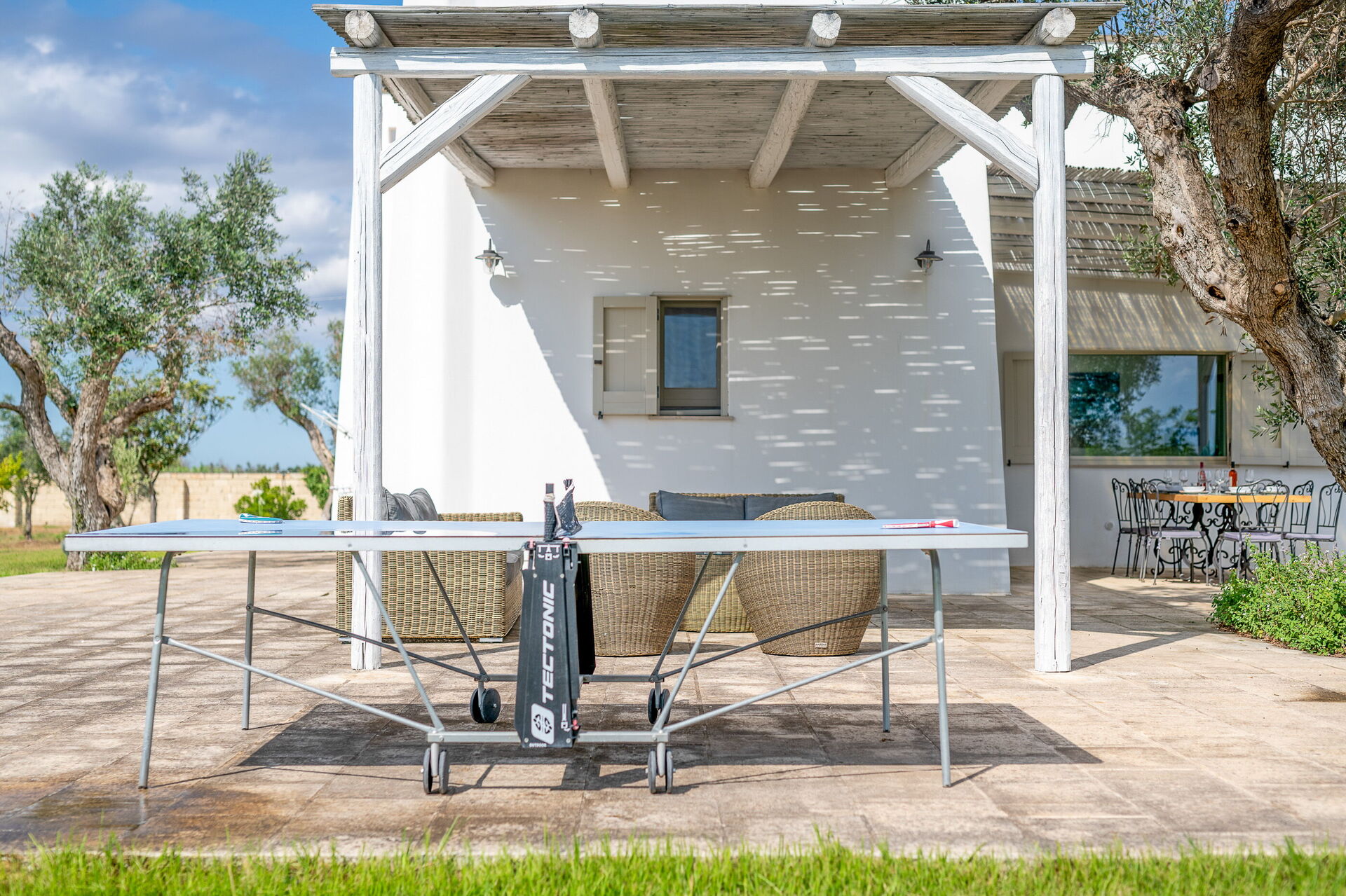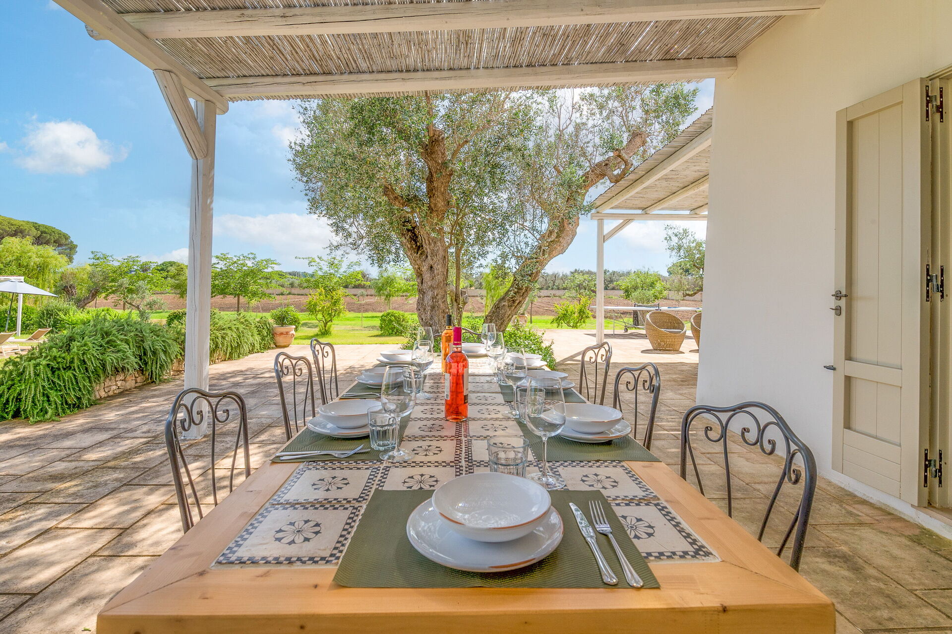 Outside, the villa is nestled in a large plot adorned with olive trees, a lemon grove, and an orange grove. A spacious lawn surrounds the pool, and shaded outdoor seating is perfect for enjoying meals around a beautiful tiled ceramic table.