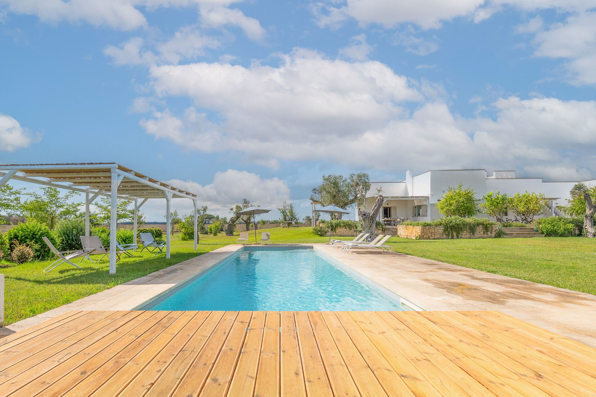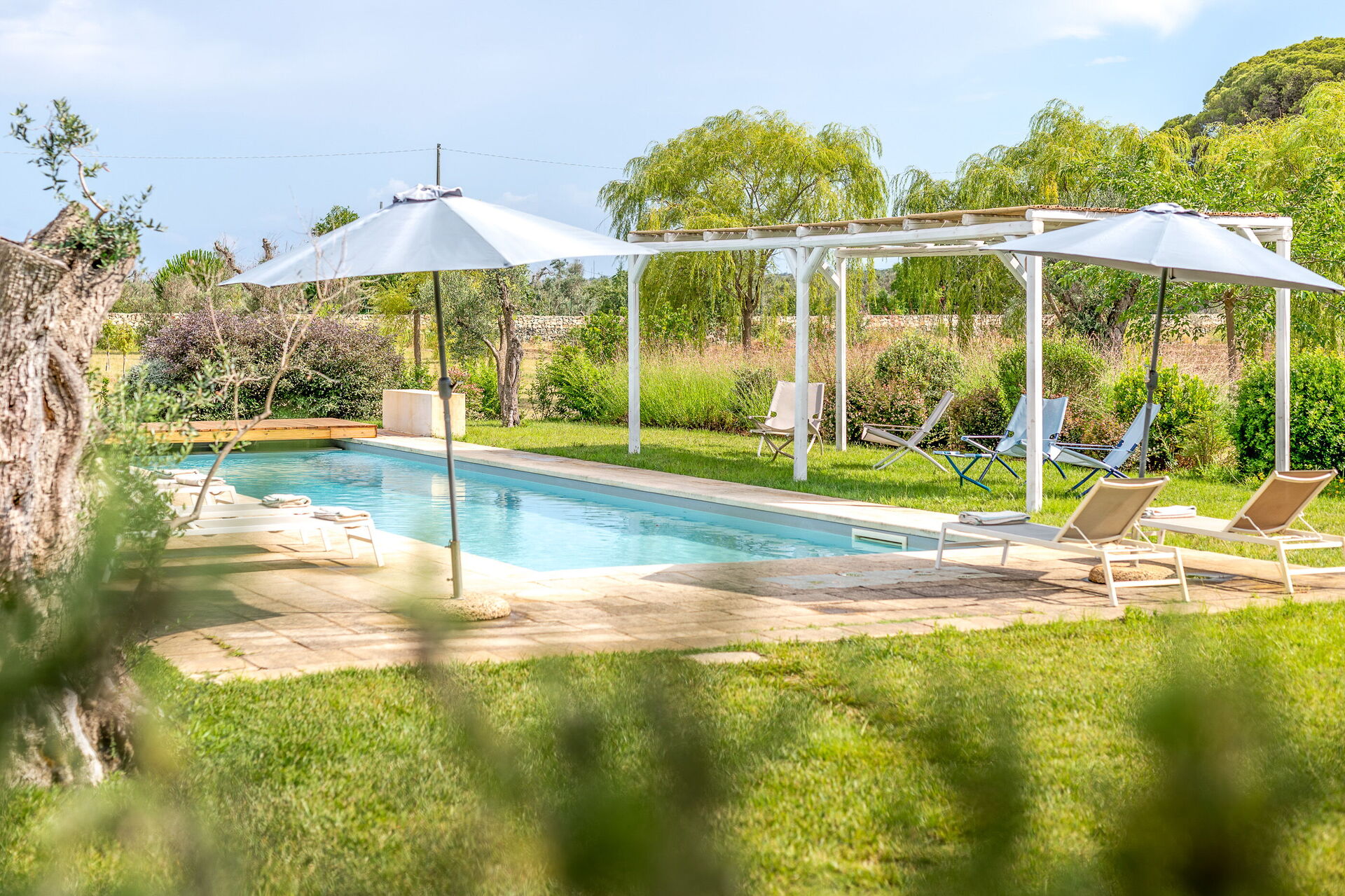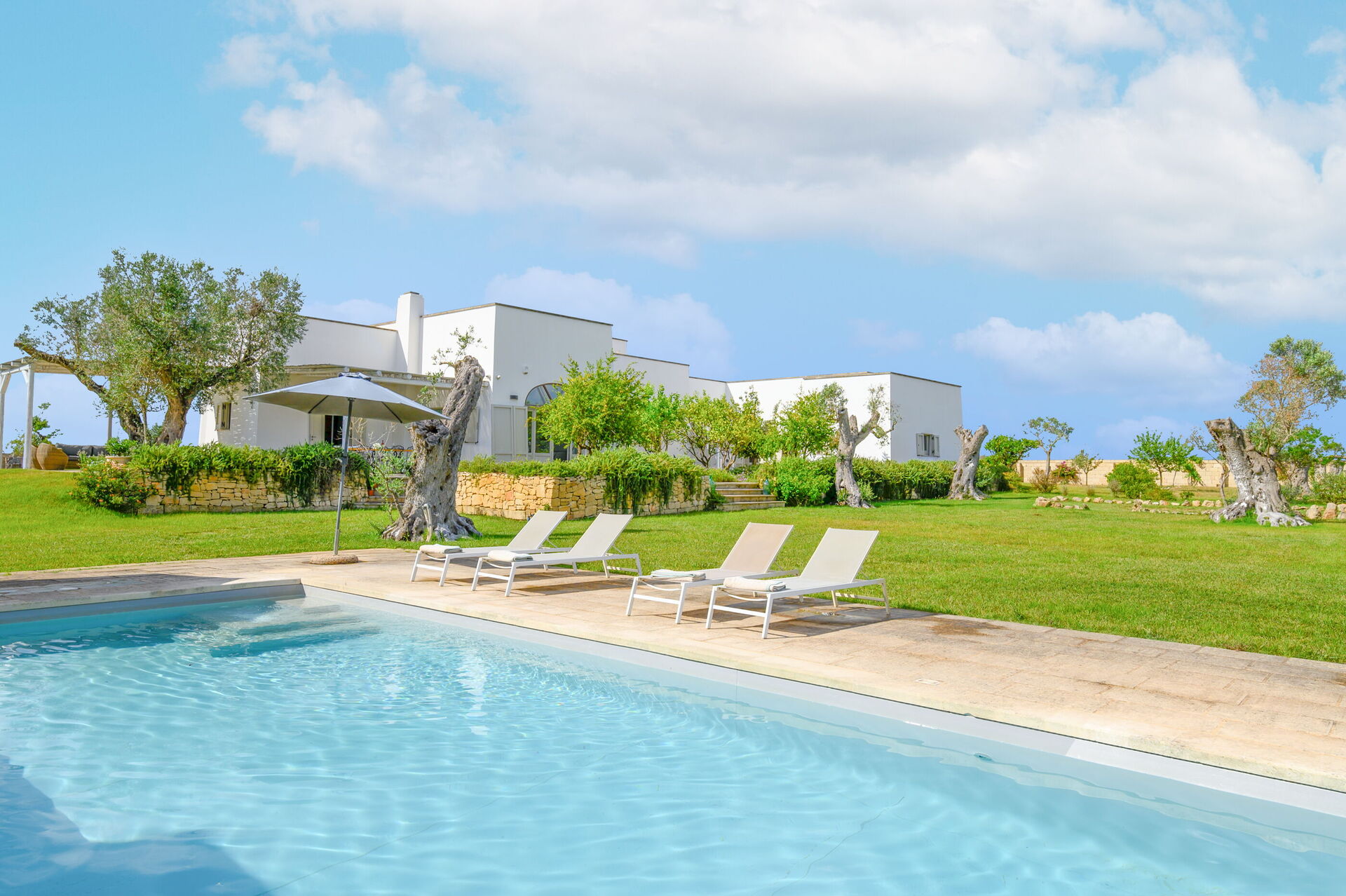 Outside, the villa is nestled in a large plot adorned with olive trees, a lemon grove, and an orange grove. A spacious lawn surrounds the pool, and shaded outdoor seating is perfect for enjoying meals around a beautiful tiled ceramic table.