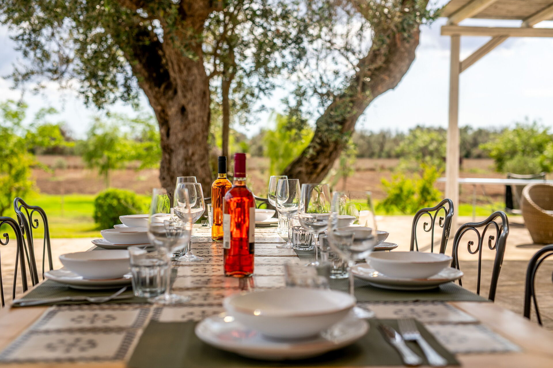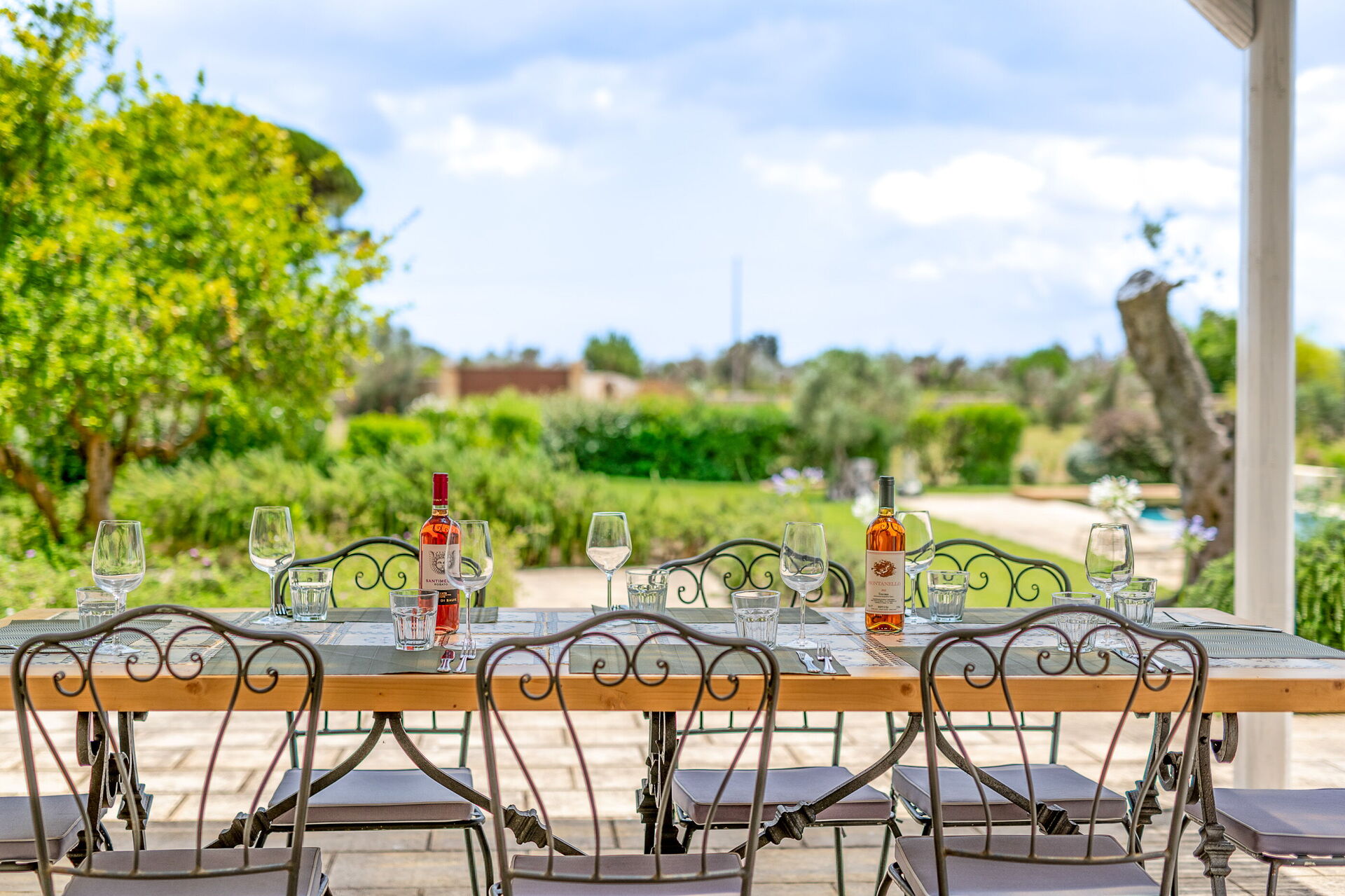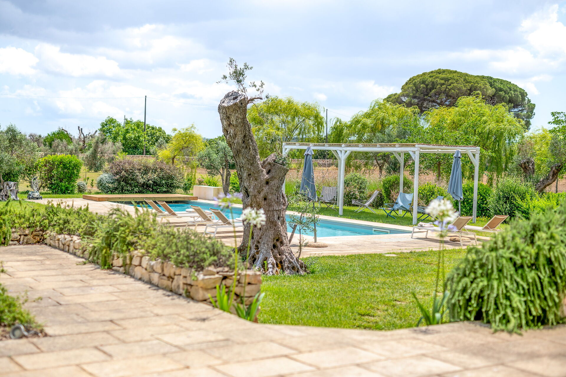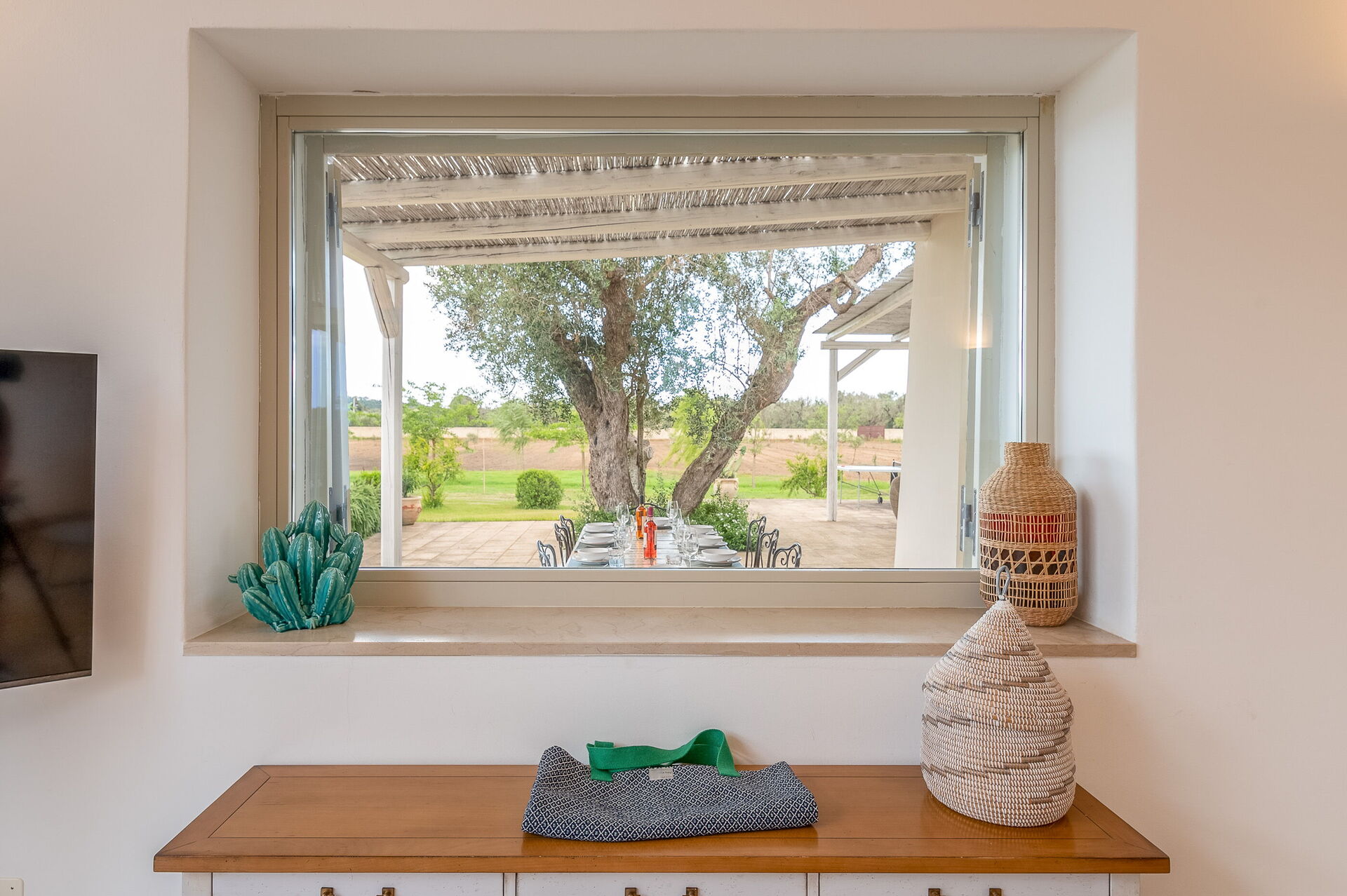 Outside, the villa is nestled in a large plot adorned with olive trees, a lemon grove, and an orange grove. A spacious lawn surrounds the pool, and shaded outdoor seating is perfect for enjoying meals around a beautiful tiled ceramic table.