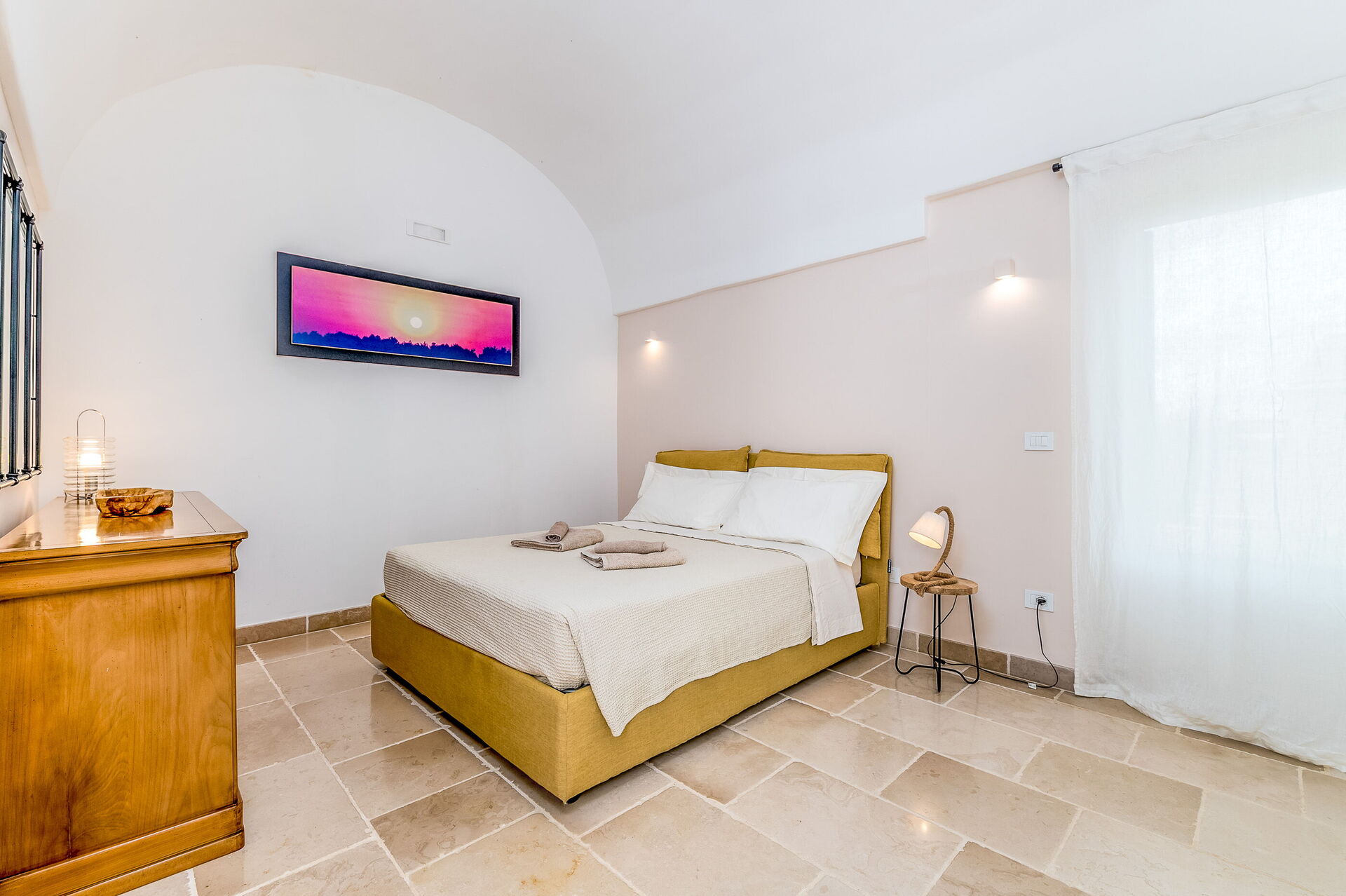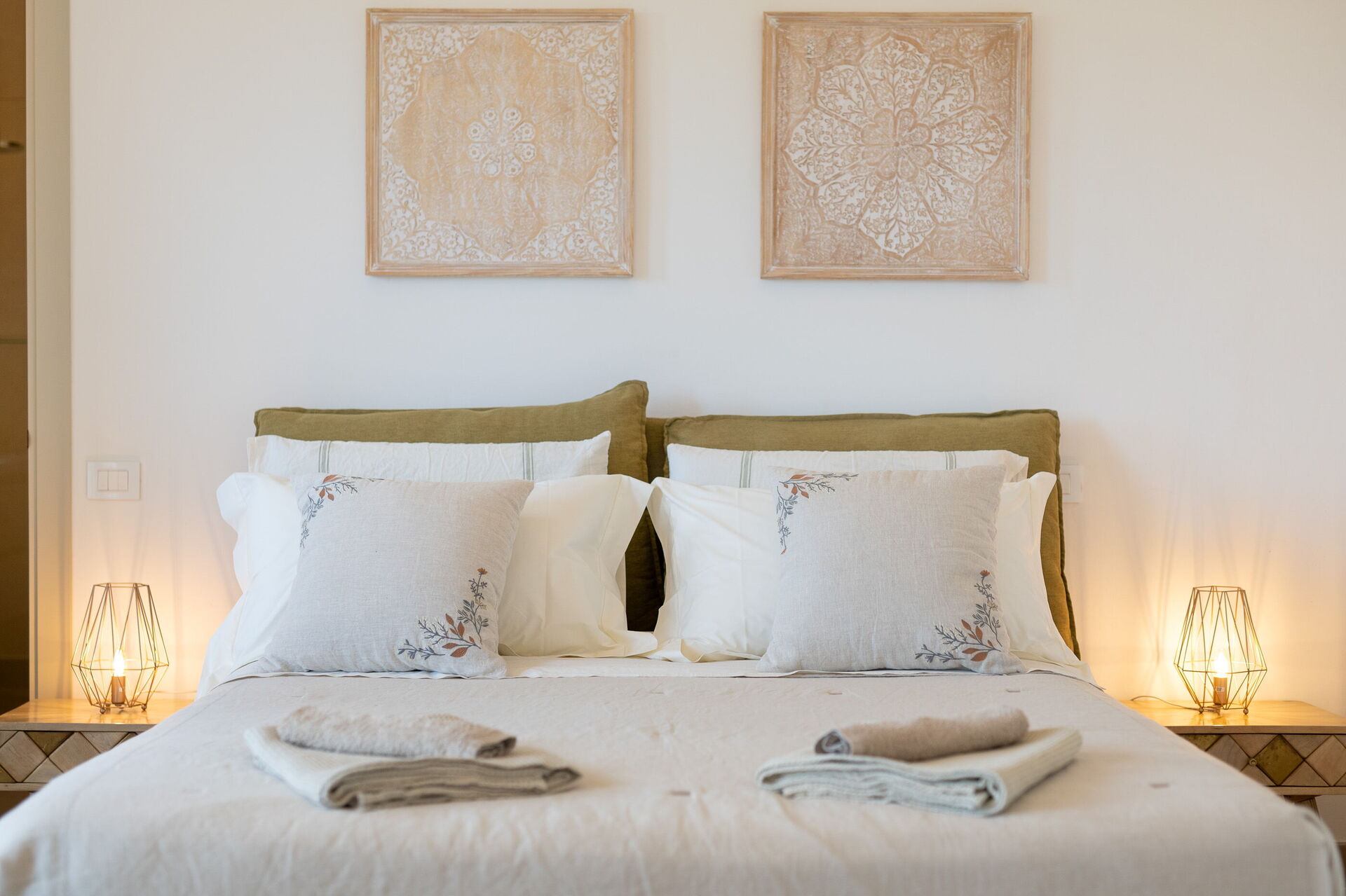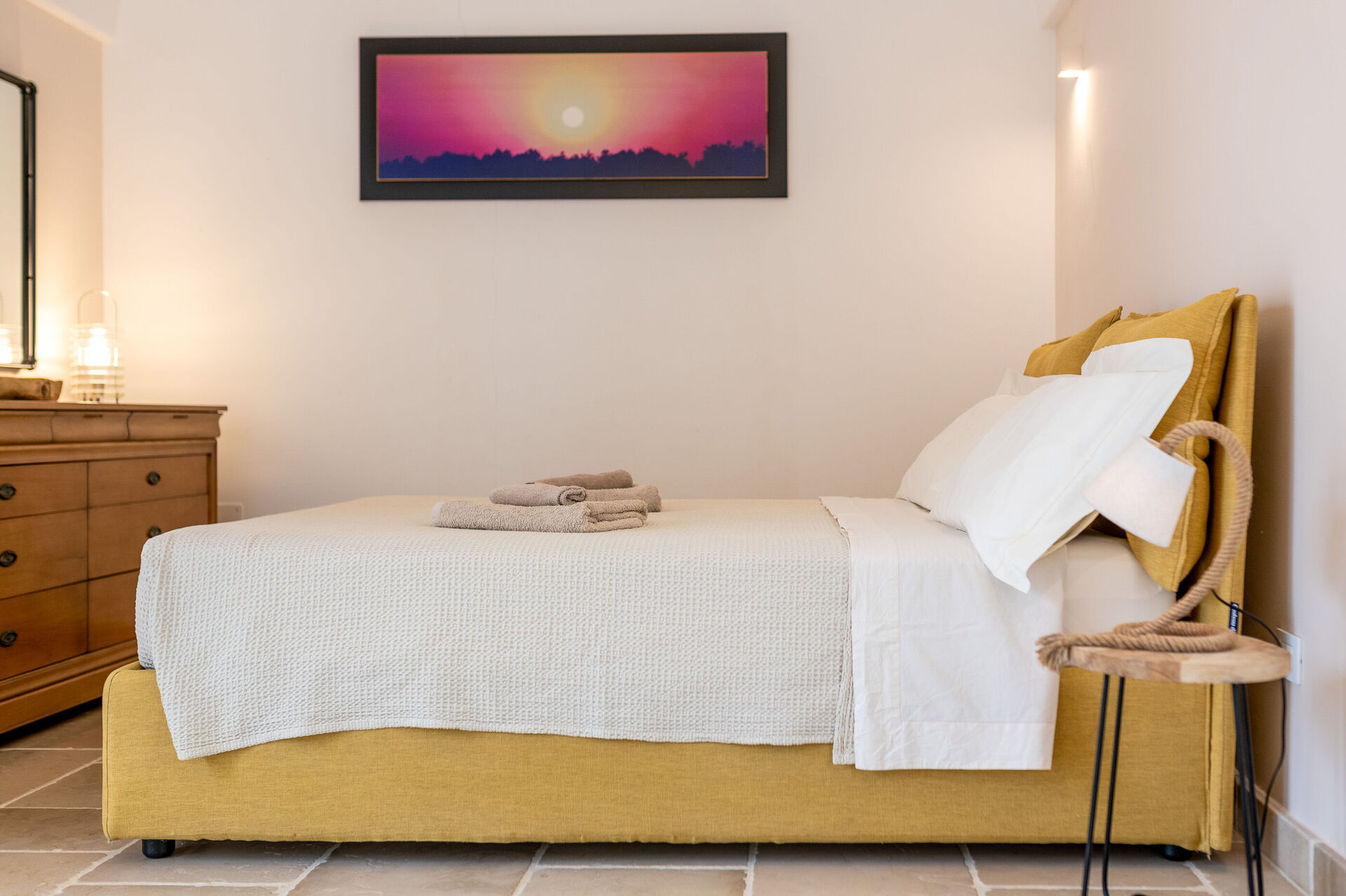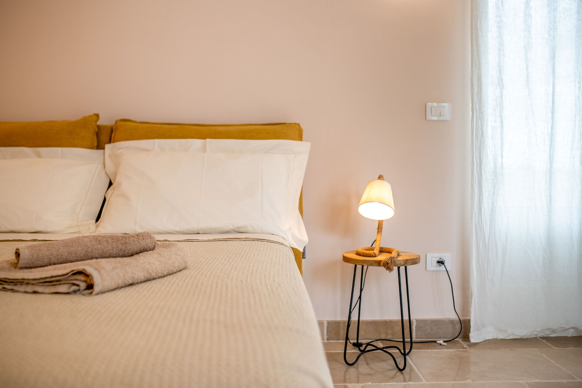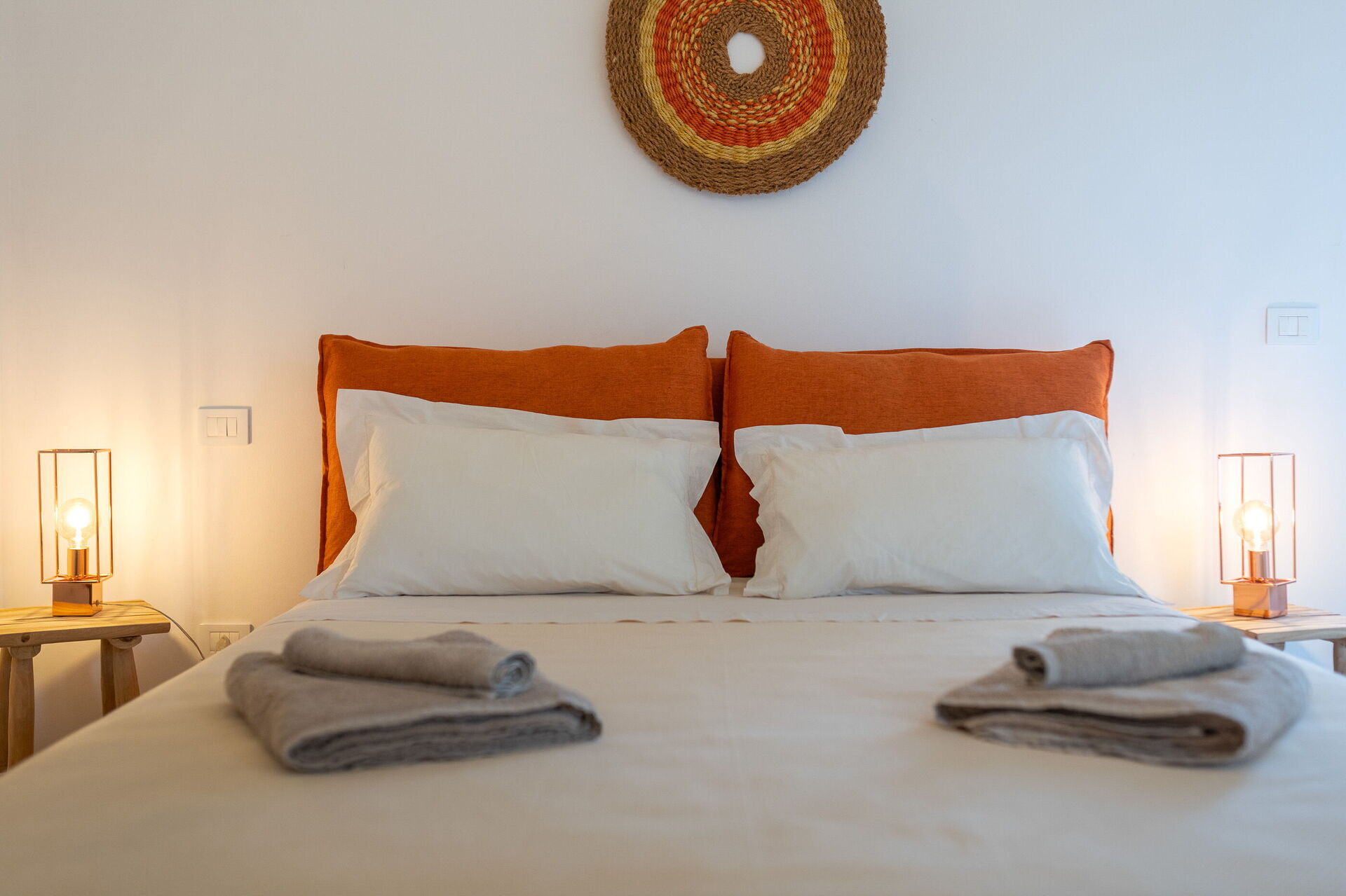 The villa offers a warm, bohemian, and rustic atmosphere, with high-quality beds and mattresses in every room, ensuring a spacious and snug stay.