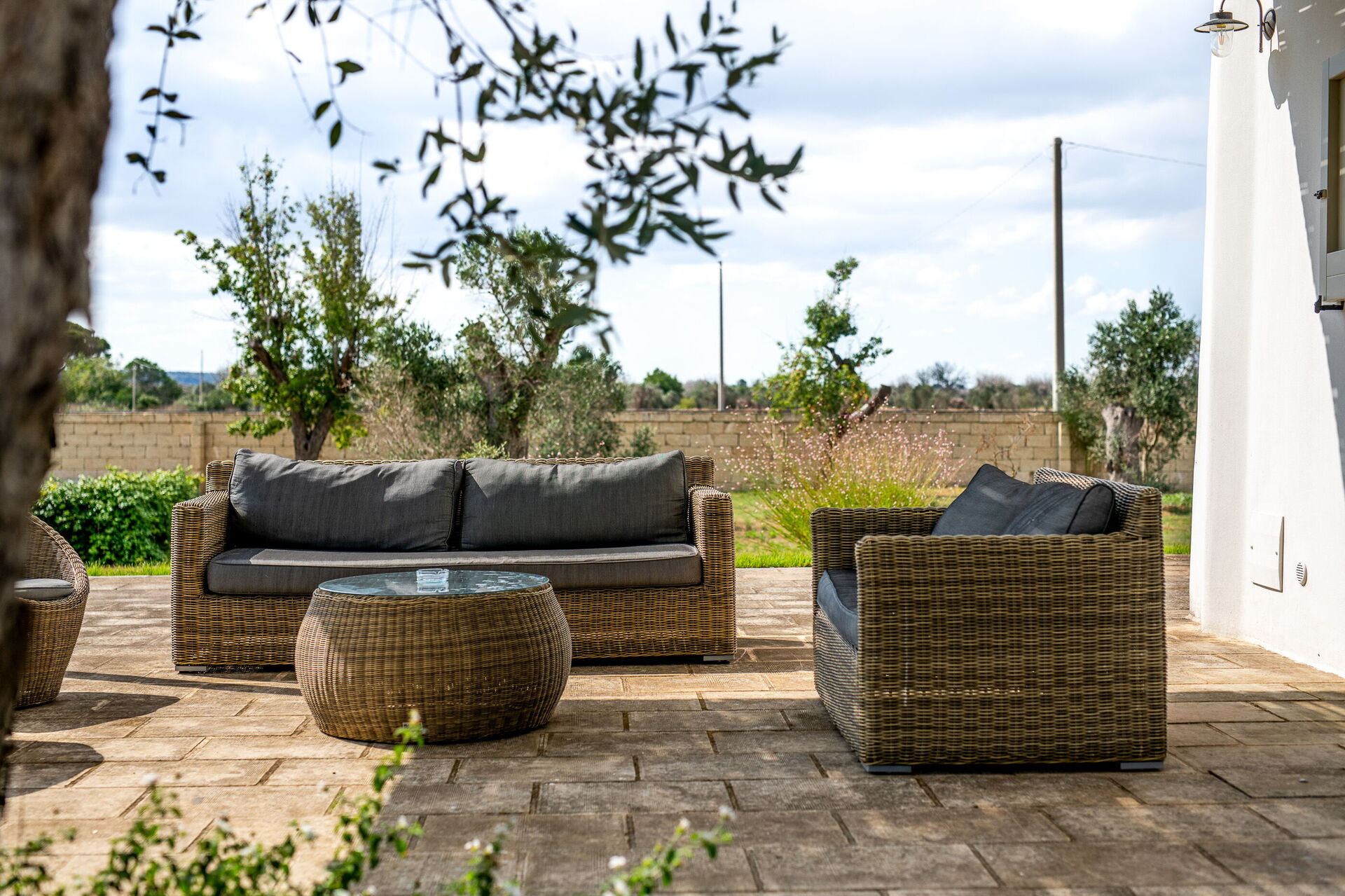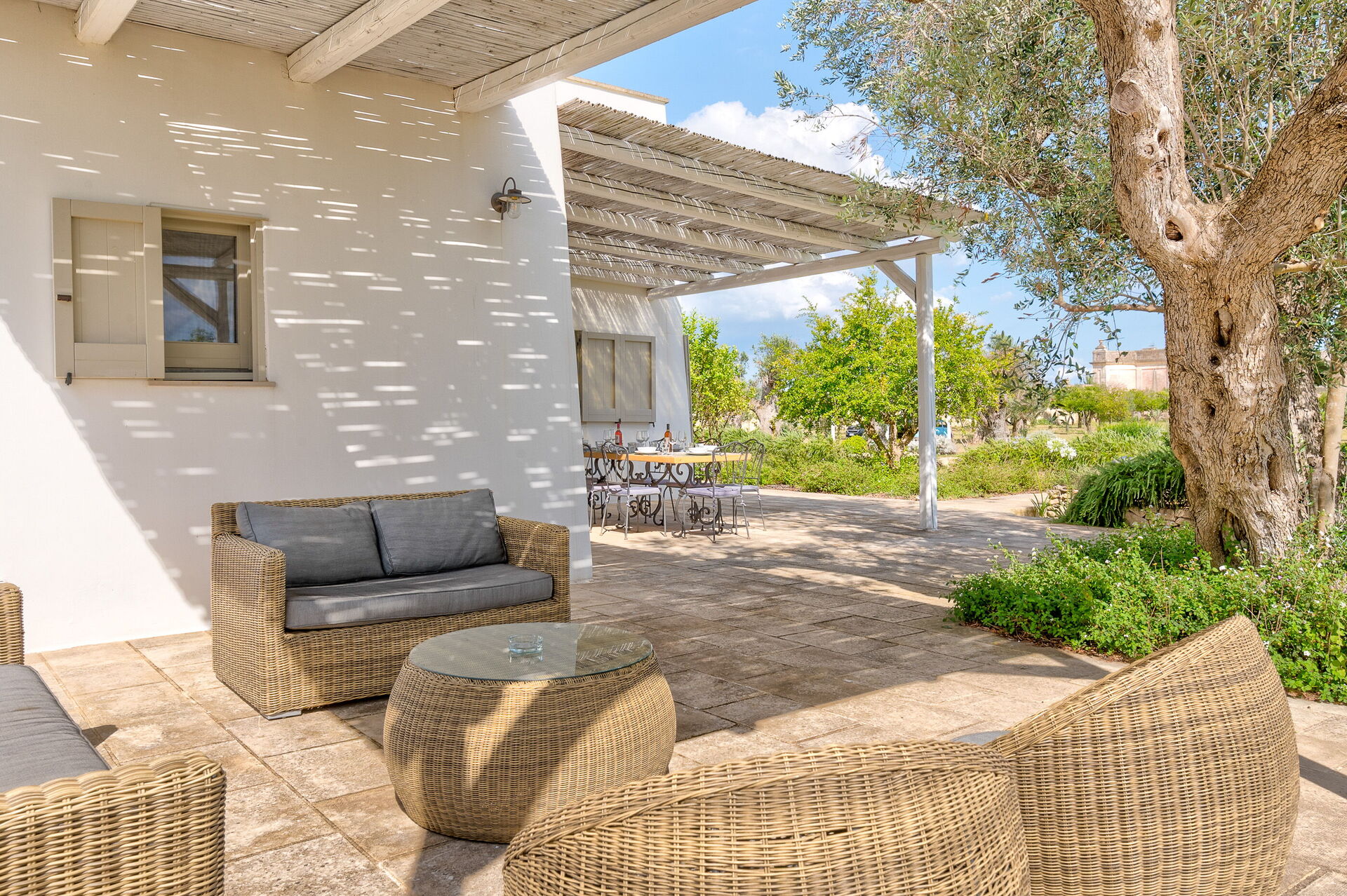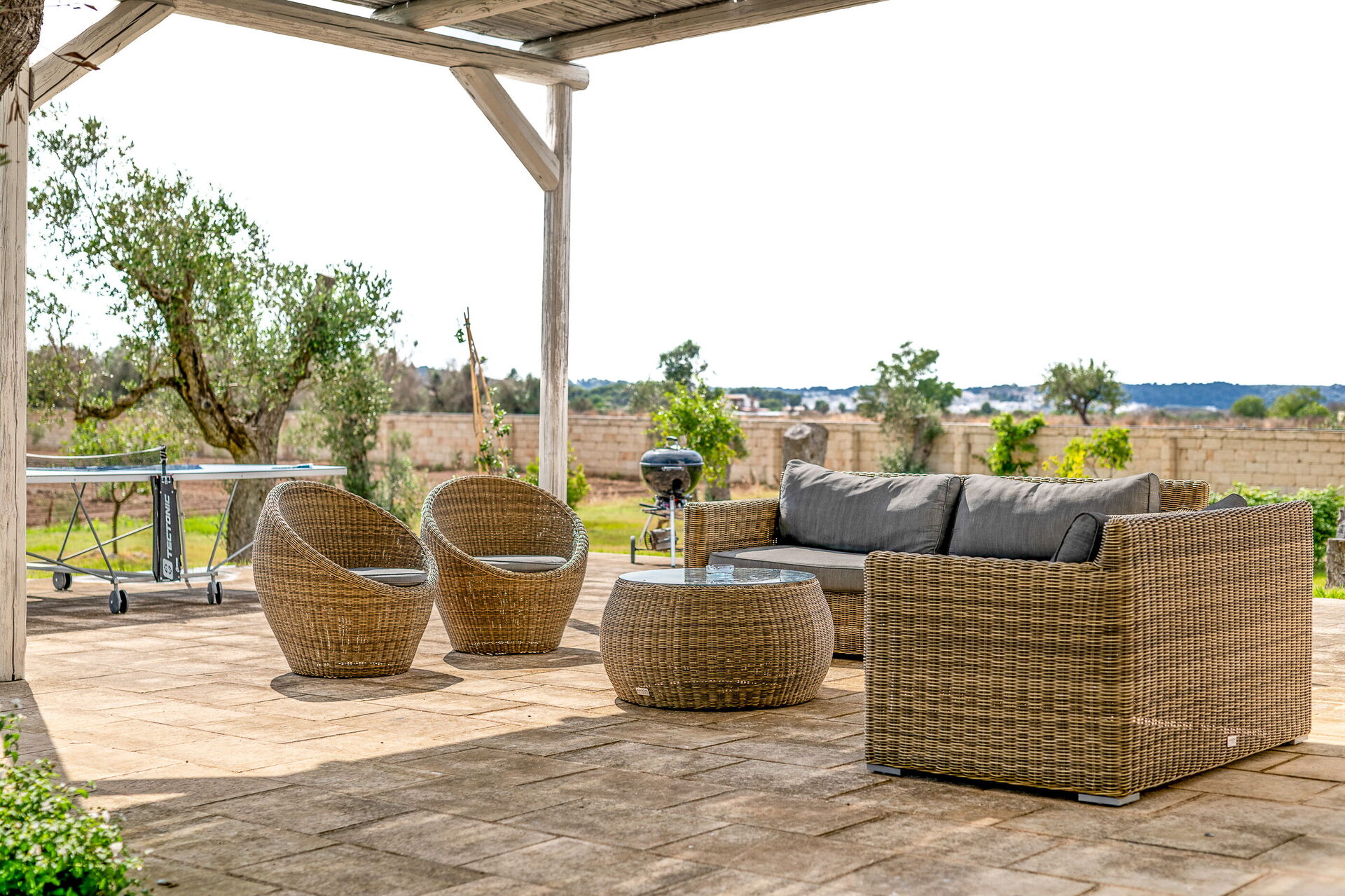Additionally, there's a cozy outdoor area with sofas and a coffee table, perfect for relaxing.