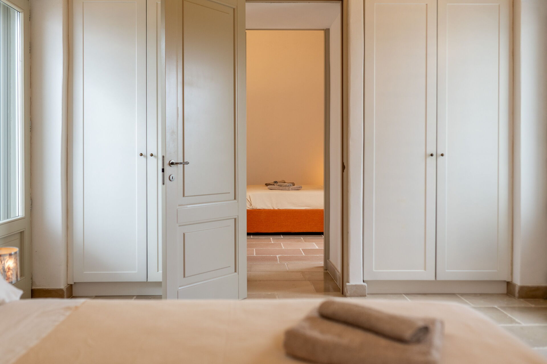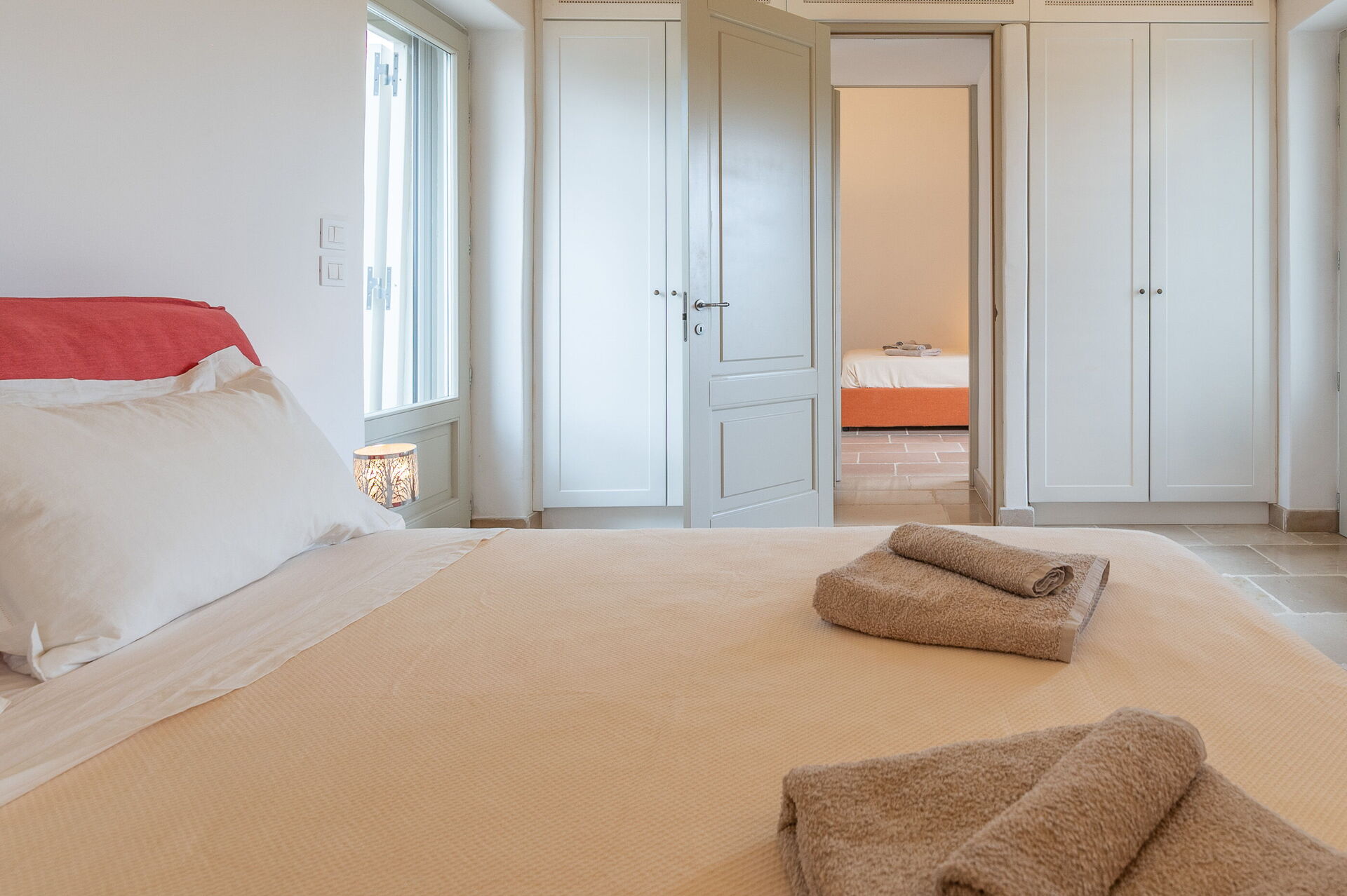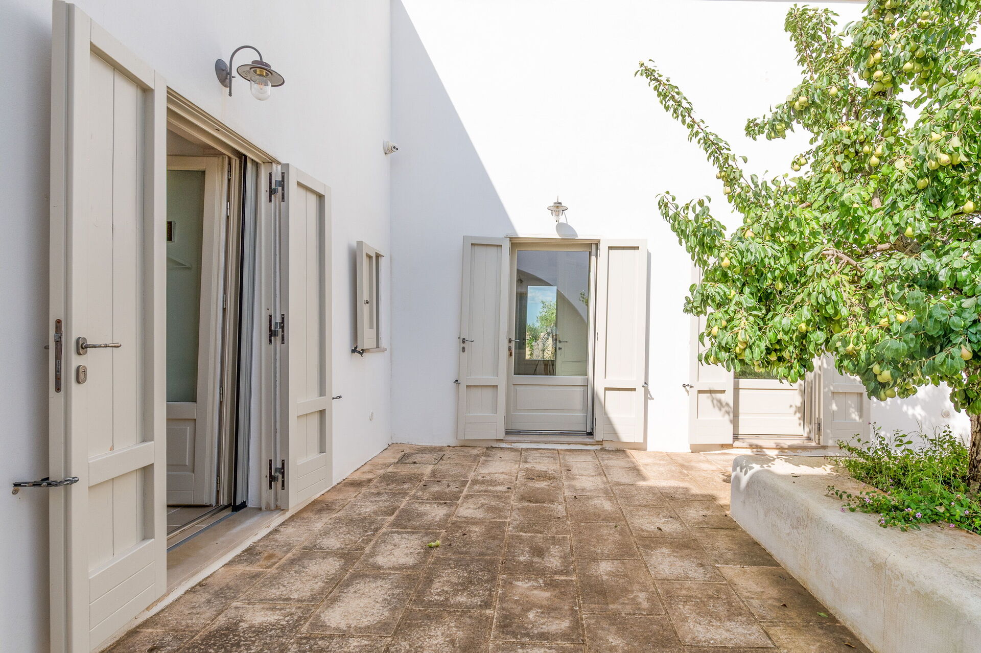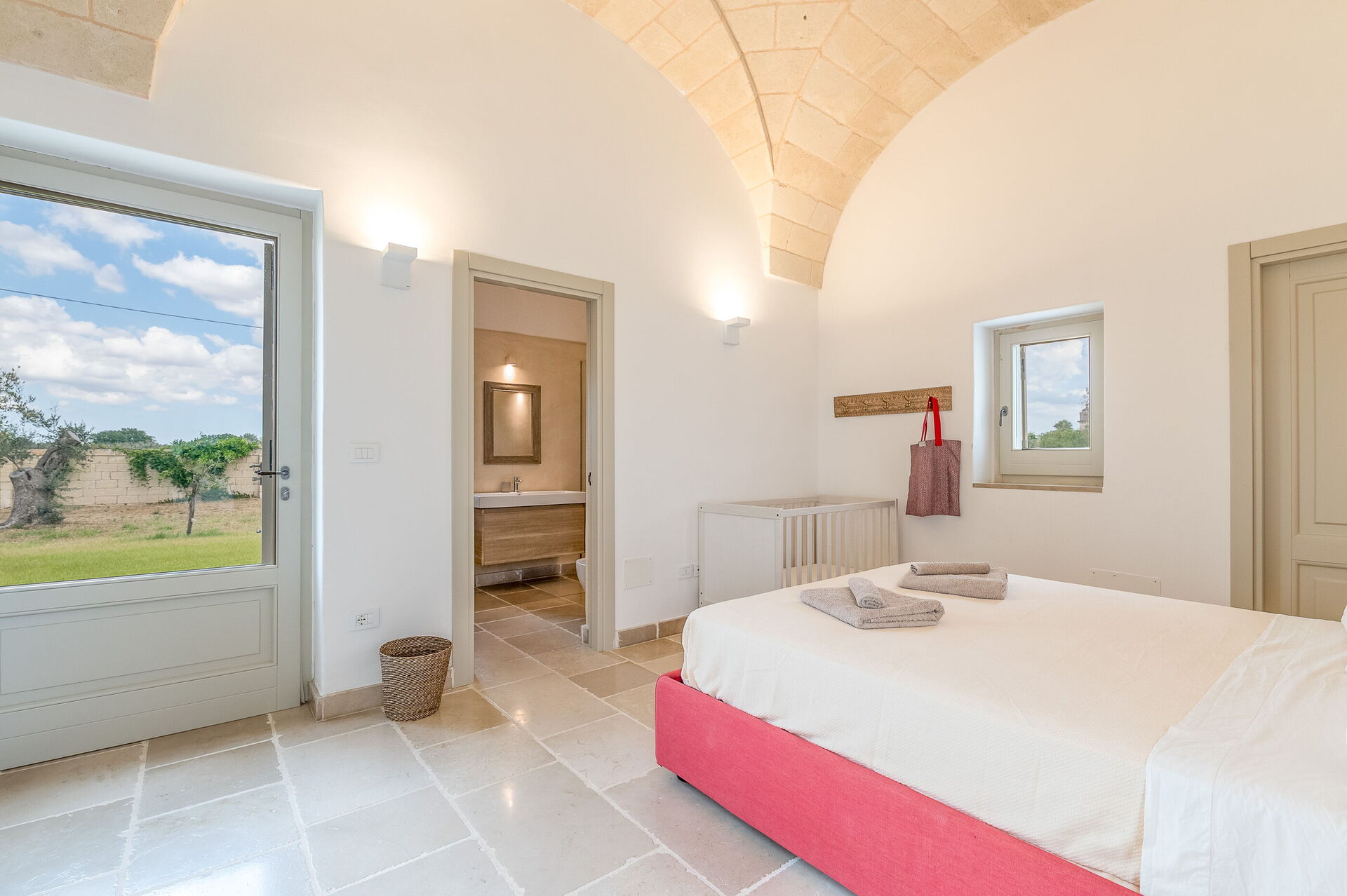 The annex boasts three additional bedrooms, each with its own en suite bathroom, arranged around a central courtyard. All the rooms have direct access to the garden and courtyard through lovely French doors. Moreover, two of the bedrooms can be connected via interior doors, perfect for families with little ones. You can access the main house through the outdoor courtyard.