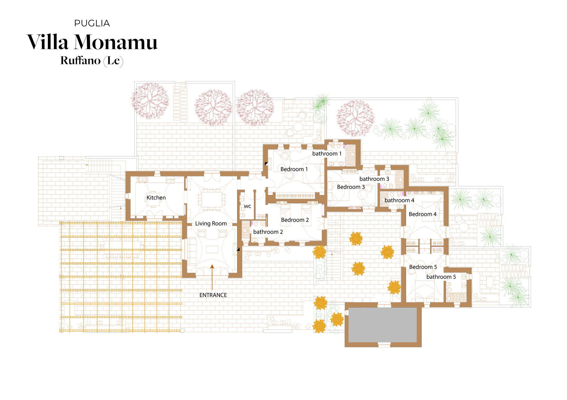 Consider renting Villa Monamu for a relaxing vacation in Puglia. This charming villa features vaulted farmhouse ceilings, local stone and cocciopesto bathrooms. It can accommodate up to ten guests in its five bedrooms and six bathrooms spread across two separate units. The main floor includes a spacious living room, dining room, a well-equipped kitchen, and access to a beautiful garden with a patio, covered veranda, and a 15x4m swimming pool.