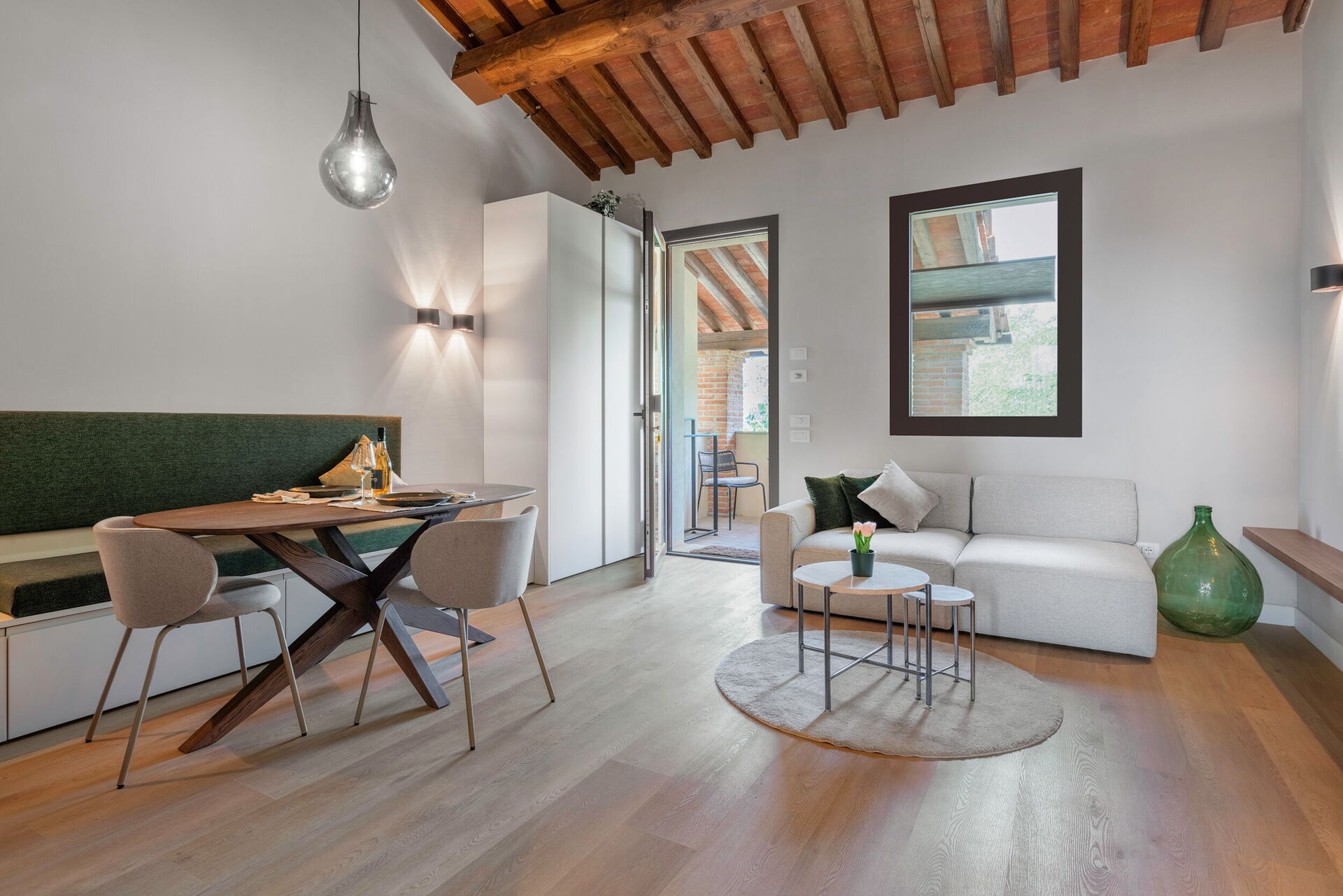 Keuken – woonkamer: goed uitgeruste keuken, eettafel, vaatwasser, ijskast, diepvriezer, oven, strijkijzer, italiaans koffiezetapparaat, bank (personen: 2), WIFI internet, airconditioning, hor, uitgang naar het balkon.