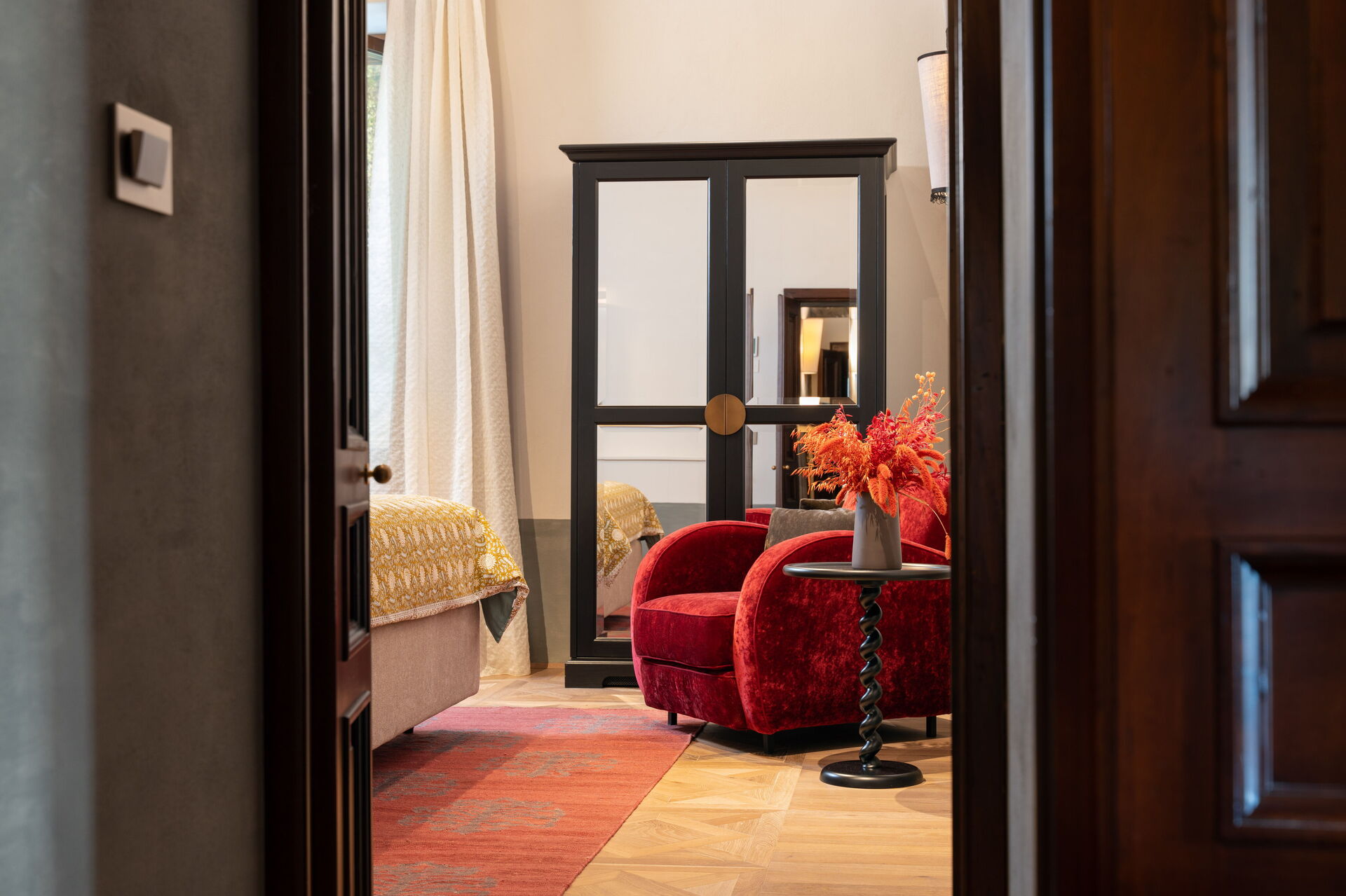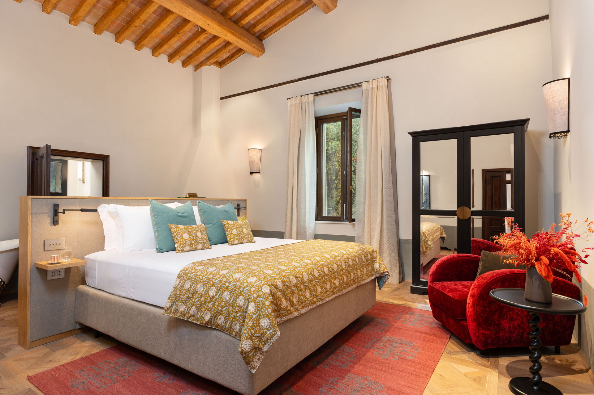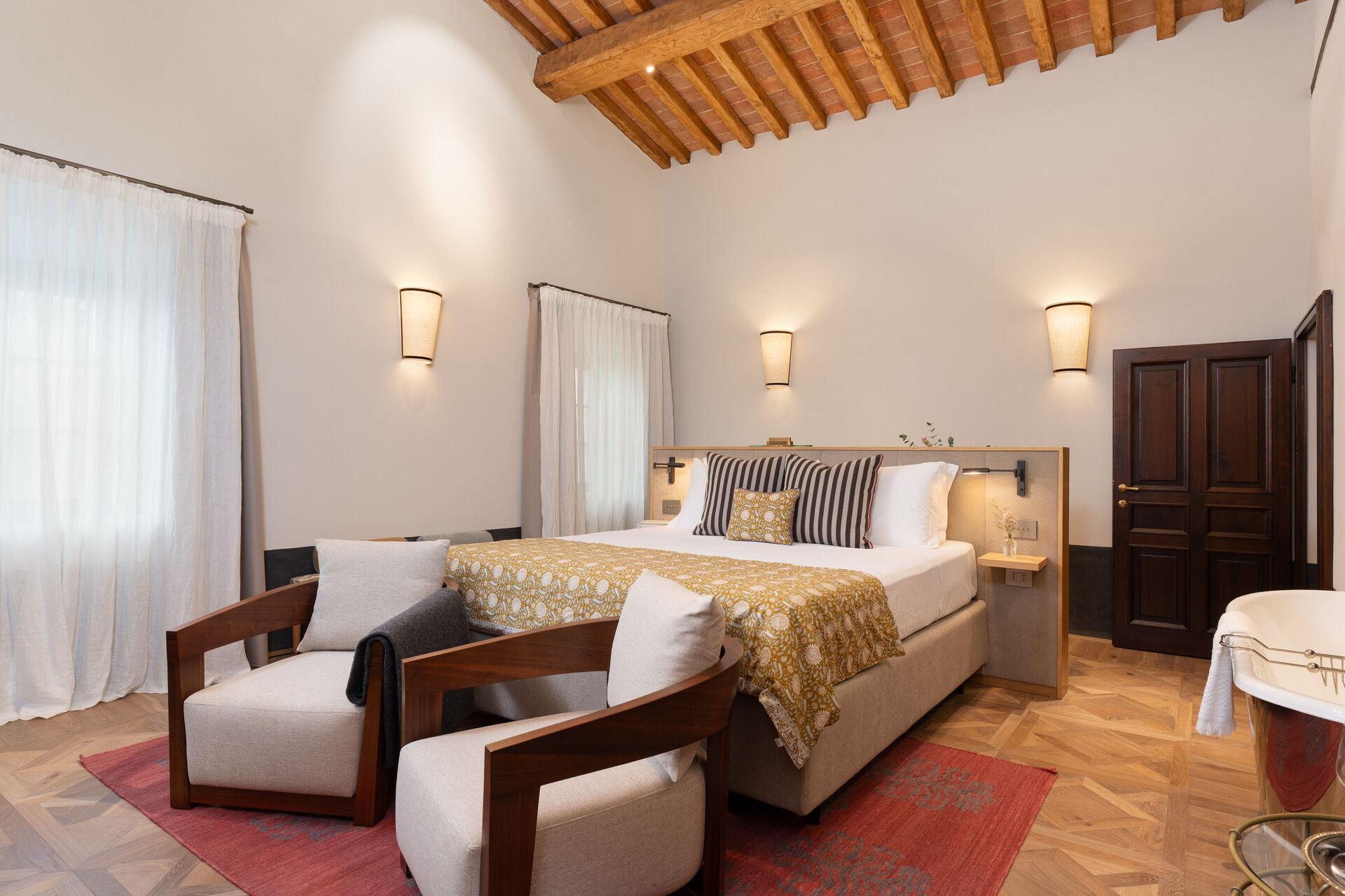 Slaapkamer met badkamer: king size bed (breedte: 180m, lengte: 200m), WIFI internet, airconditioning, wastafel, toilet , bidet, bad, douche, haardroger, uitgang naar het terras.