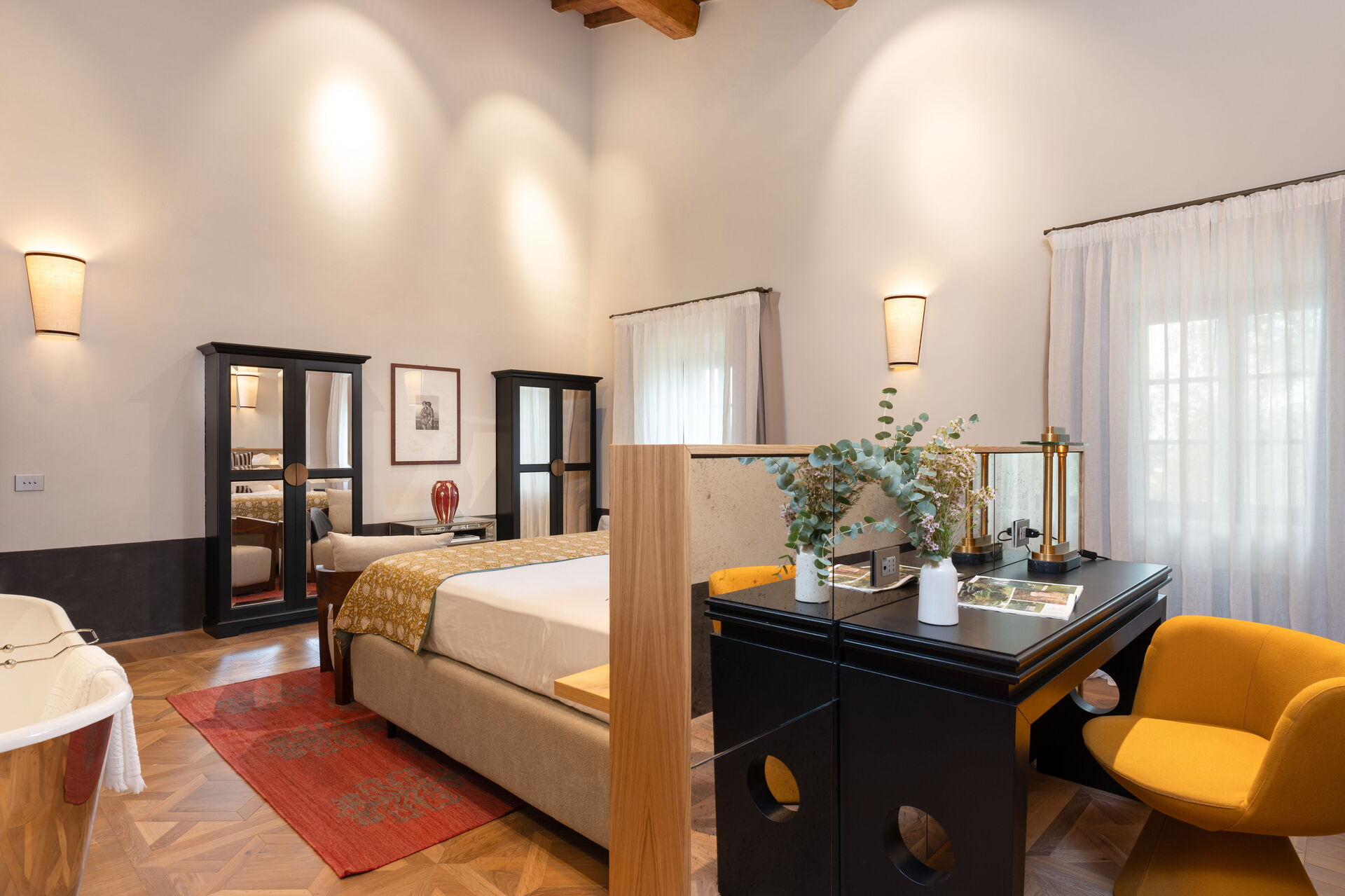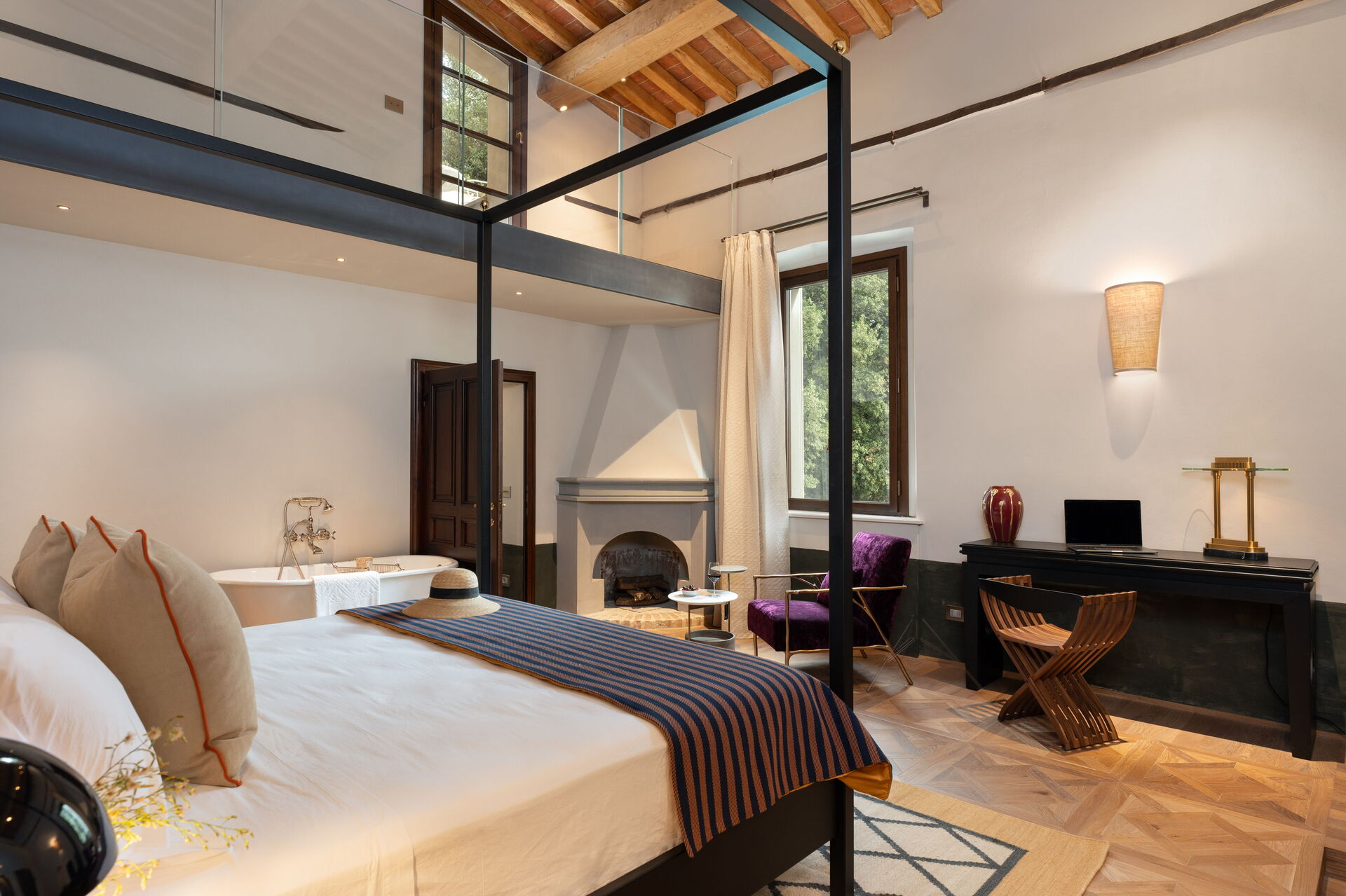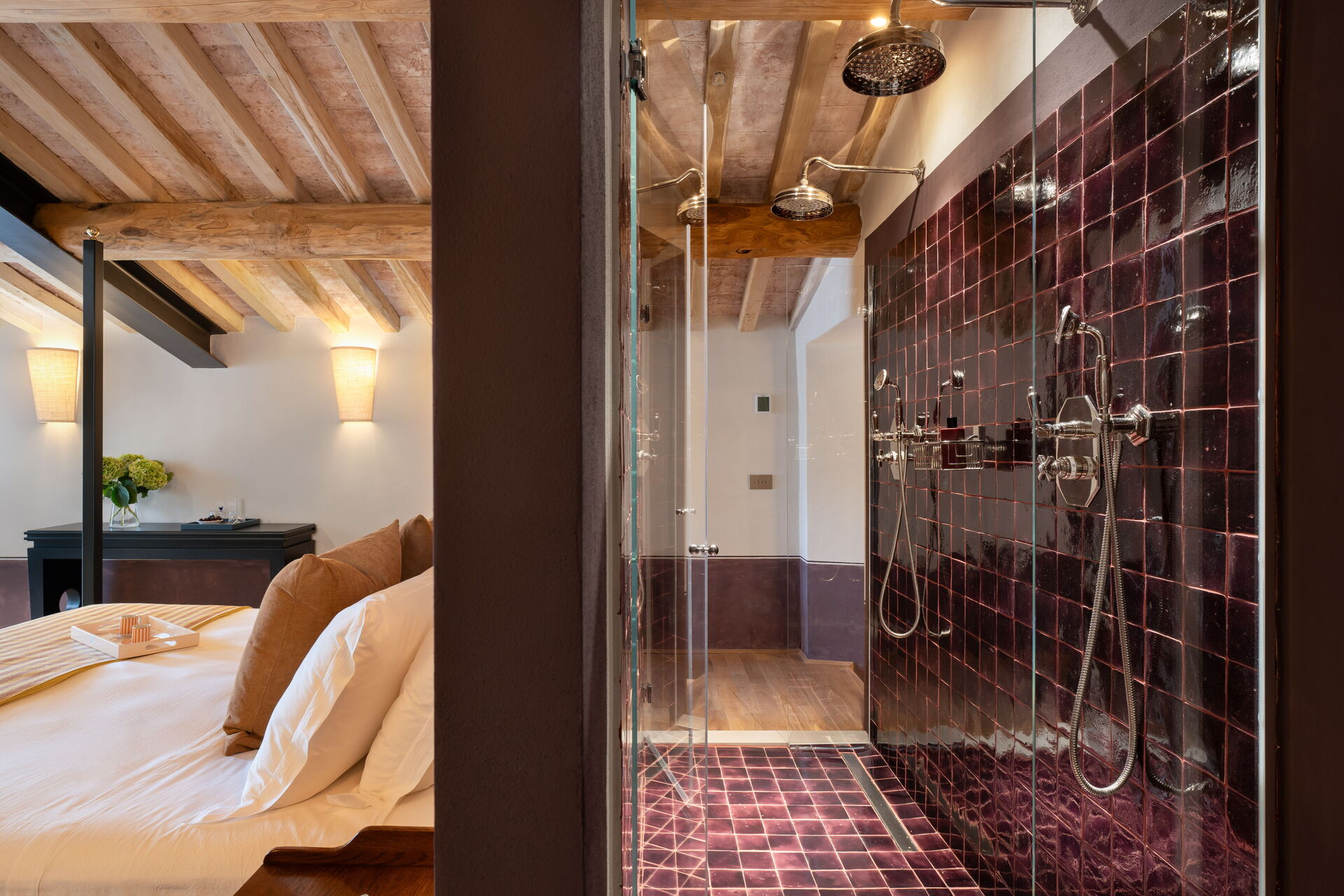 Slaapkamer met badkamer 2: king size bed (breedte: 180m, lengte: 200m), WIFI internet, airconditioning, wastafel, toilet , bidet, bad, douche, haardroger, uitgang naar het terras, vide.