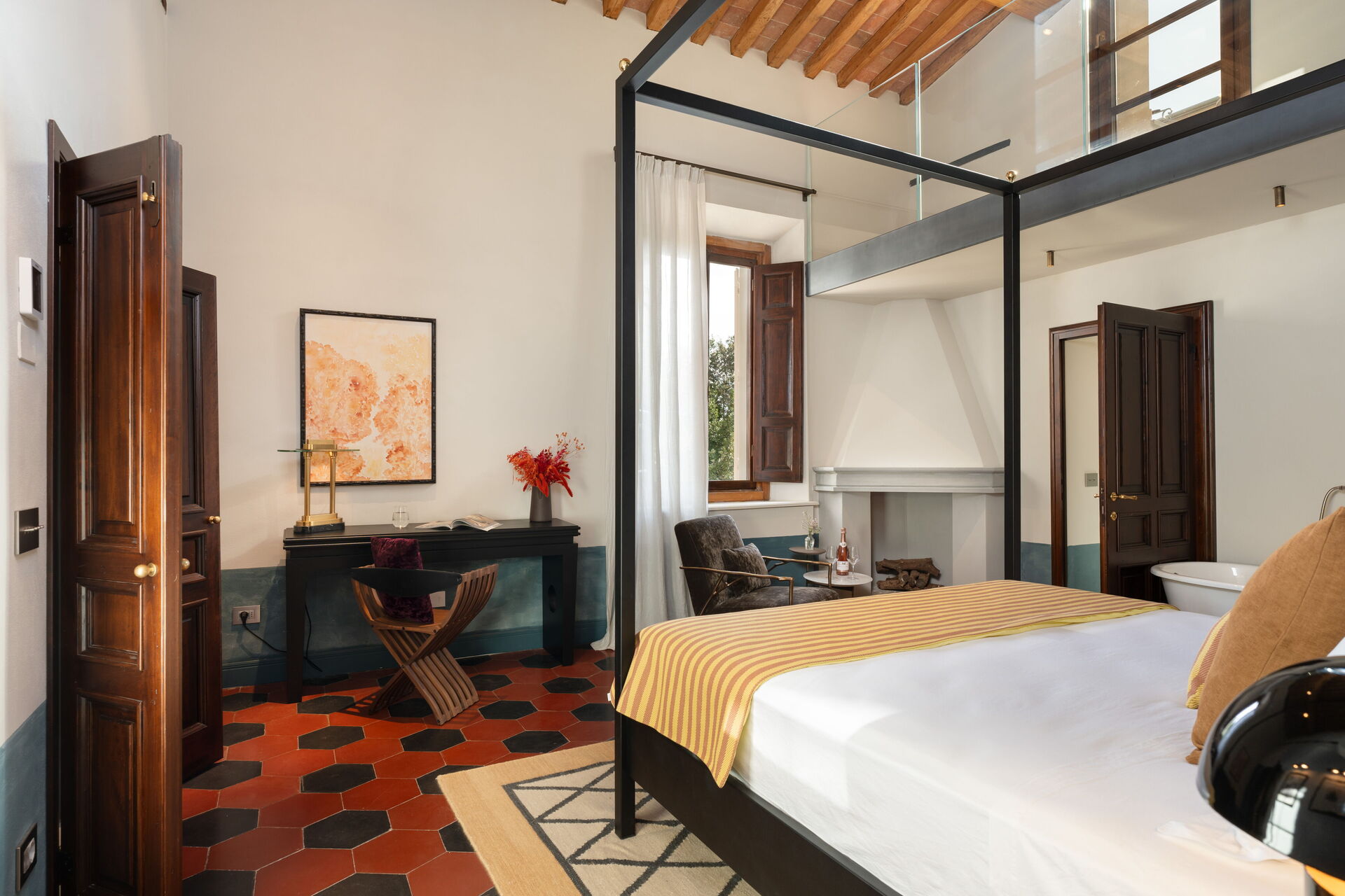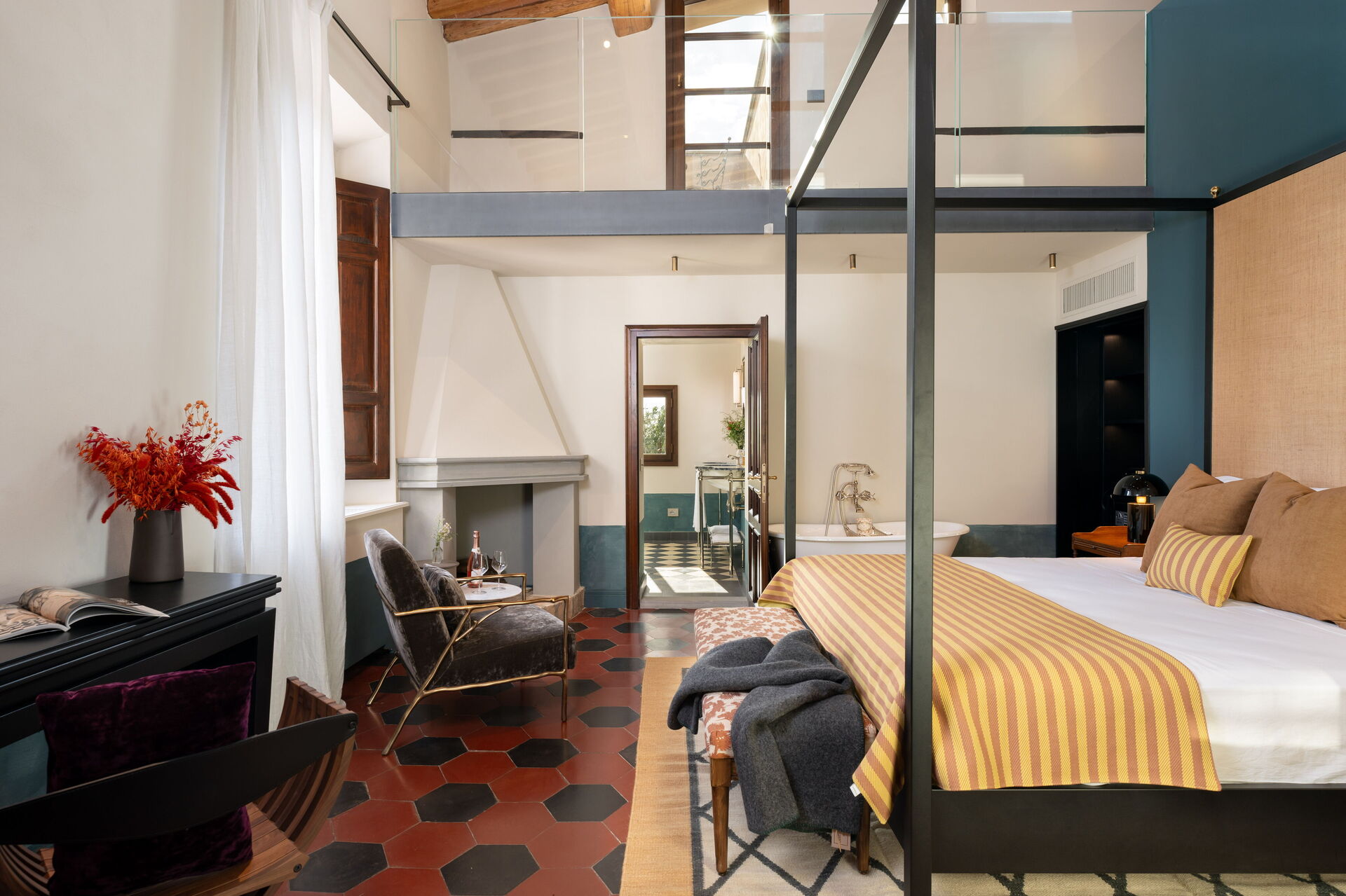 Slaapkamer met badkamer 1: king size bed (breedte: 180m, lengte: 200m), WIFI internet, airconditioning, wastafel, toilet , bidet, bad, douche, haardroger, uitgang naar het terras, vide.