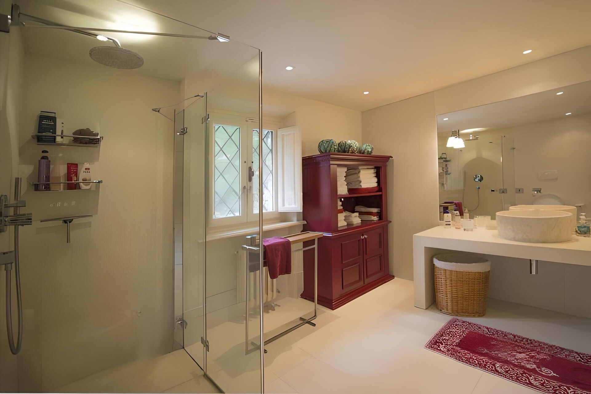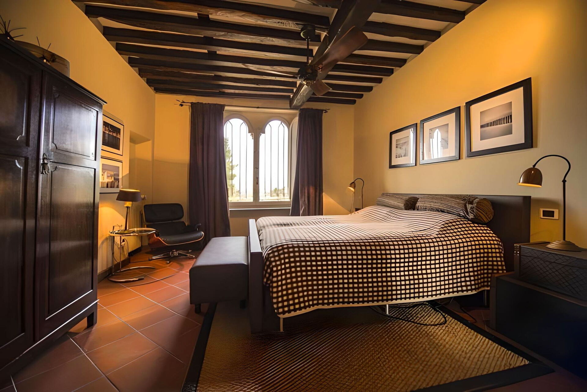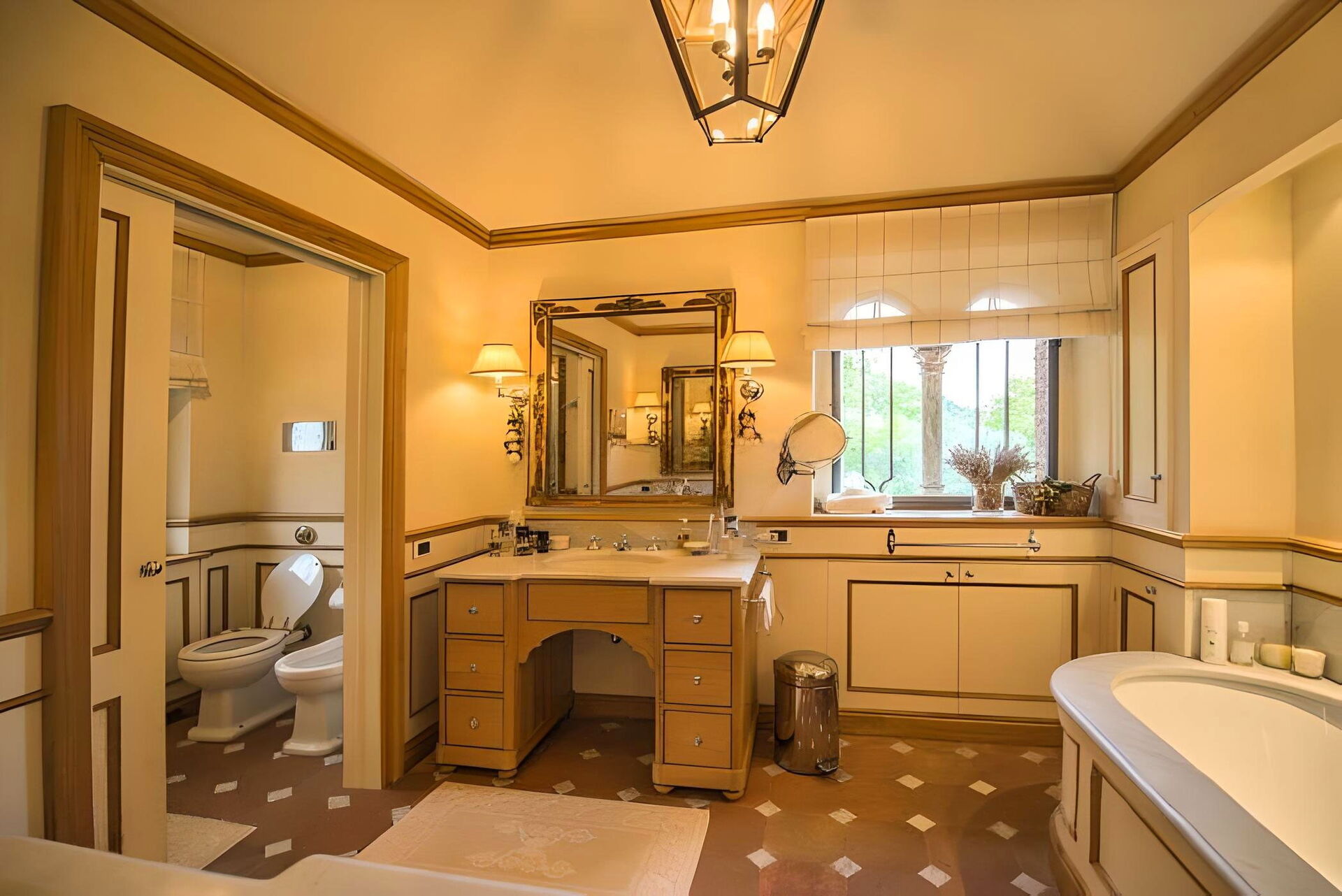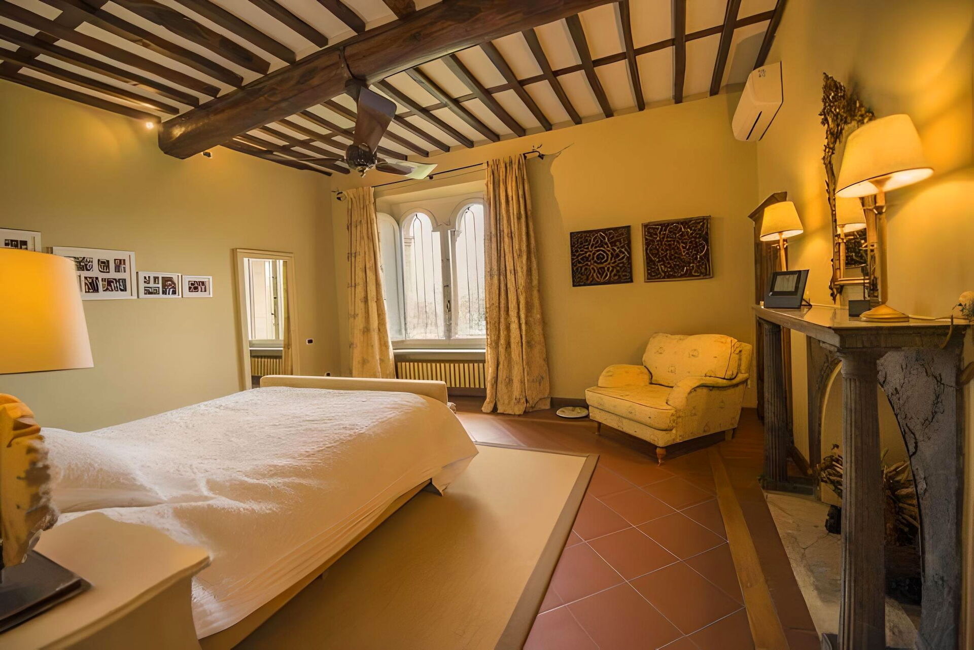Slaapkamer met badkamer: tweepersoonsbed, WIFI internet, airconditioning, hor, plafondventilator, dubbele wastafel, bidet, bad, douche, haardroger.
