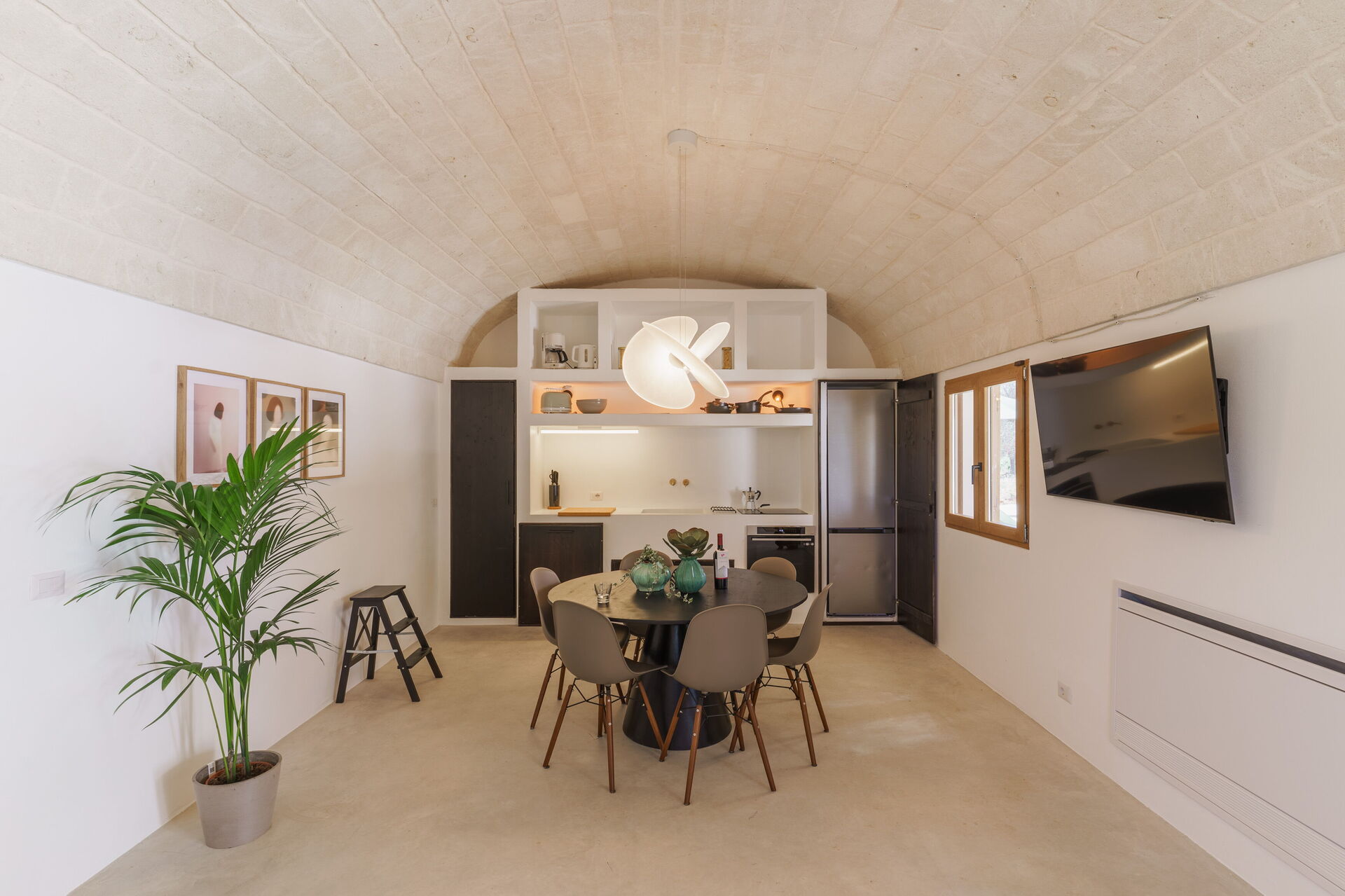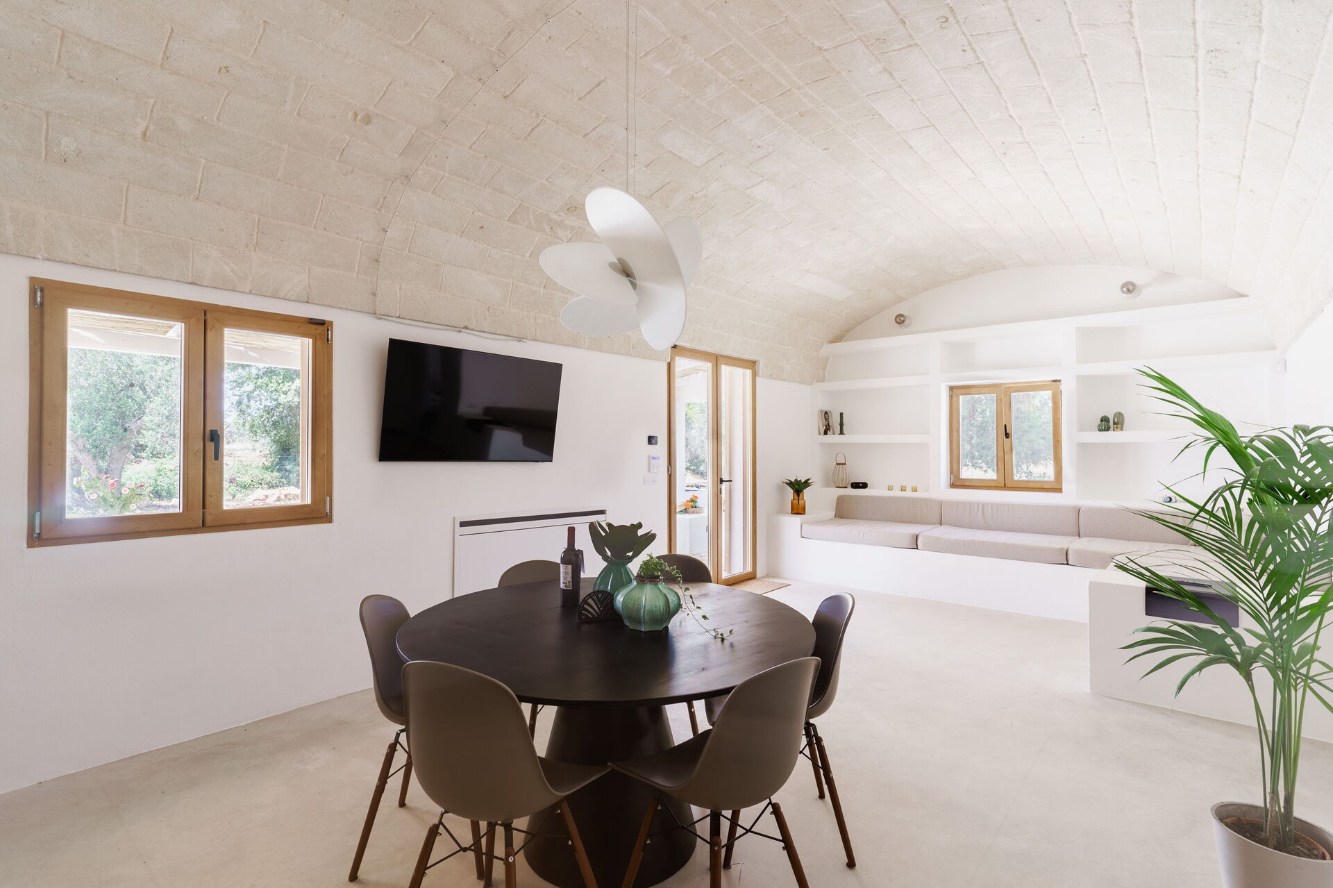 Keuken – woonkamer: goed uitgeruste keuken, eettafel, vaatwasser, ijskast, diepvriezer, magnetron, kookplaat, oven, wasmachine, bank, WIFI internet, airconditioning, uitgang naar de patio, uitgang naar de veranda.