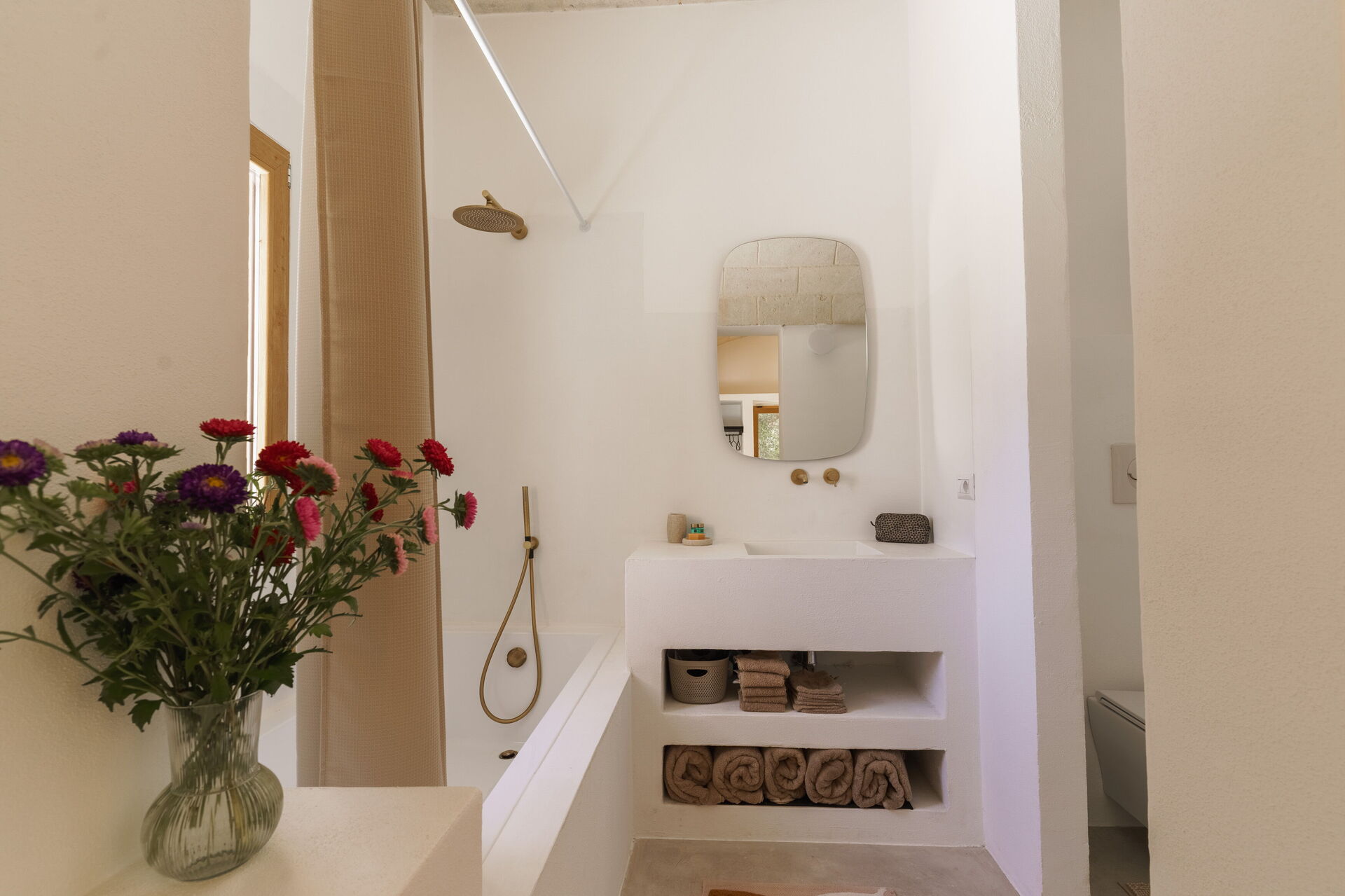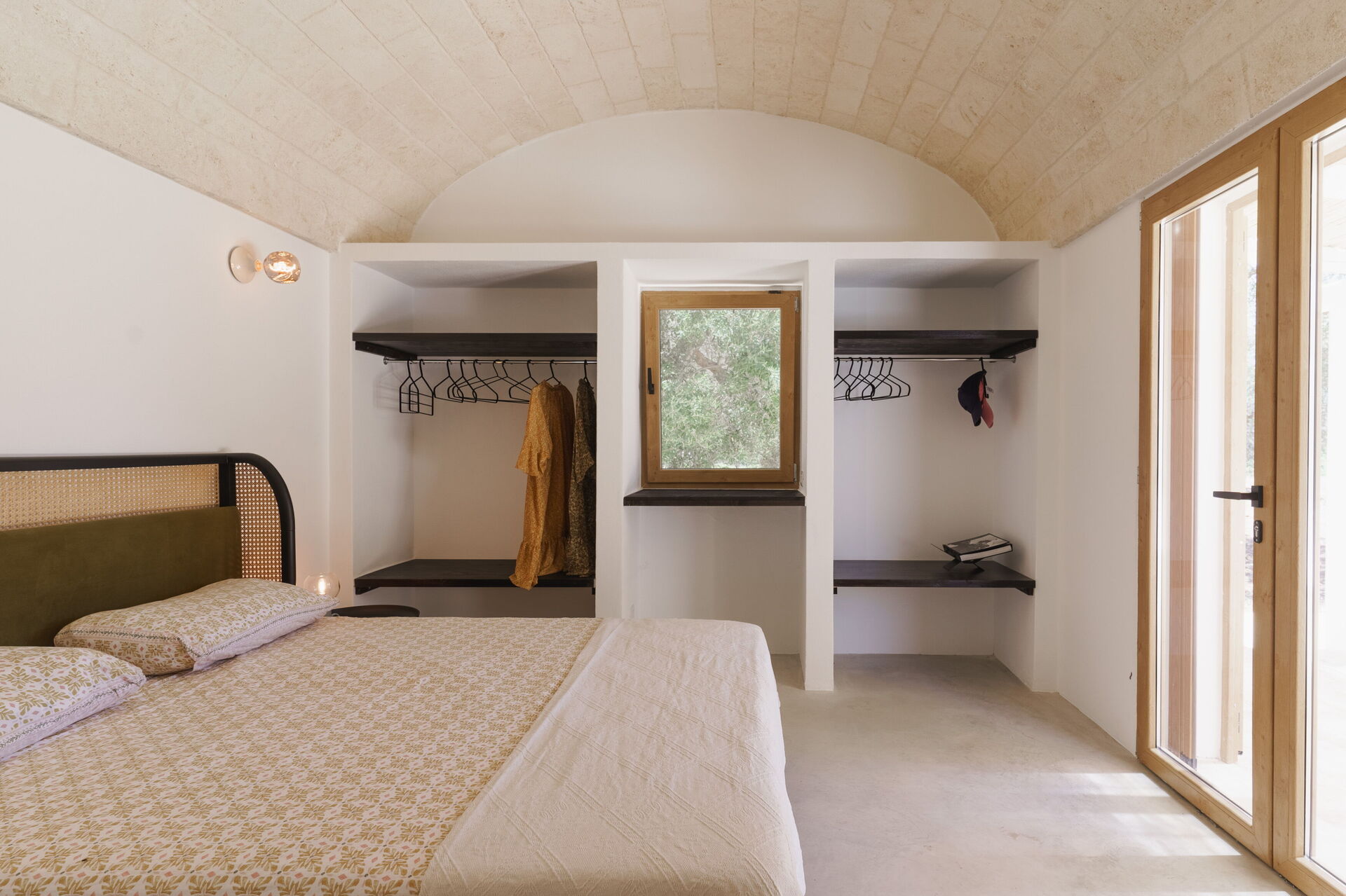Slaapkamer met badkamer: tweepersoonsbed, airconditioning, wastafel, toilet , bad, uitgang naar de tuin.