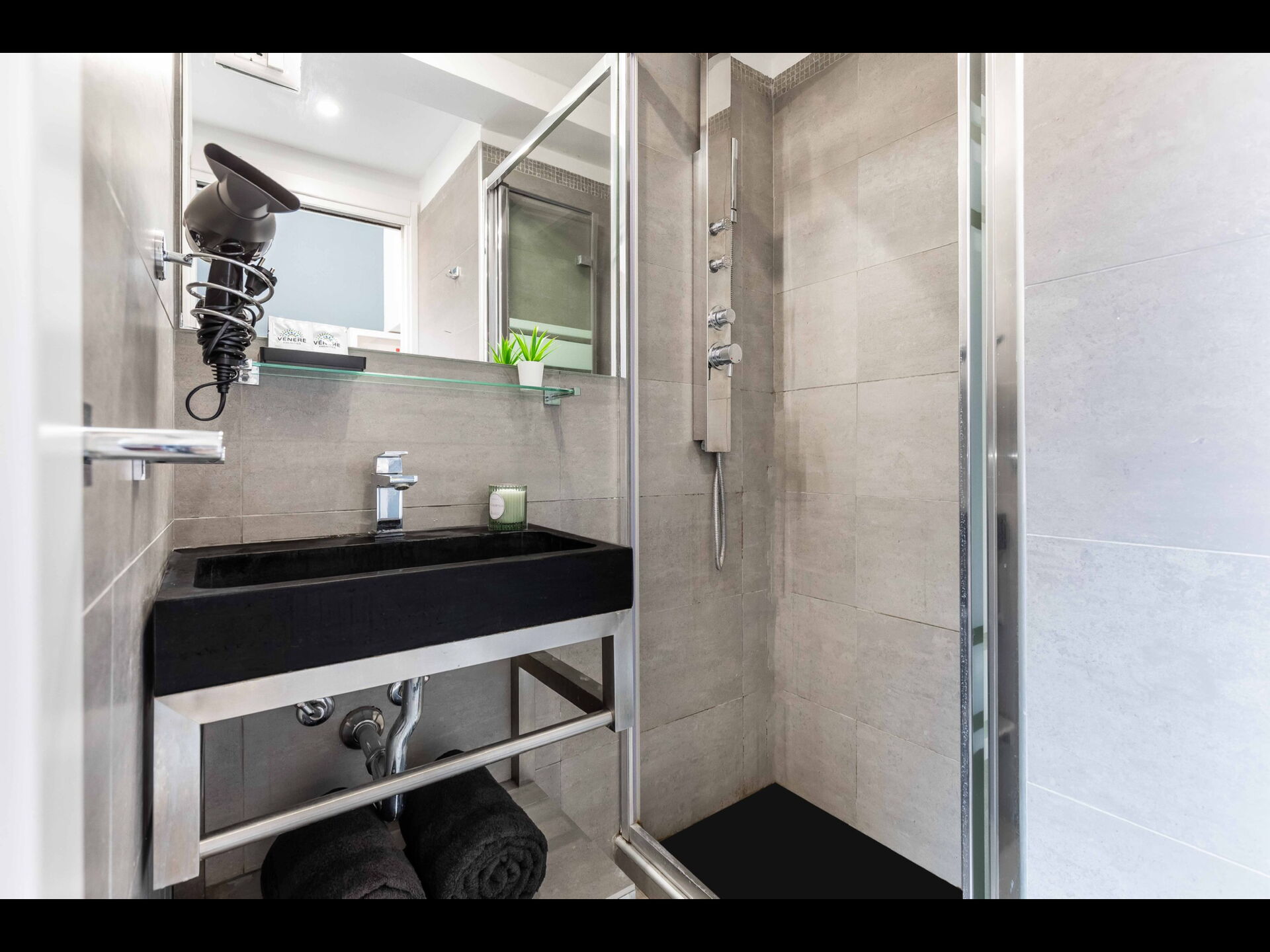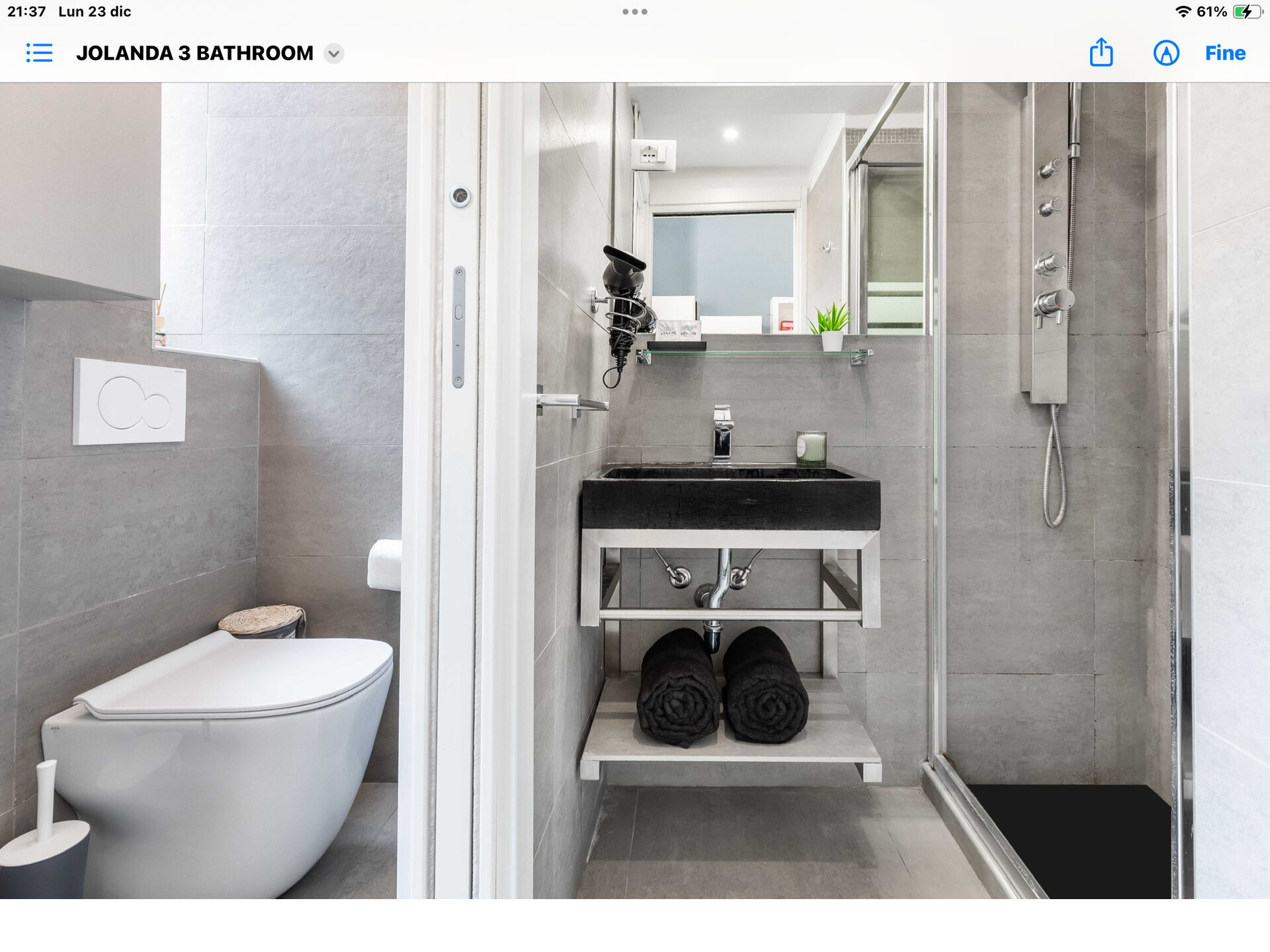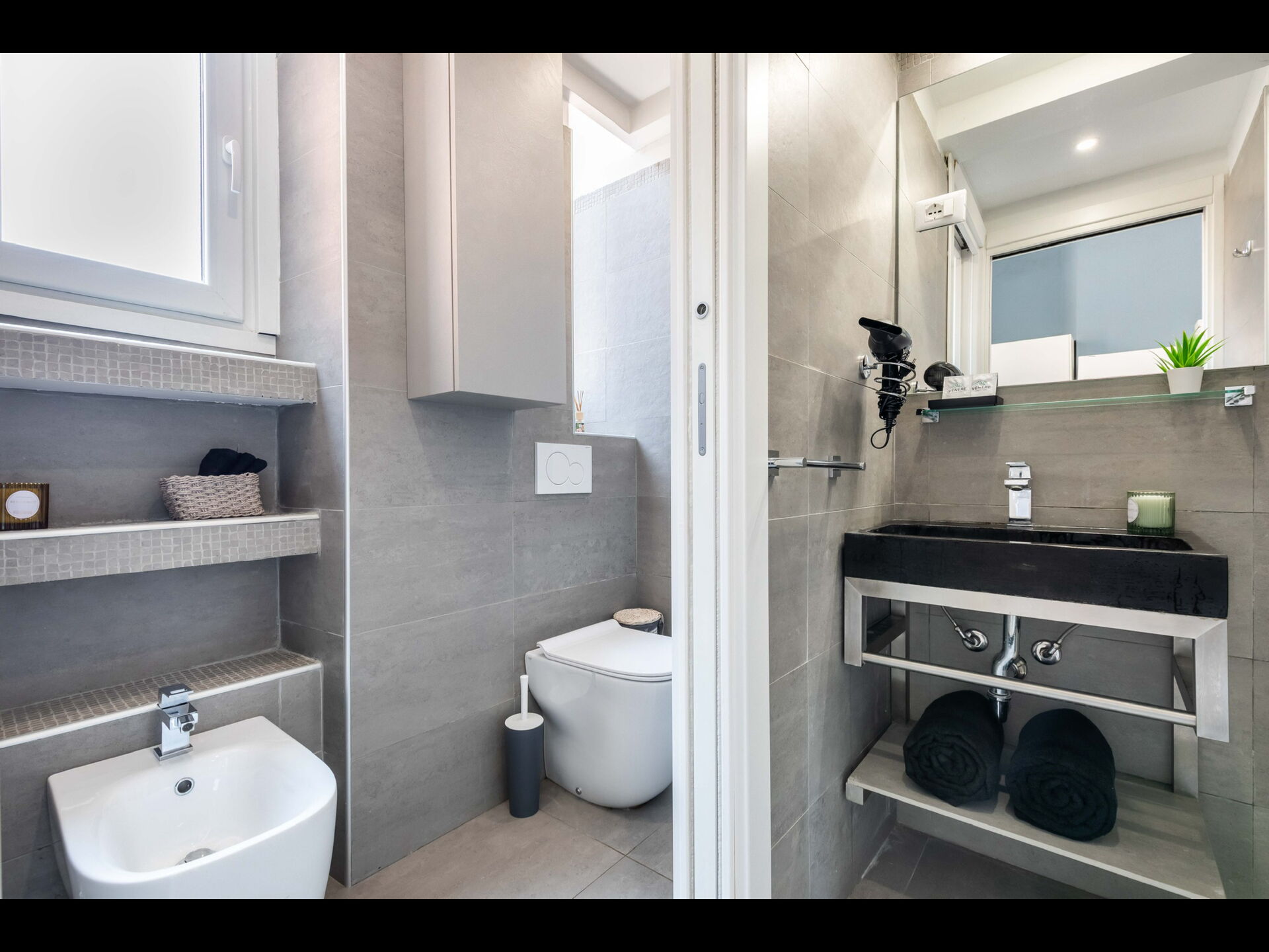 Badkamer: wastafel, toilet , bidet, douche, haardroger.