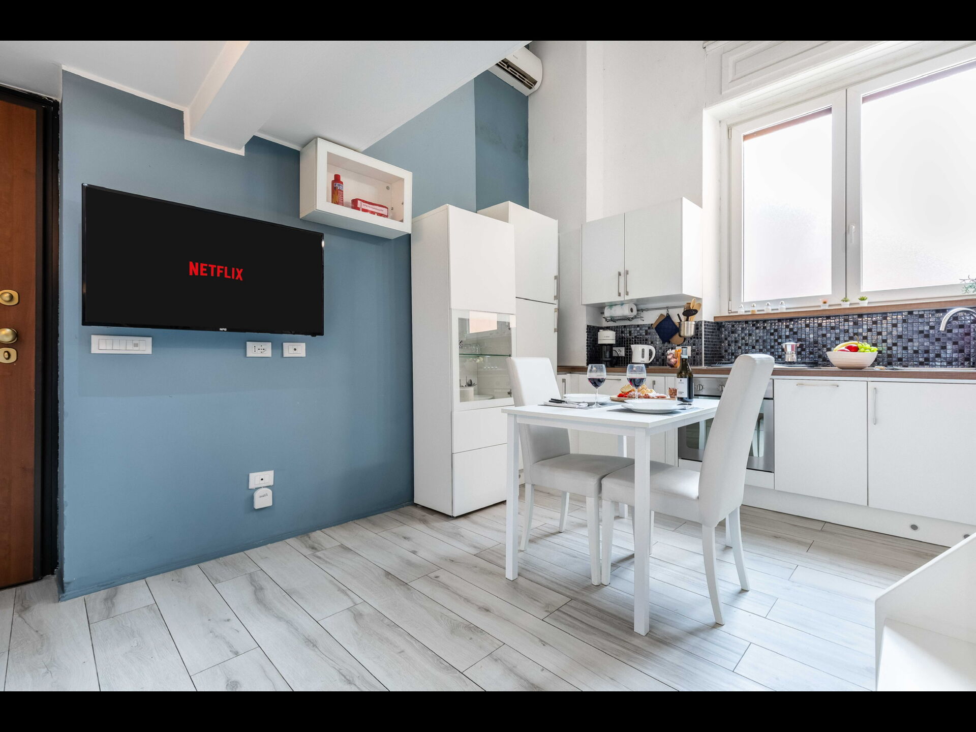 Keuken – woonkamer (28 m2): goed uitgeruste keuken, eettafel (personen: 4), vaatwasser, ijskast, diepvriezer, kookplaat, oven, strijkijzer, italiaans koffiezetapparaat, wasmachine, tweepersoons-slaapbank (breedte: 1.4m, lengte: 1.8m), WIFI internet, airconditioning, tv, rookmelder, co2 detector, uitgang naar de patio.