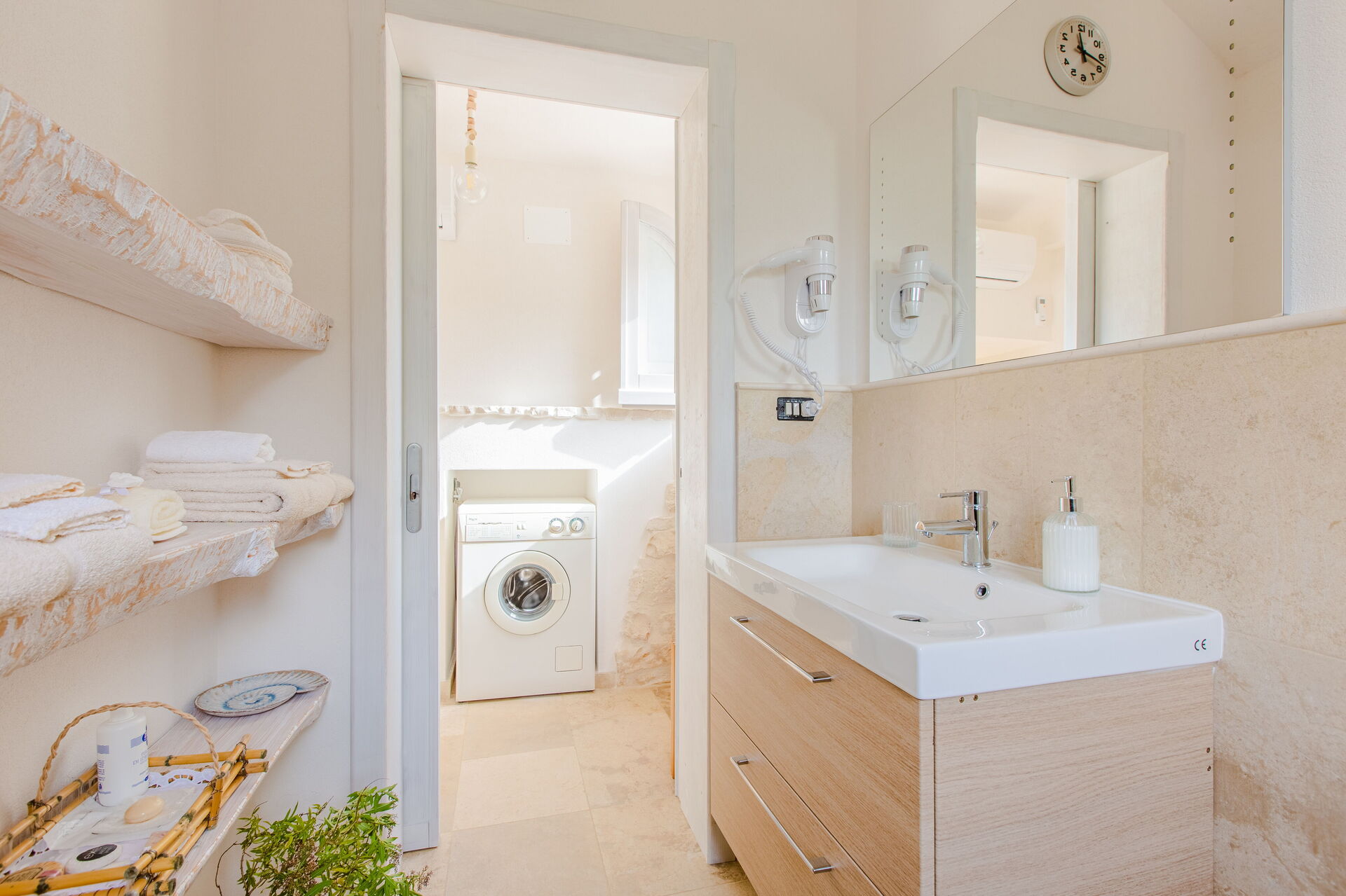 Badkamer: wastafel, toilet , bidet, douche, haardroger, wasmachine.