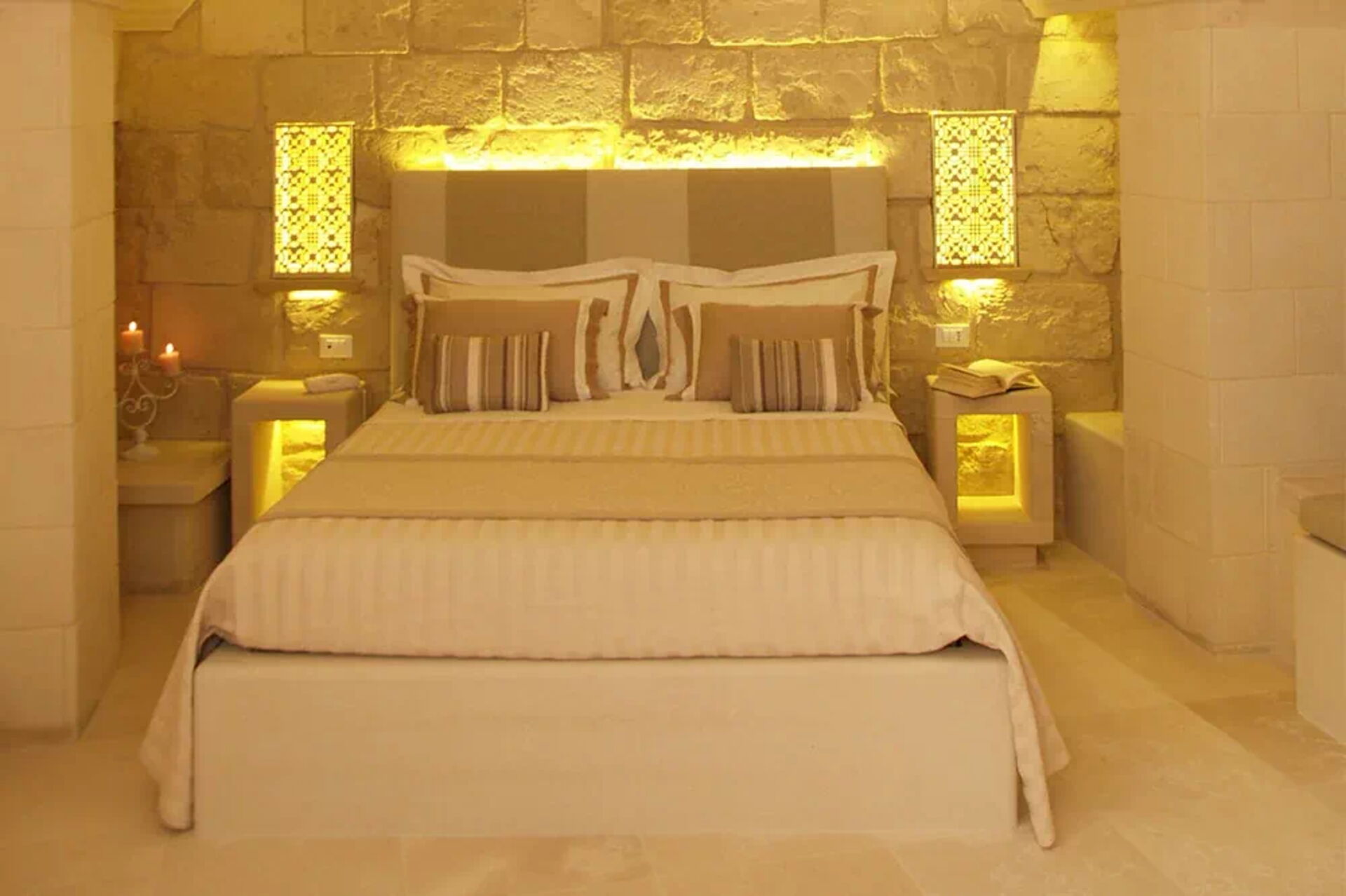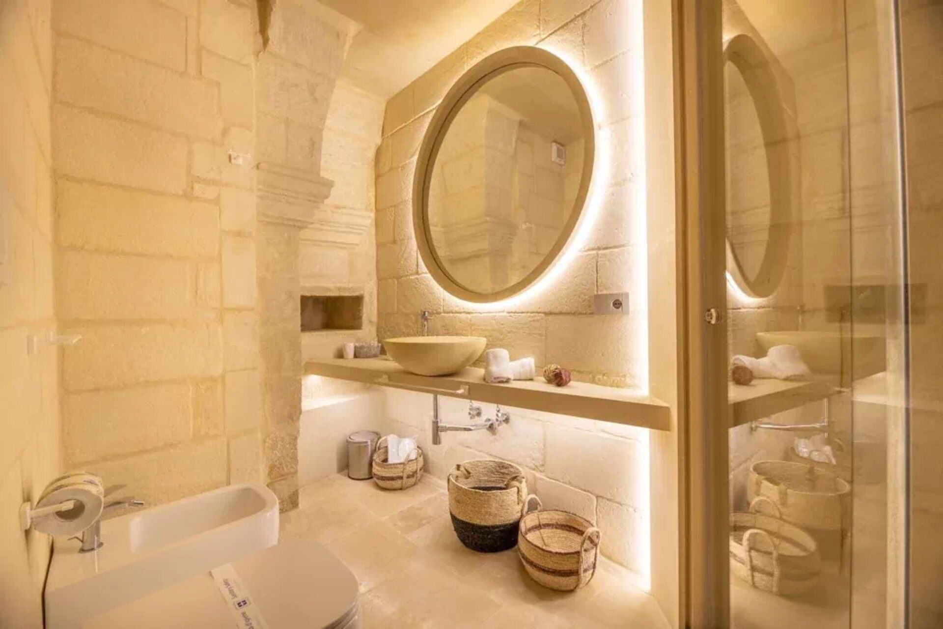 The Majorca suite, made of stone and furnished with care, offers a private Jacuzzi tub in the living area. The bathroom sink is made from a Salento baroque capital, rich in details and symbolism, for an unforgettable stay.