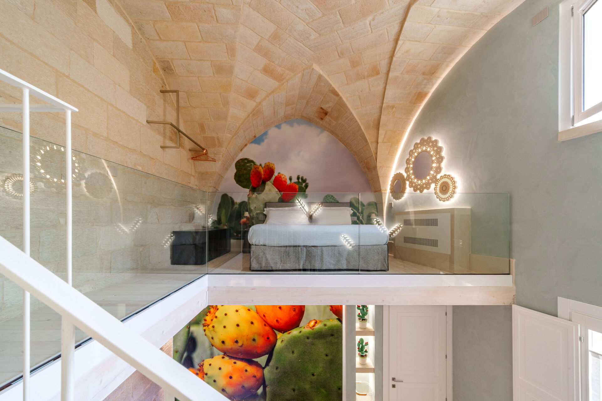 La Drusilla, one of the most elegant rooms, is divided into several areas and has a mezzanine. On the ground floor there is a whirlpool tub and the bathroom area, while the sleeping area is located in the upper part, accessible via a large staircase in Lecce stone. Prints depicting the typical "prickly pear blades" add a local touch.