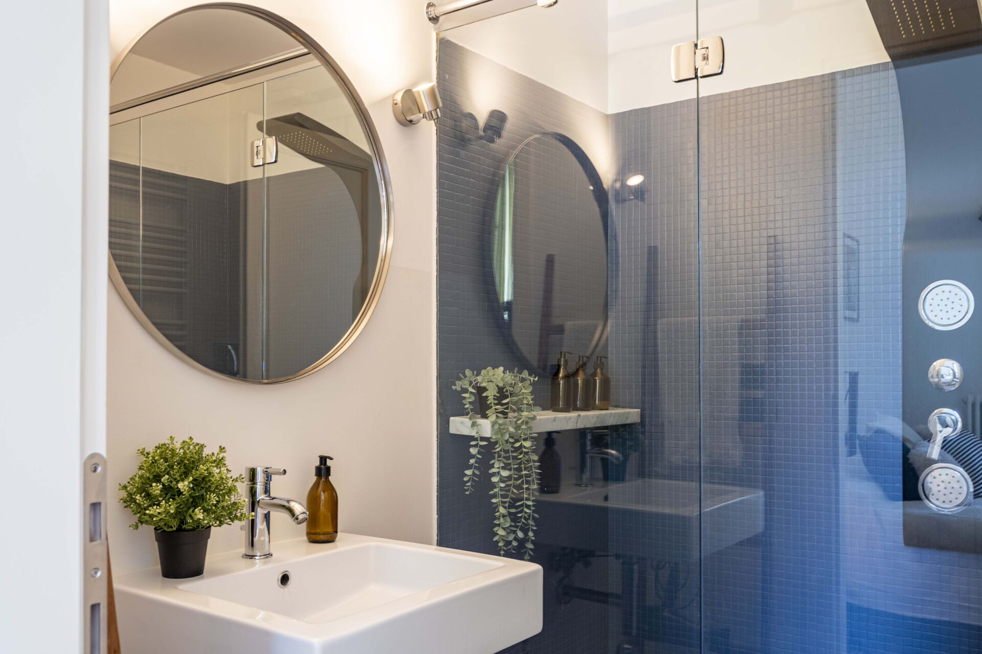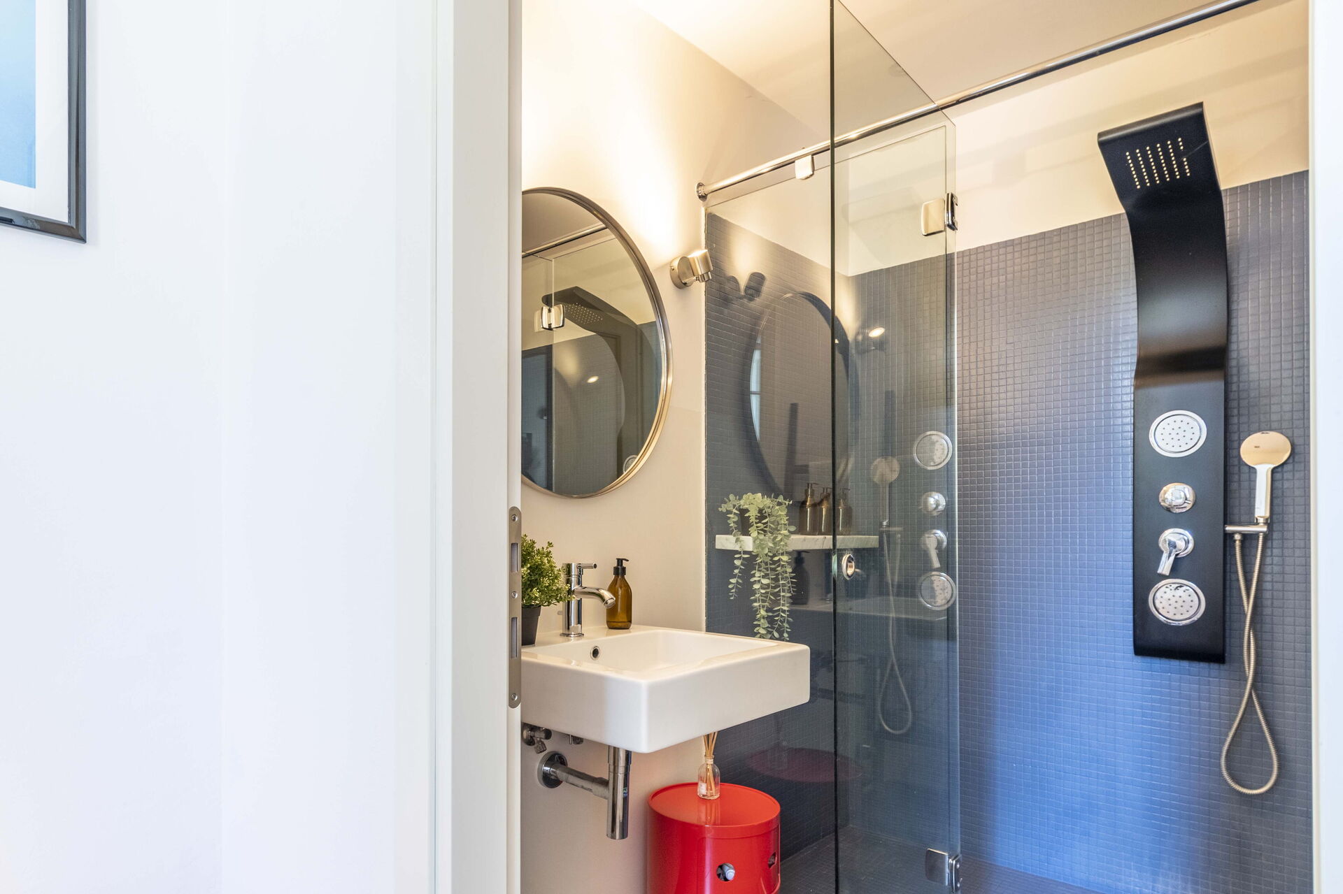 Badkamer: wastafel, toilet , bidet, douche, haardroger.