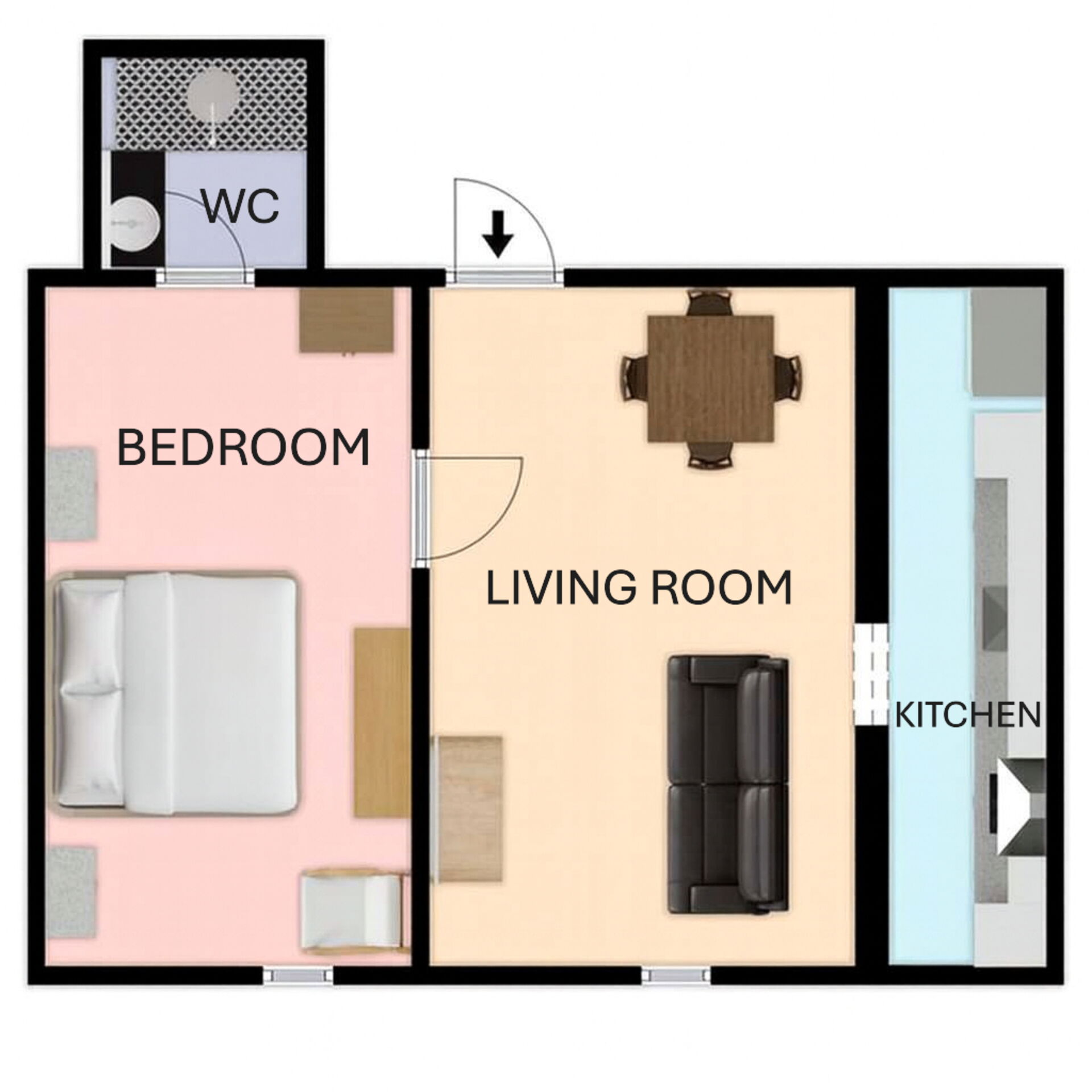 Met: keuken, woonkamer, slaapkamer, badkamer.