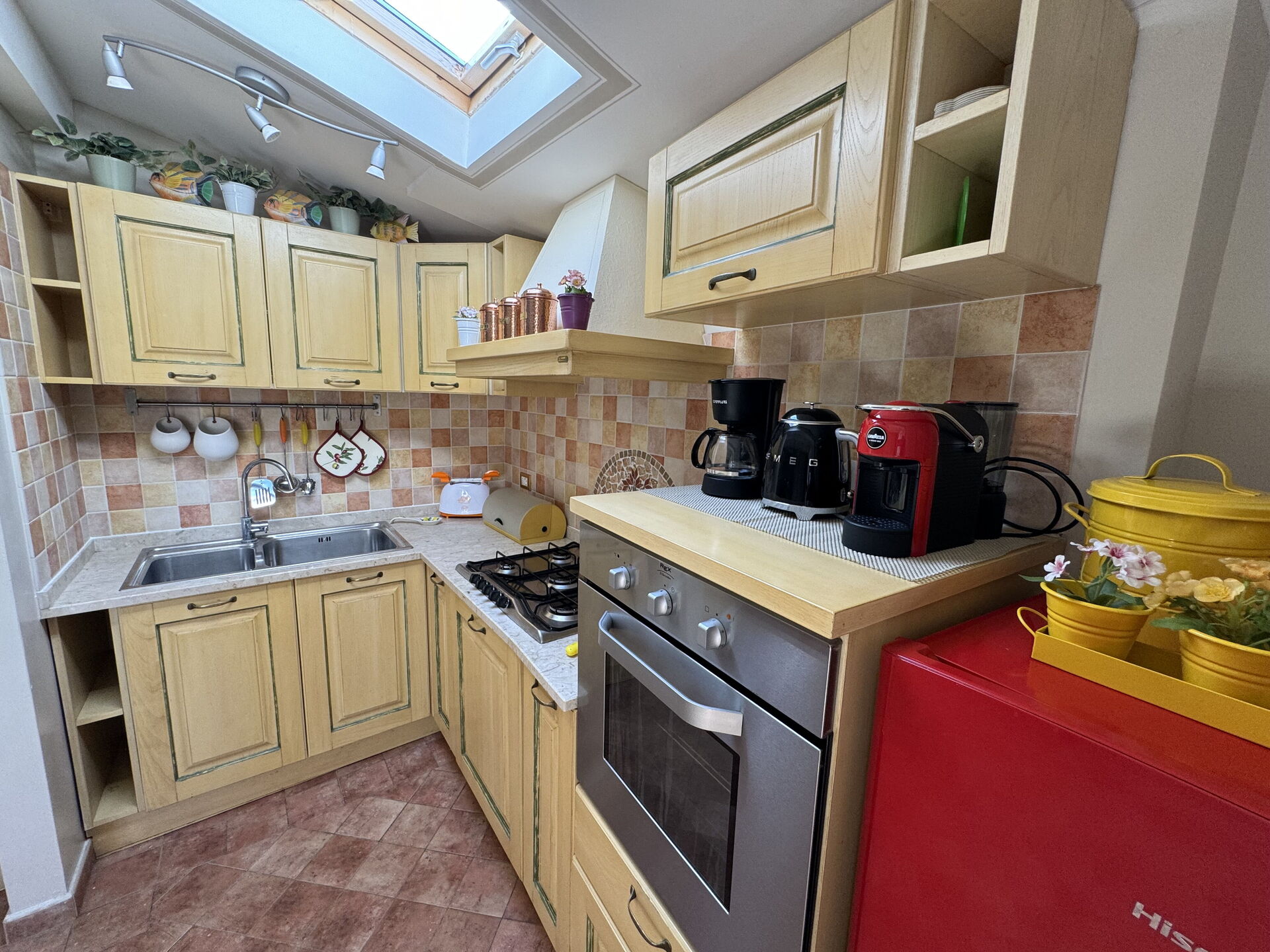 Keuken: goed uitgeruste keuken, eettafel (personen: 6), vaatwasser, ijskast, diepvriezer, kookplaat, oven, broodrooster, strijkijzer, italiaans koffiezetapparaat, koffiezetapparaat, WIFI internet, airconditioning, hor, tv.