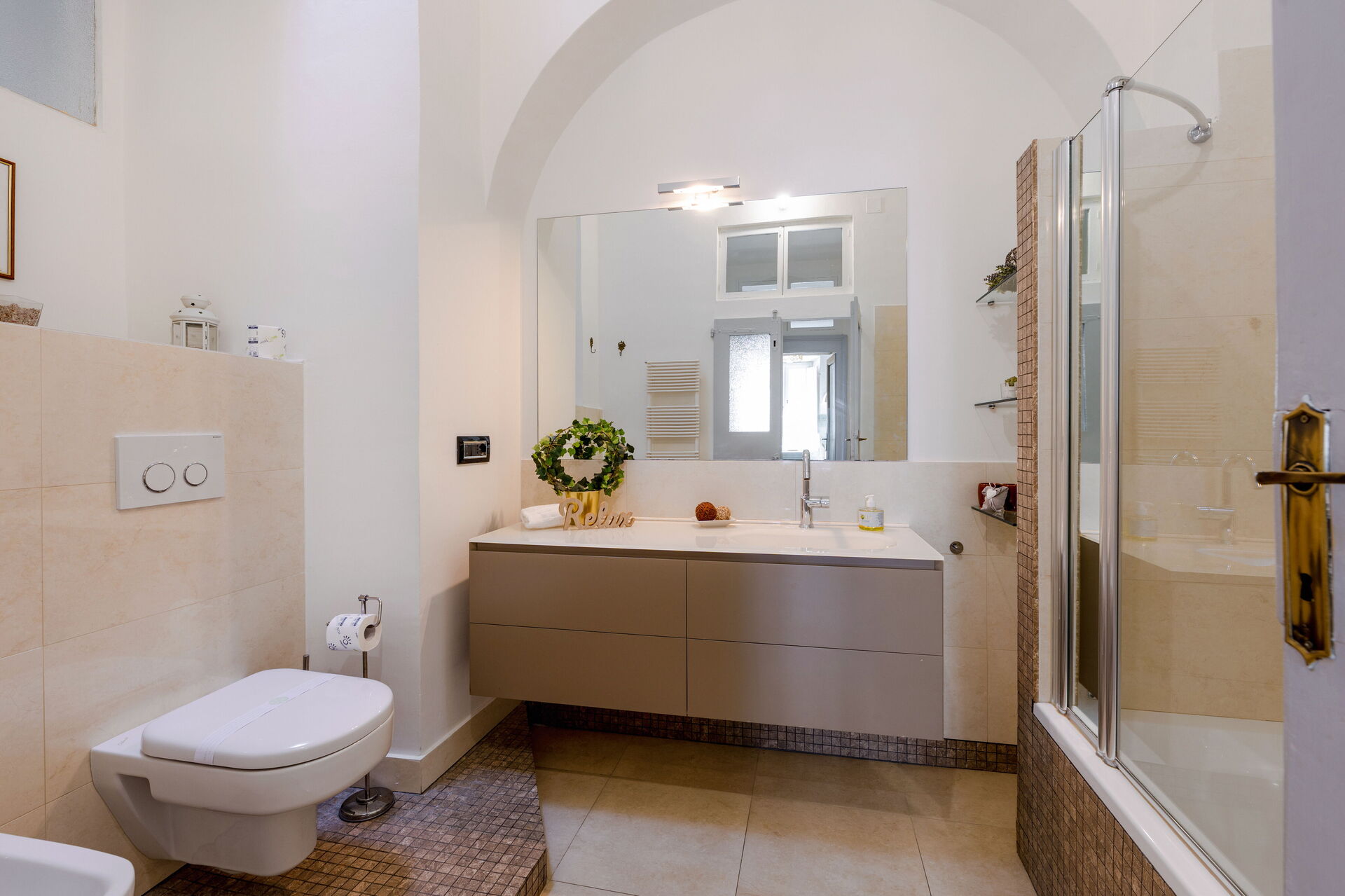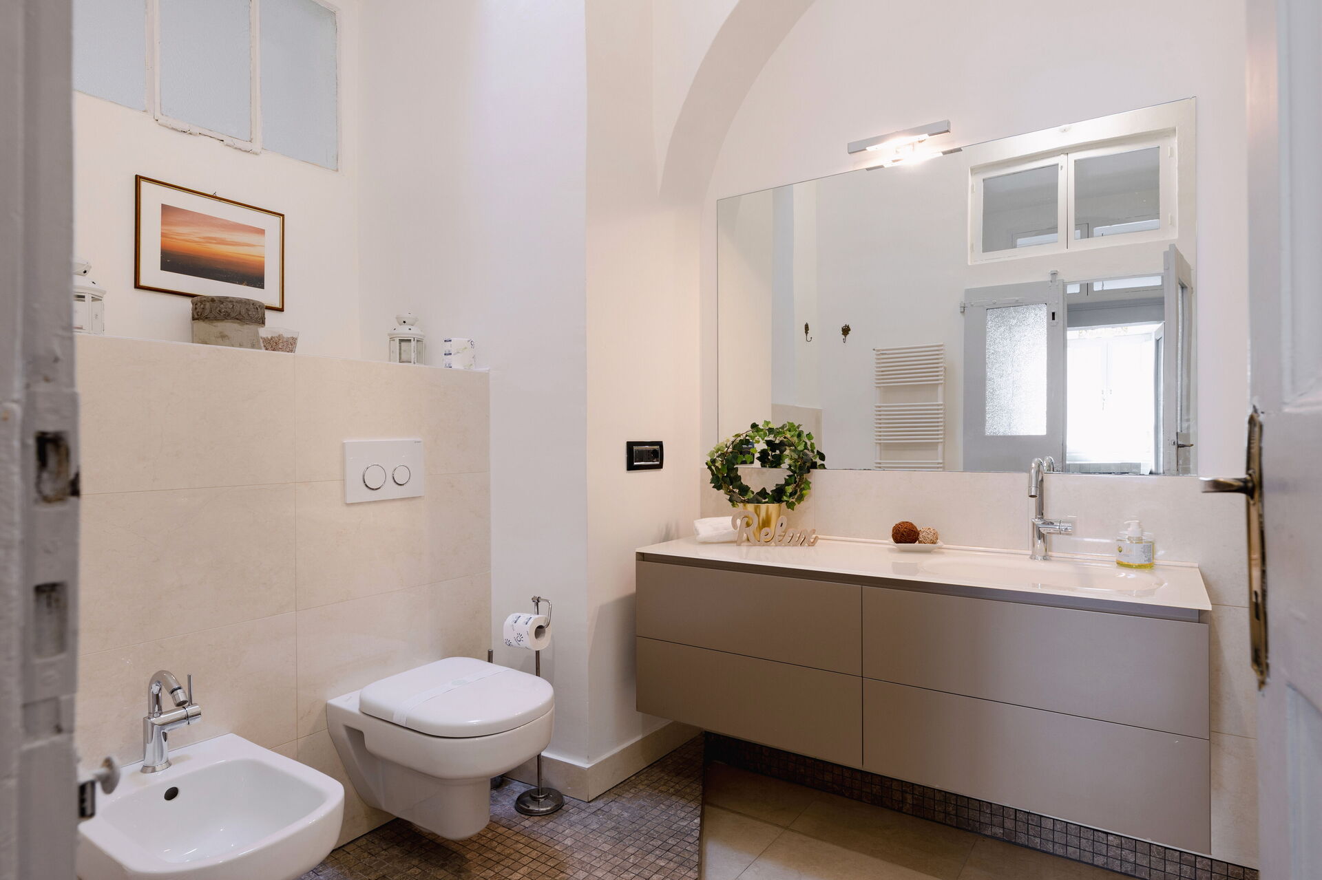 Badkamer: wastafel, toilet , bidet, douche, haardroger.