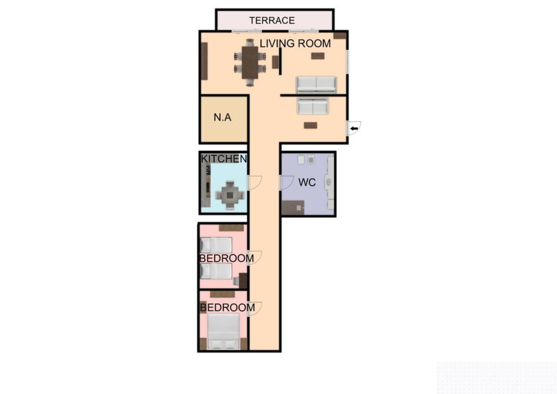 Woonkamer: bank, bureau, eettafel, WIFI internet, internet, satelliet tv, uitgang naar het balkon.