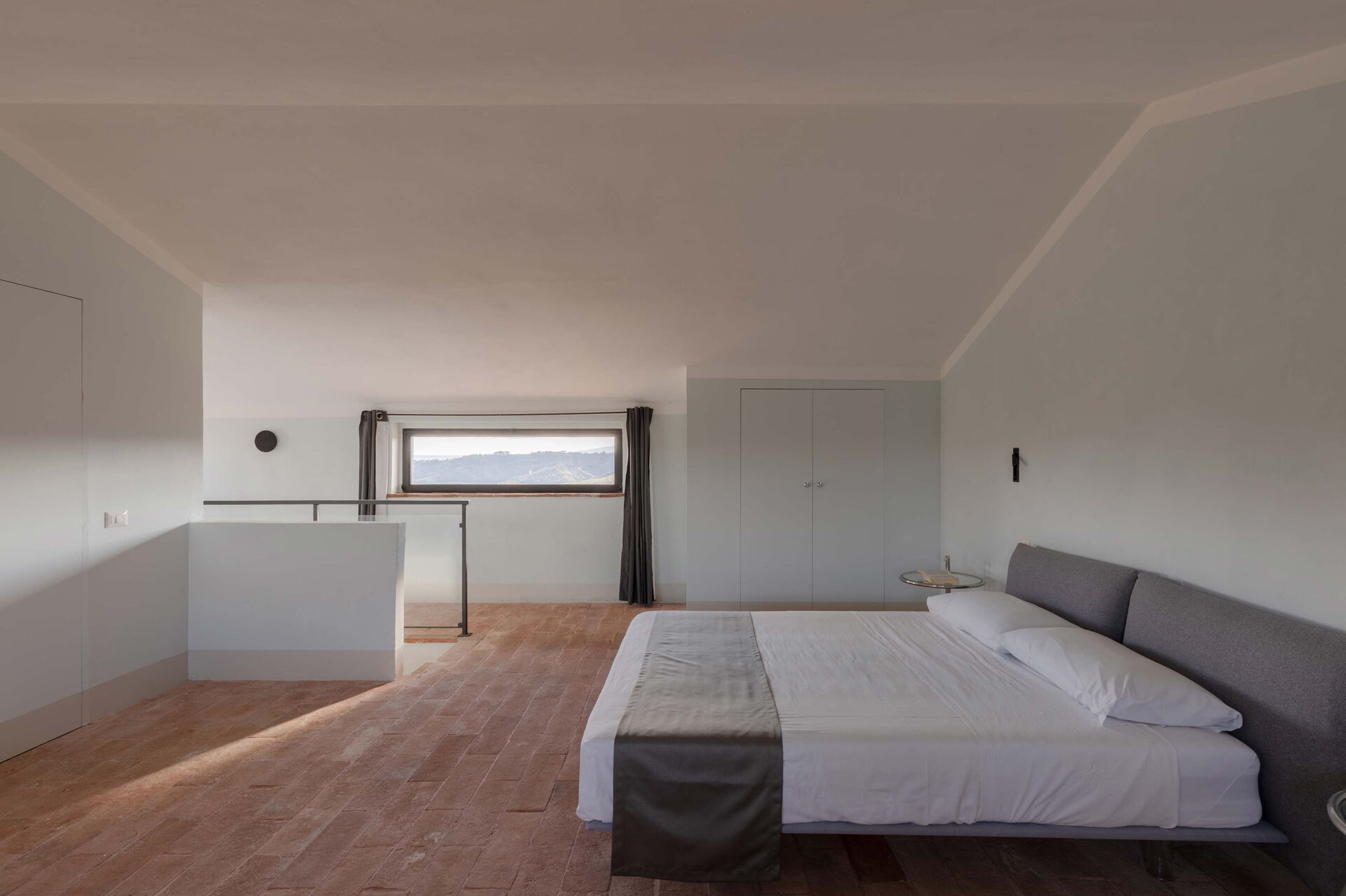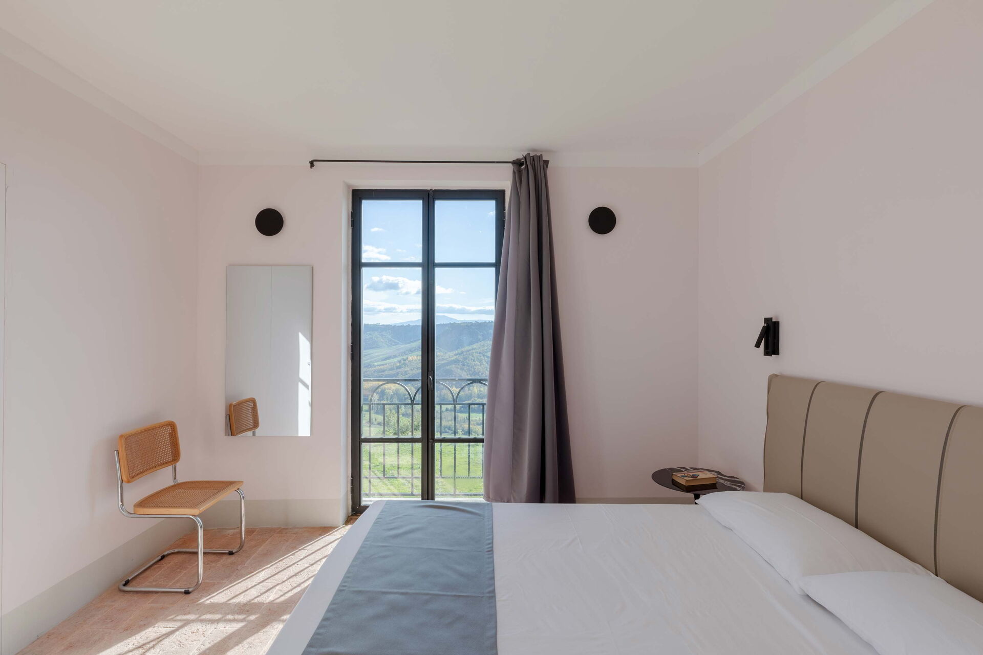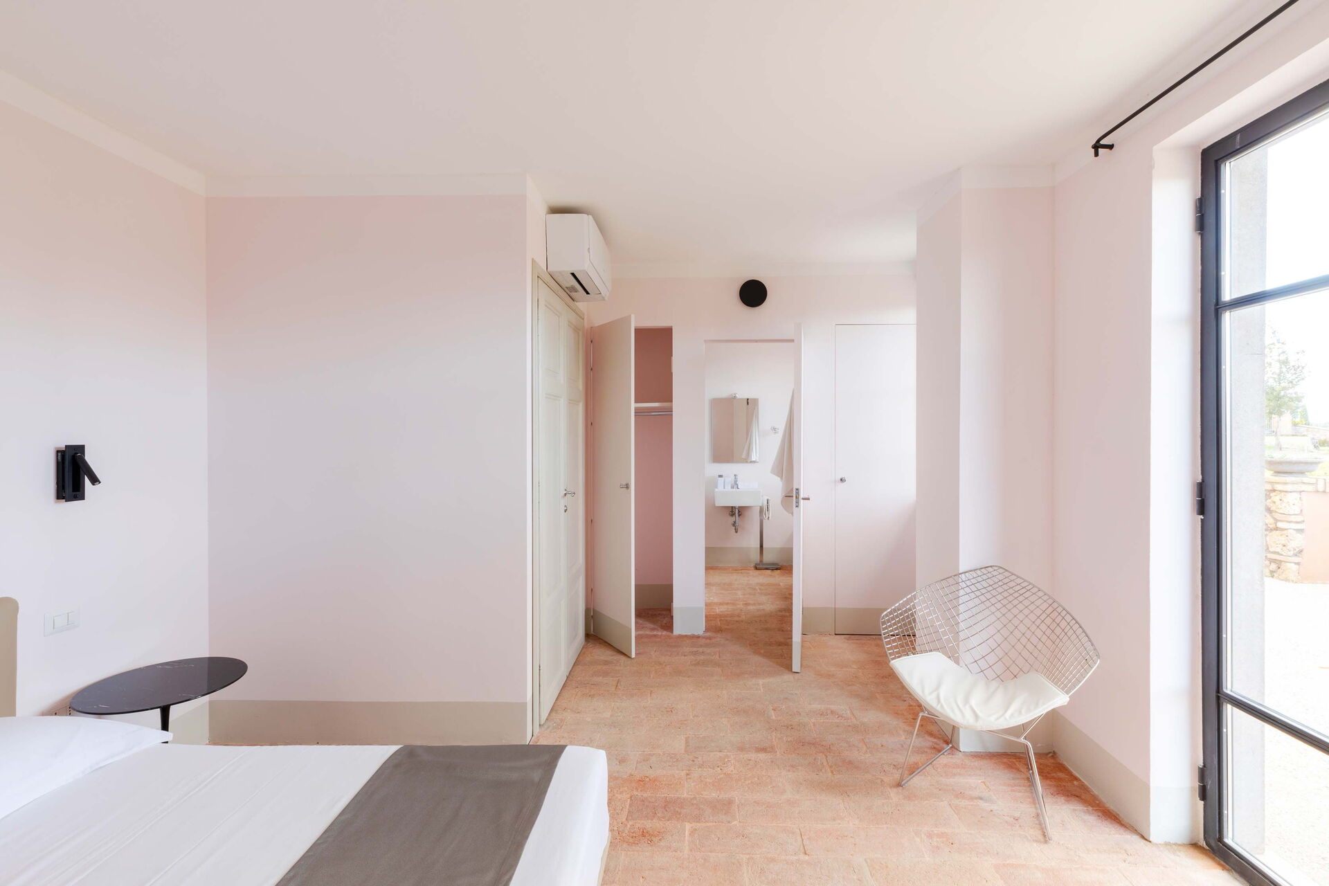Slaapkamer met badkamer 2: tweepersoonsbed, WIFI internet, airconditioning, open haard, wastafel, toilet , bidet, douche, haardroger, uitgang naar het balkon.