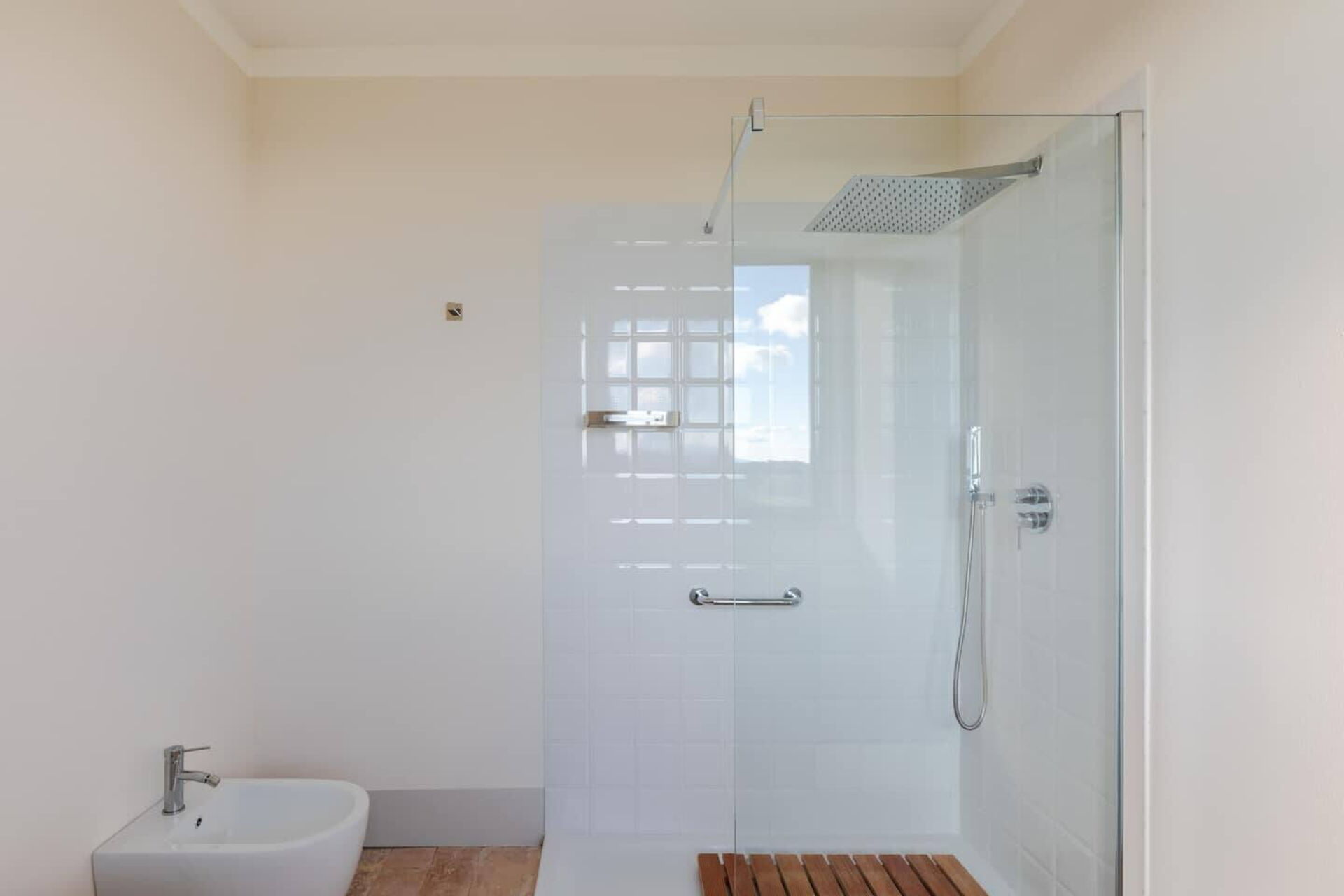 Slaapkamer met badkamer 1: tweepersoonsbed, WIFI internet, airconditioning, wastafel, toilet , bidet, douche, haardroger, uitgang naar het terras.
