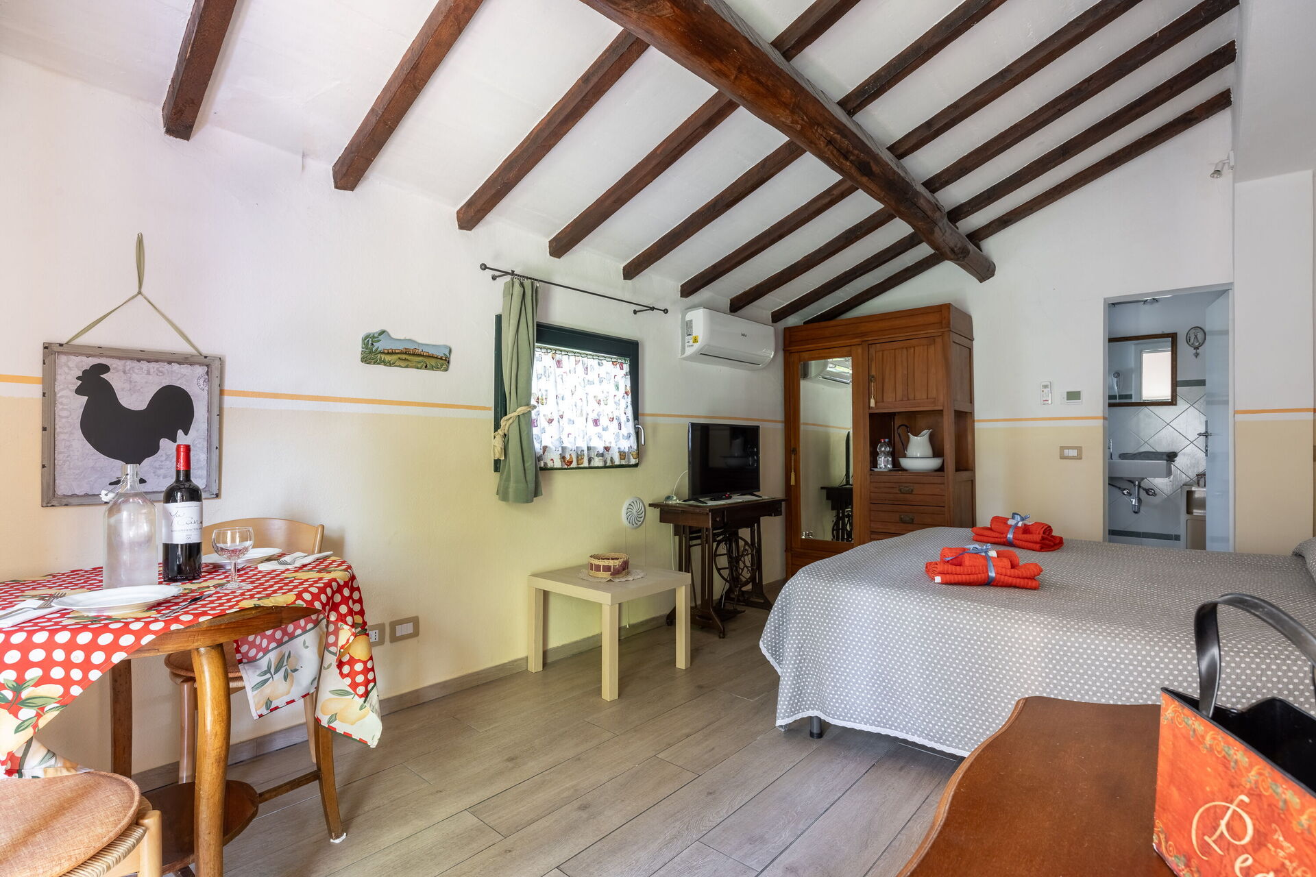 Keuken – woonkamer: goed uitgeruste keuken, eettafel, ijskast, diepvriezer, kookplaat, italiaans koffiezetapparaat, tweepersoonsbed, WIFI internet, airconditioning, tv.