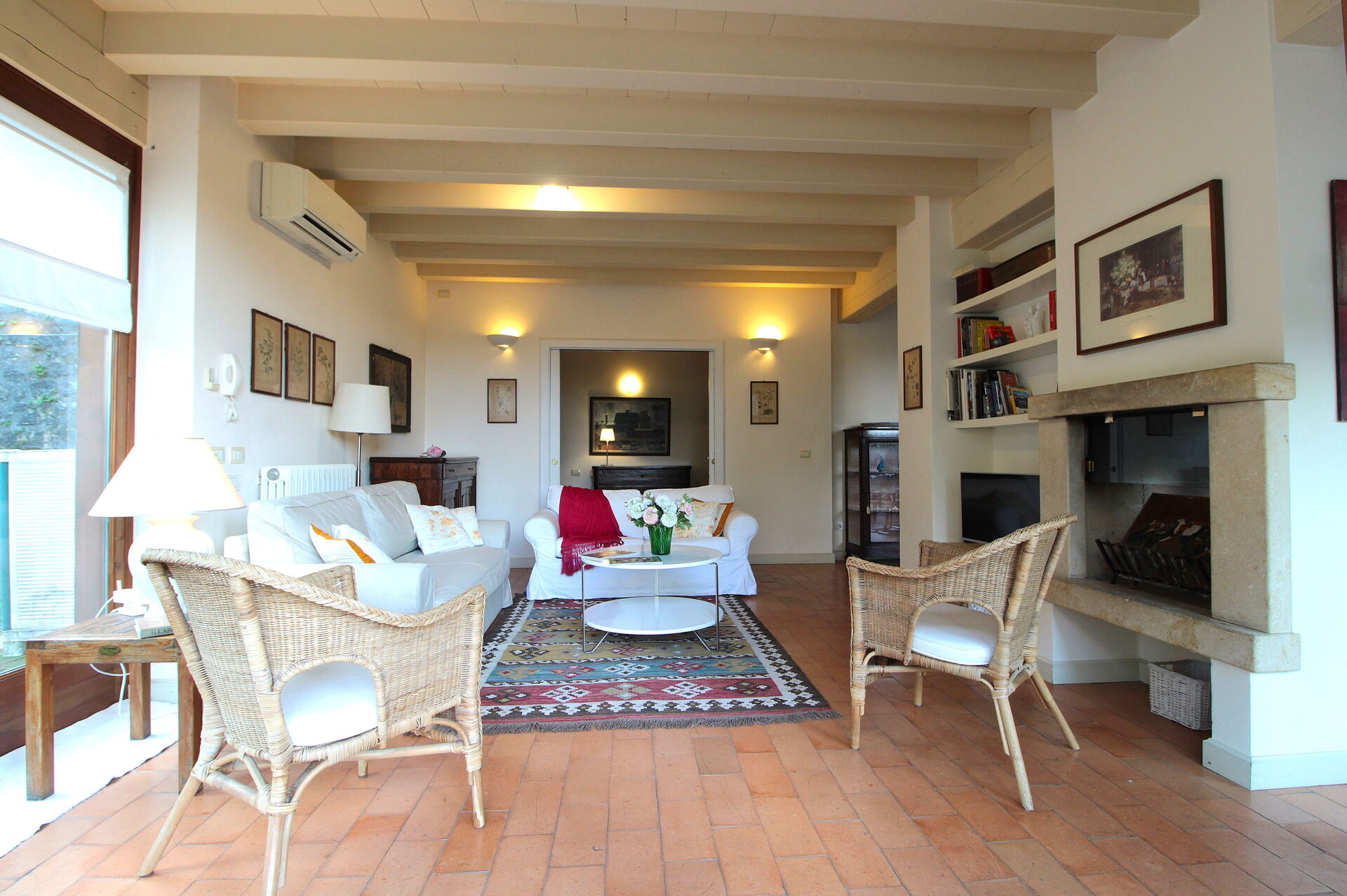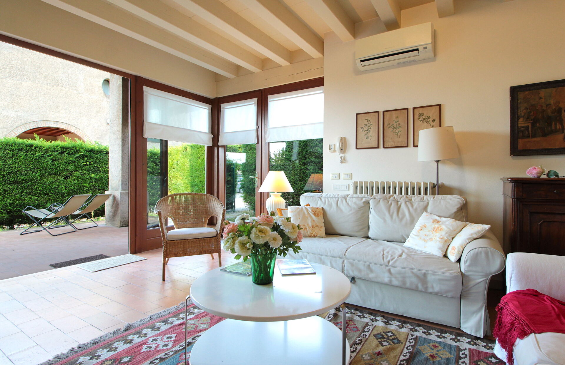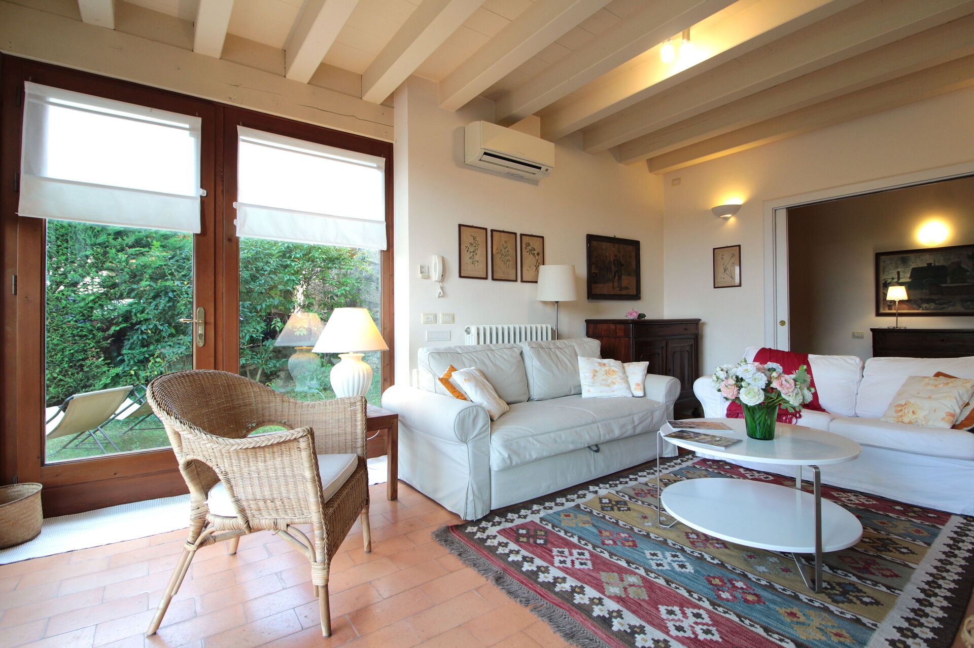 Woonkamer: twee banken, WIFI internet, airconditioning, tv, uitgang naar de tuin.