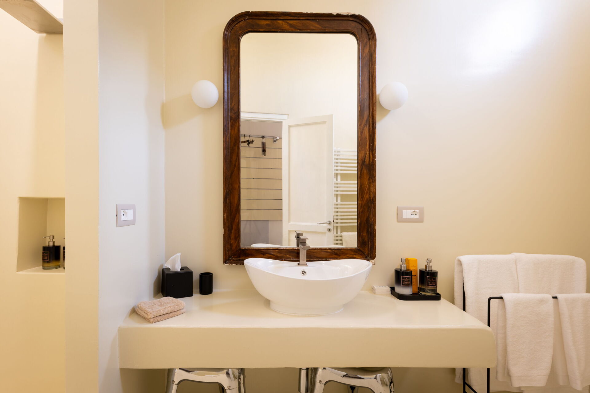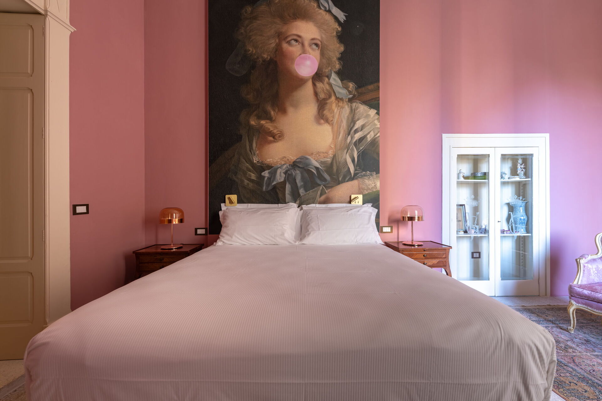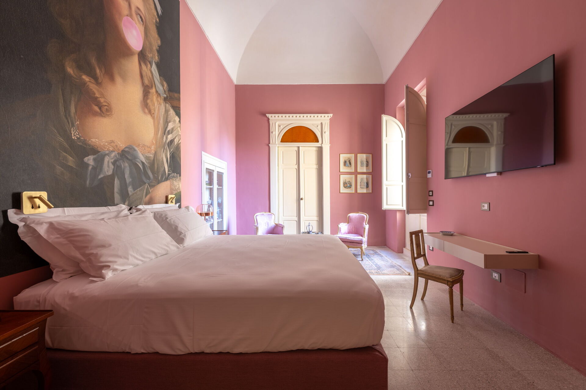 The first floor, the noble part of the building, is divided into two wings. The first includes the Bubble Apartment with two double bedrooms, two bathrooms, a living room with a sofa bed, a fully equipped kitchen overlooking a large living room, dining area, and a terrace. The second offers the Royal Suite with a master bedroom equipped with a Nespresso machine with capsules, kettle, and minibar. The terrace and balcony with panoramic views of the garden are the setting that embraces both the Bubble Apartment and the Suite.