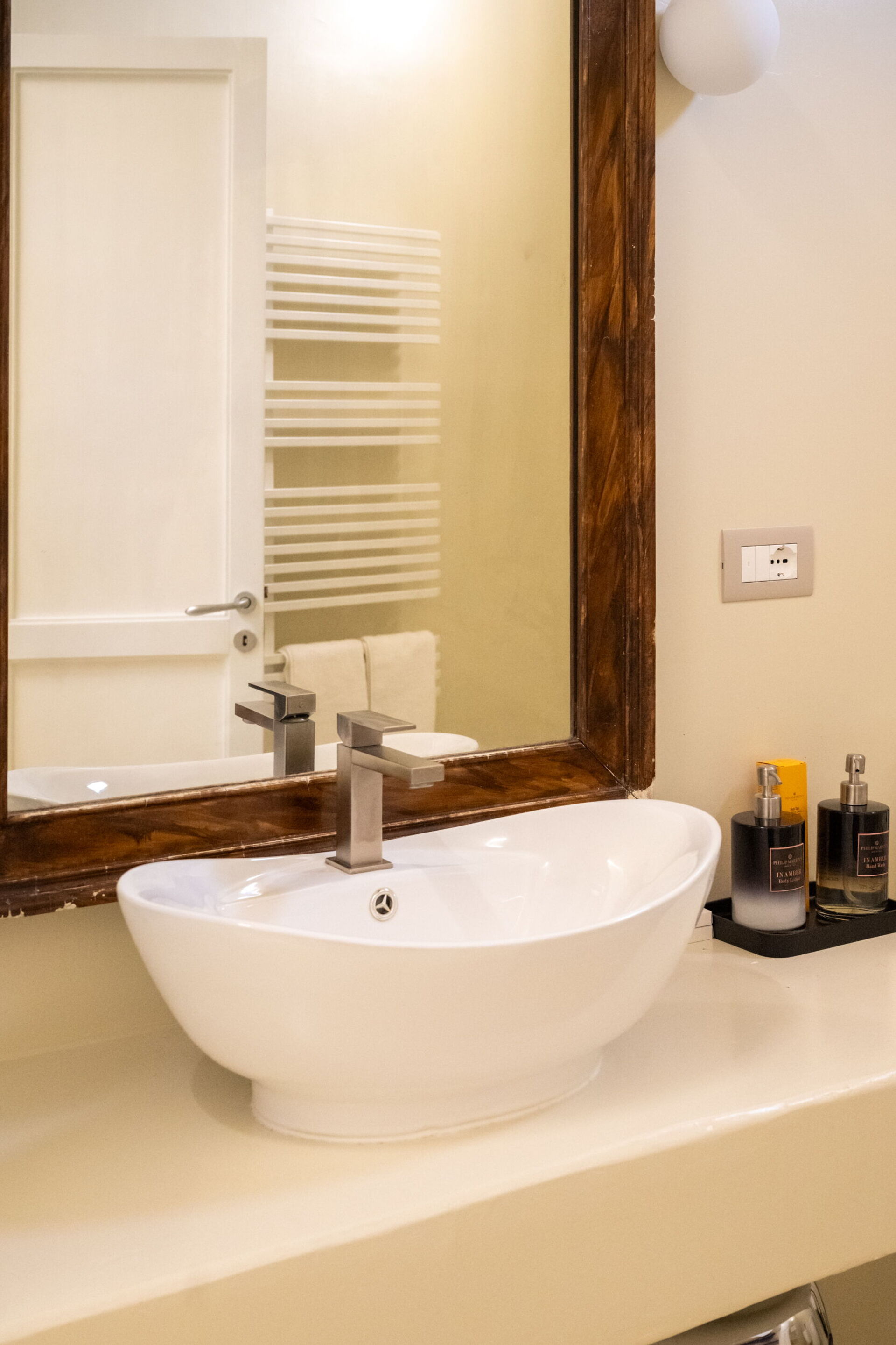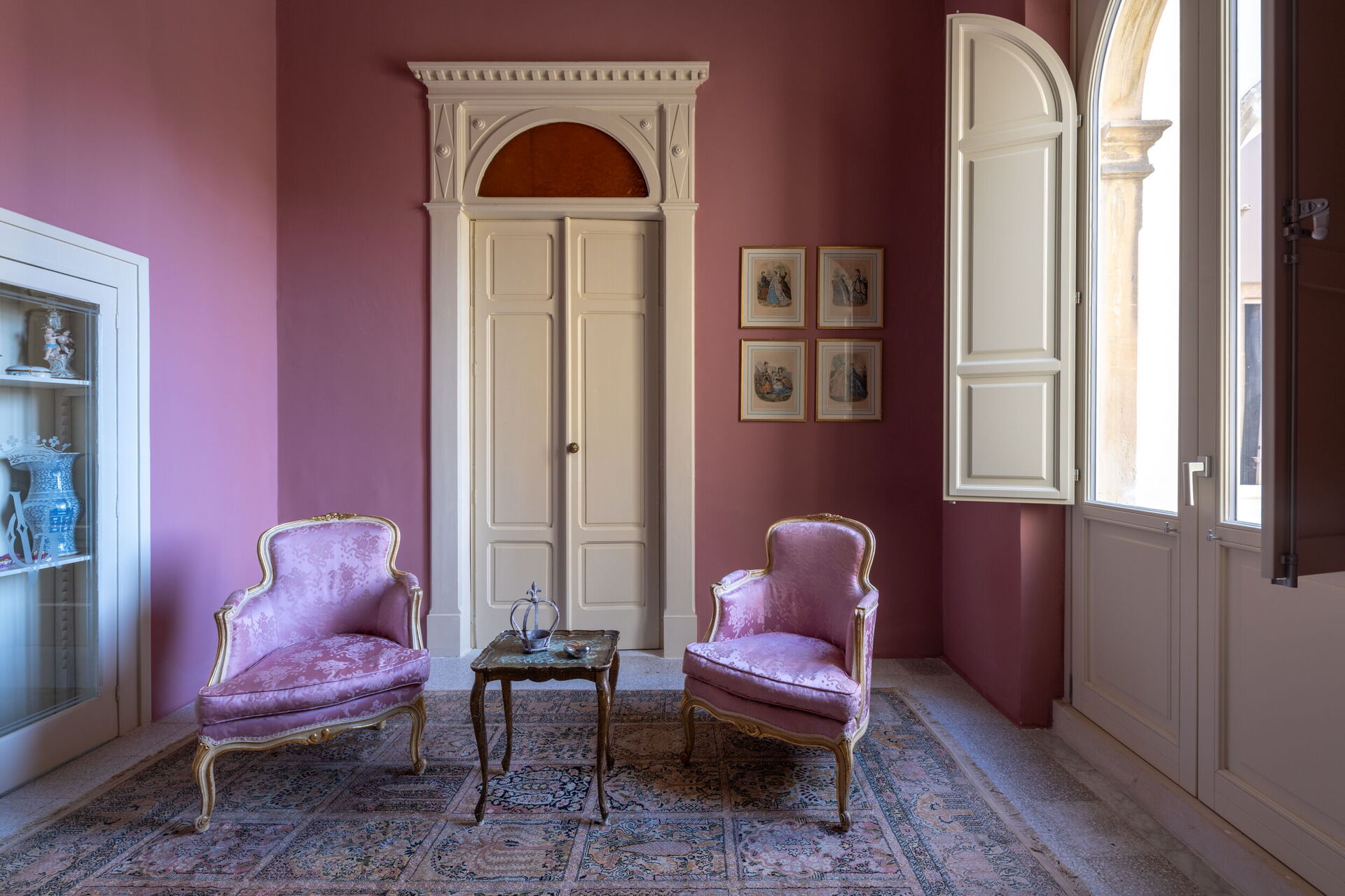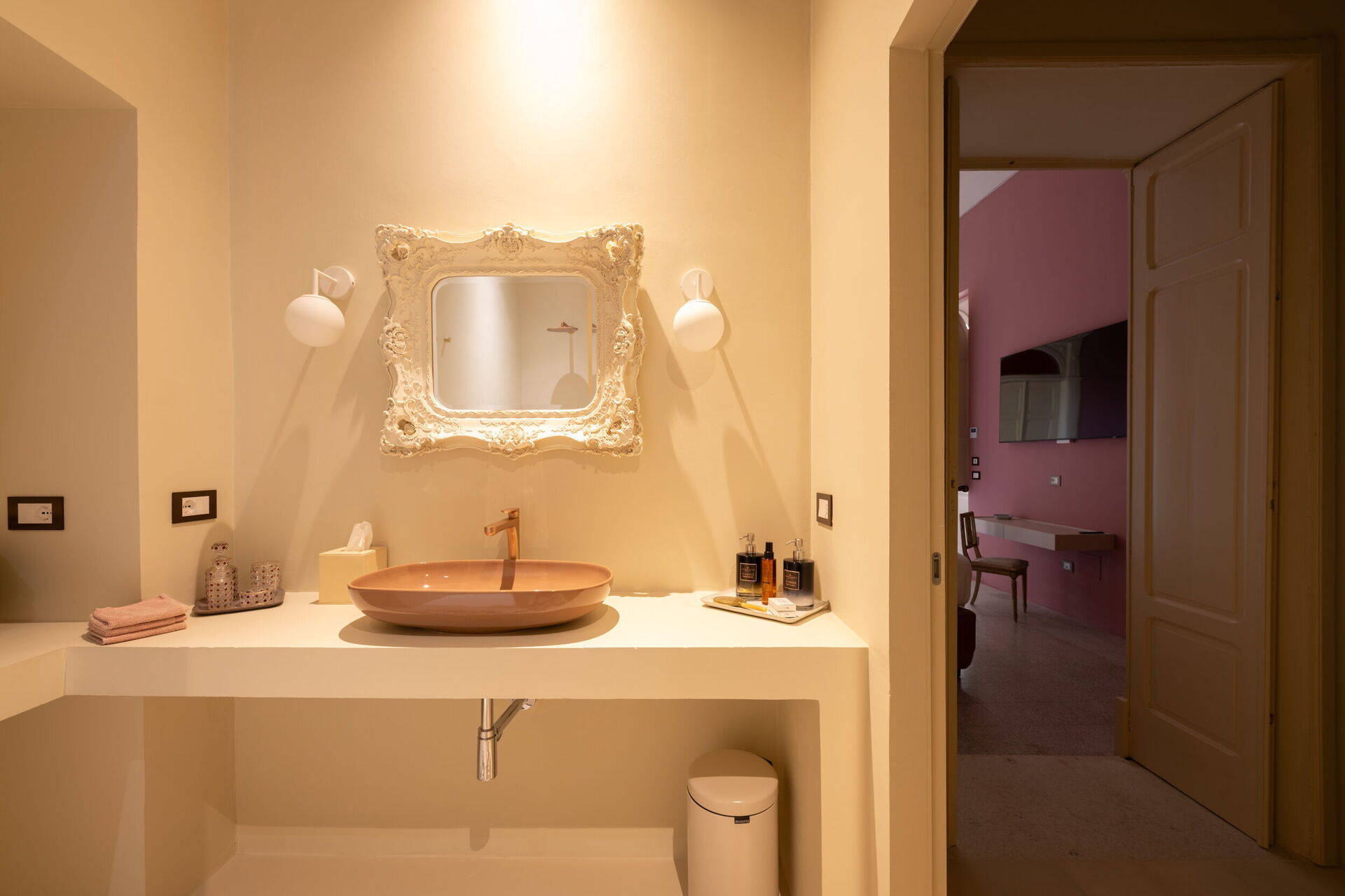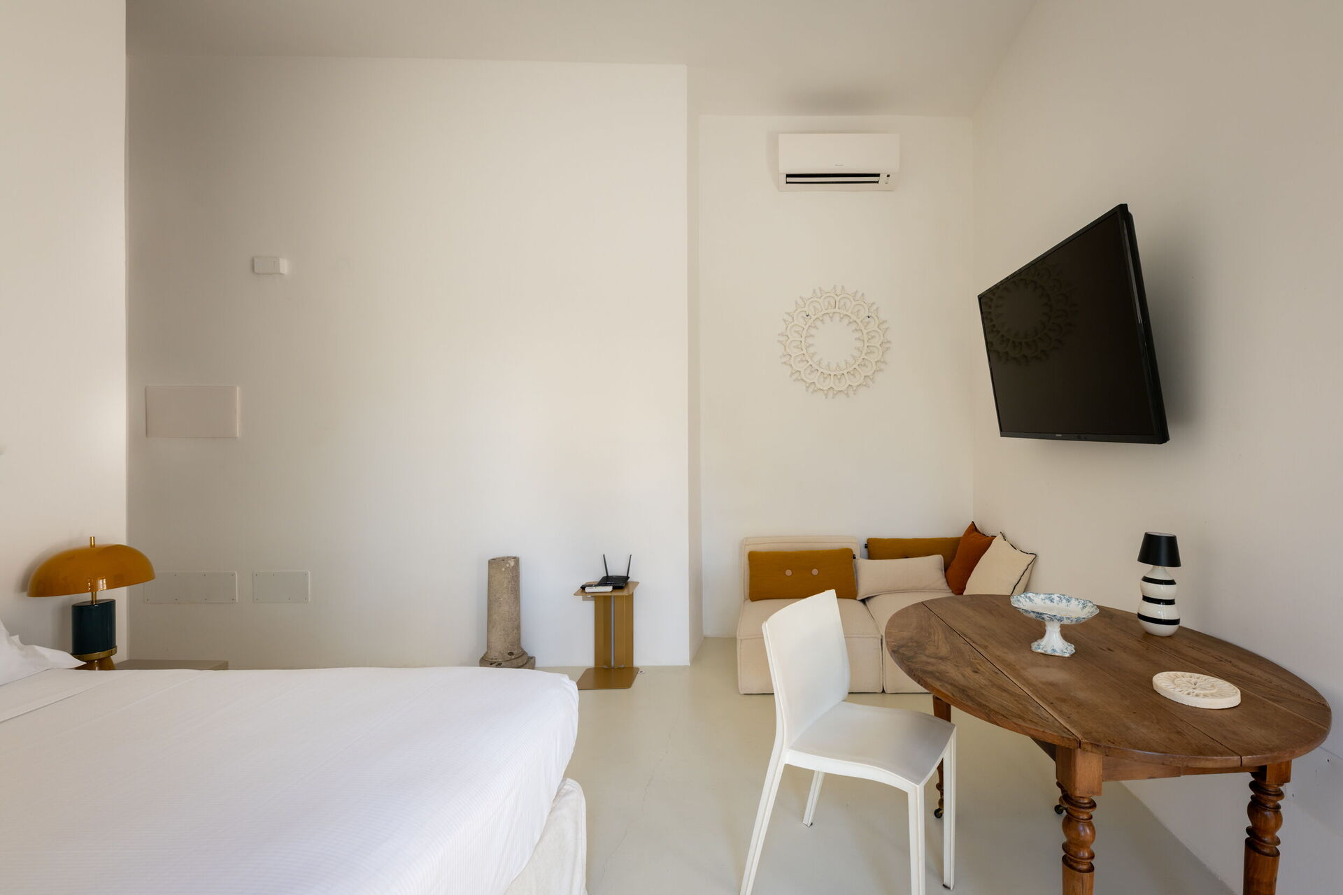 The first floor, the noble part of the building, is divided into two wings. The first includes the Bubble Apartment with two double bedrooms, two bathrooms, a living room with a sofa bed, a fully equipped kitchen overlooking a large living room, dining area, and a terrace. The second offers the Royal Suite with a master bedroom equipped with a Nespresso machine with capsules, kettle, and minibar. The terrace and balcony with panoramic views of the garden are the setting that embraces both the Bubble Apartment and the Suite.