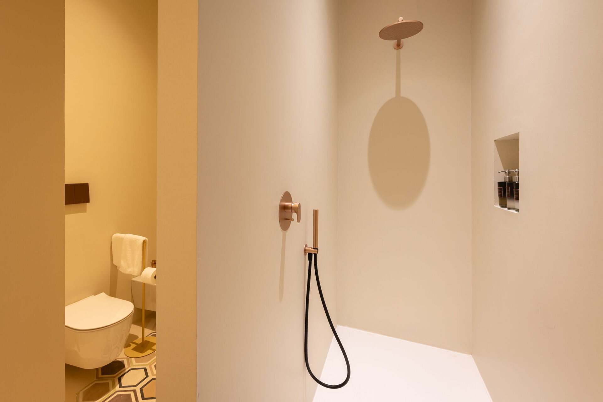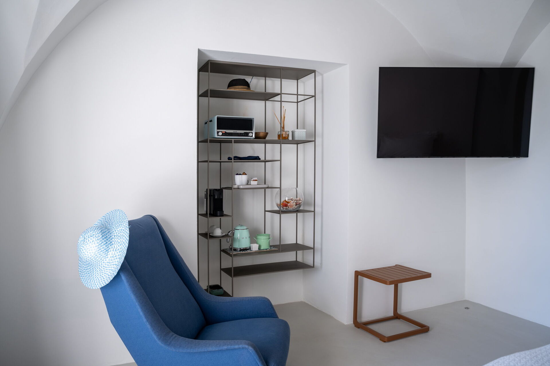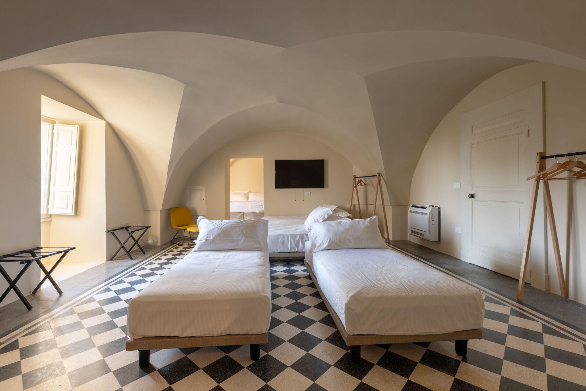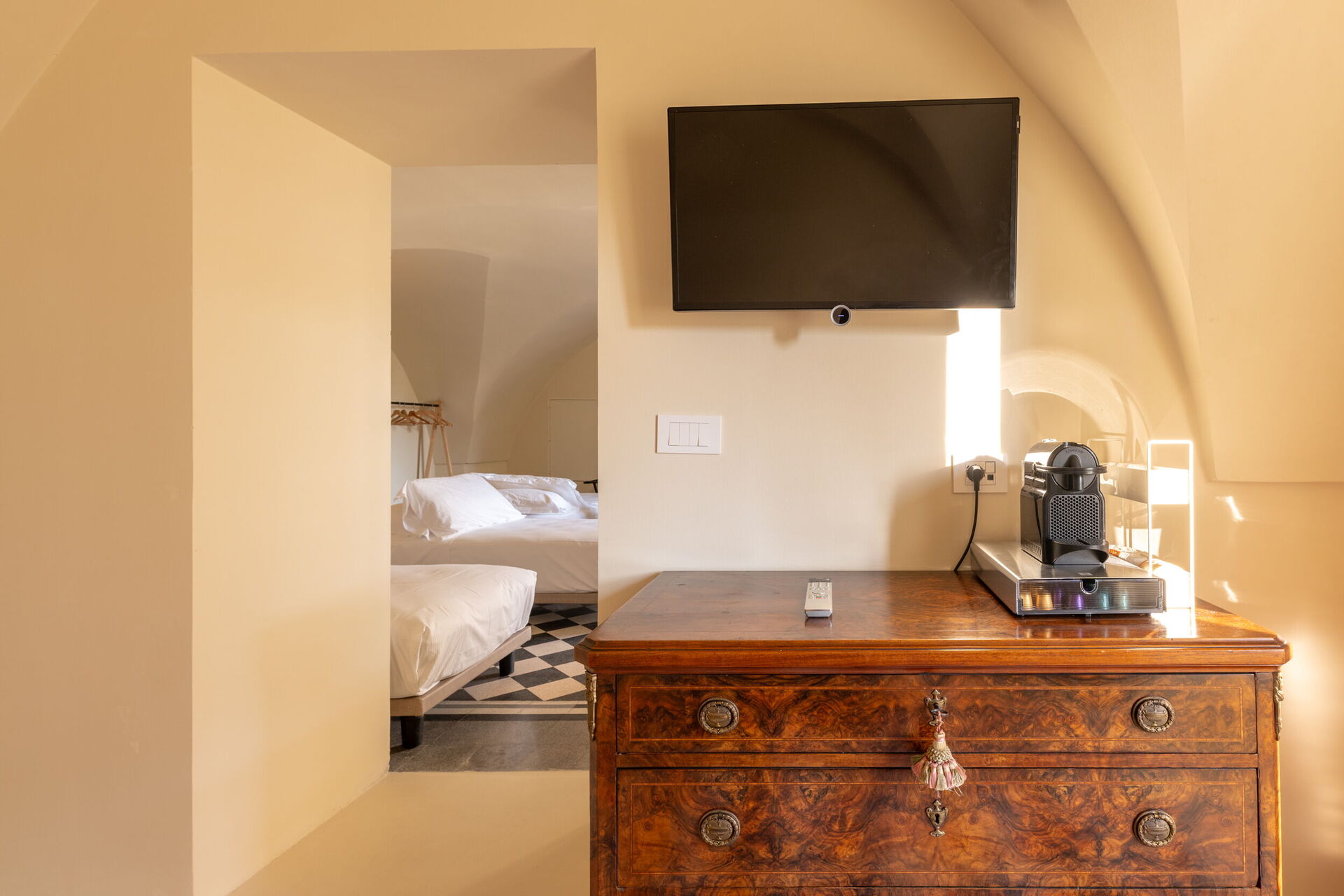 On the mezzanine floor, we find the Family Suite, ideal for up to six adults, with two bedrooms, two bathrooms, and a cozy cinema and games room with a 100-inch screen, 4K projector, and PlayStation 5. Here too, we find a Nespresso machine with capsules, a kettle, and a fridge.