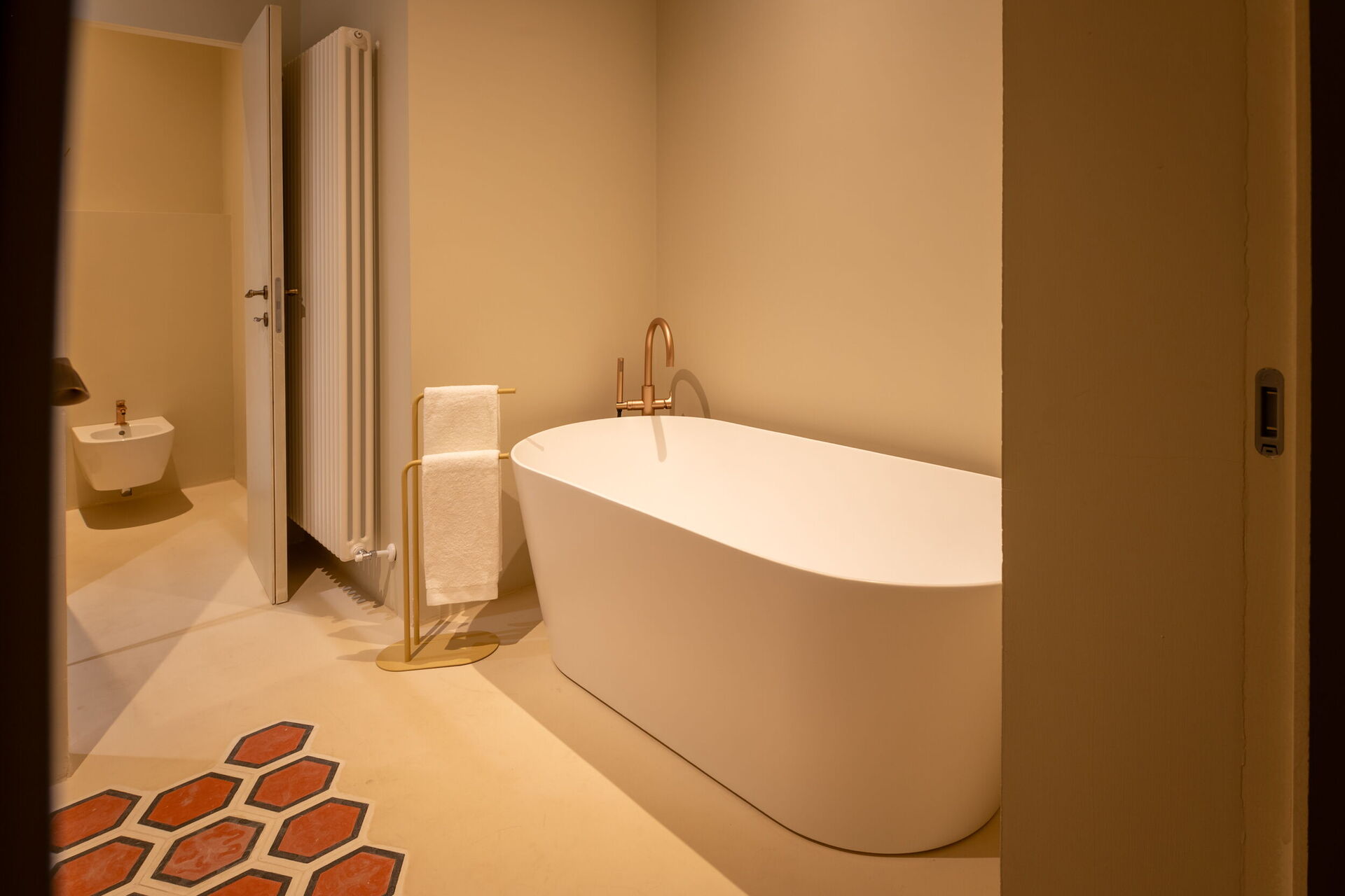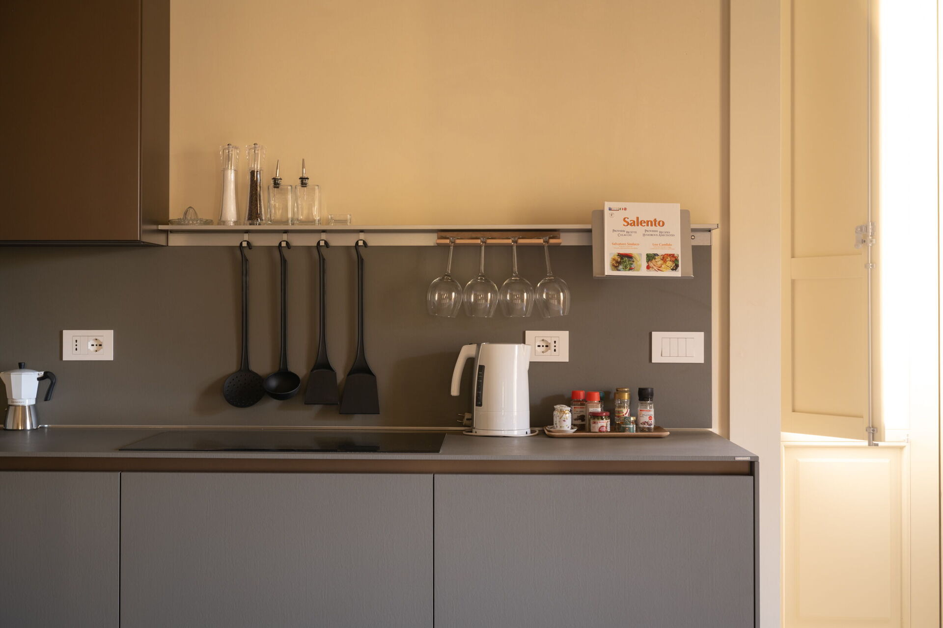 The ground floor offers elegant and functional rooms, including a large kitchen, a beautiful living room with an office area, and a bathroom that can be adapted as a single bedroom. There is also the Garden Suite, overlooking the garden, with a bright and relaxing atmosphere, equipped with a Nespresso machine with capsules, a kettle, and a minibar.