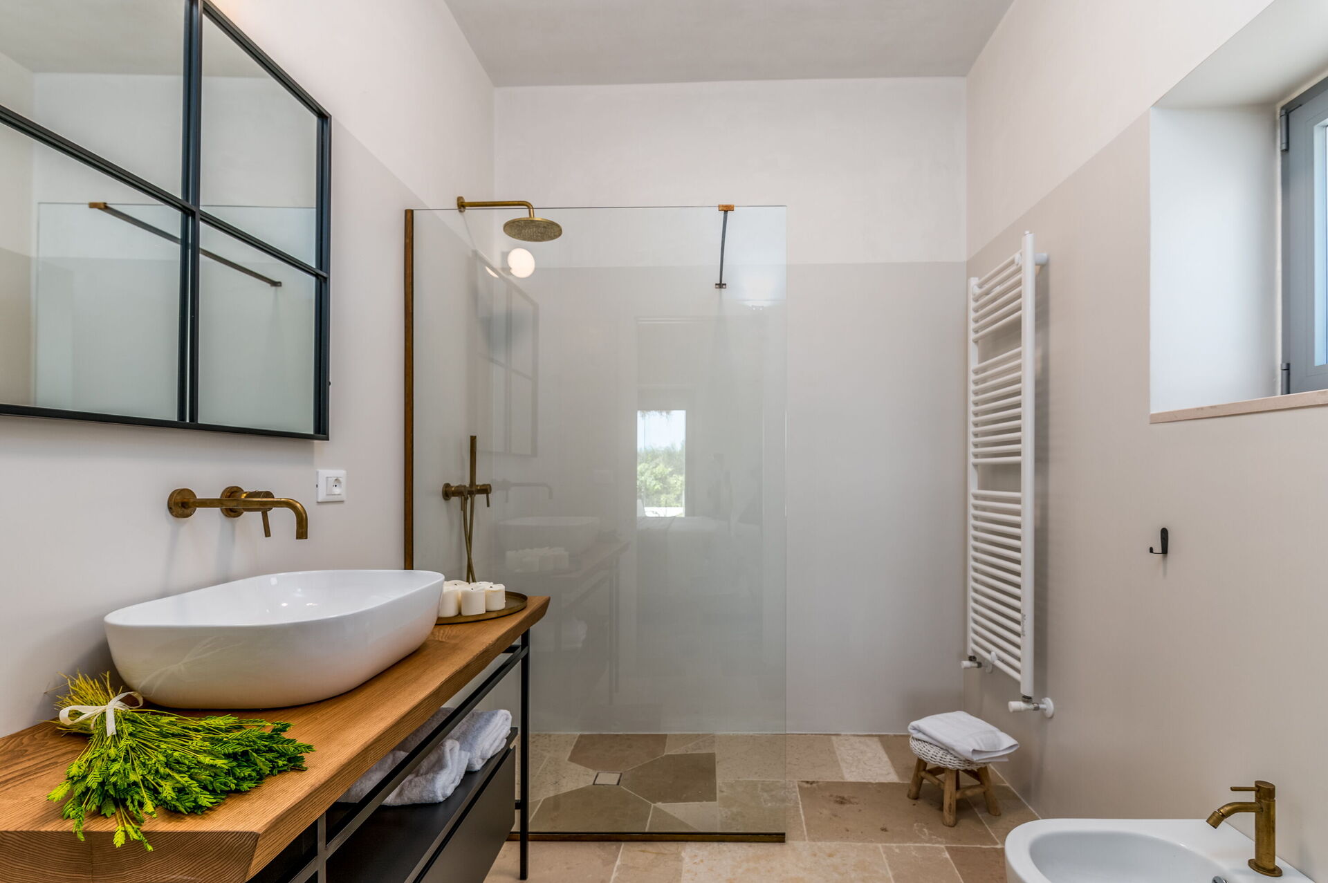 Slaapkamer met badkamer 2: tweepersoonsbed, WIFI internet, airconditioning, satelliet tv, tv, bidet, douche, haardroger, rookmelder, uitgang naar de tuin, uitgang naar de patio.